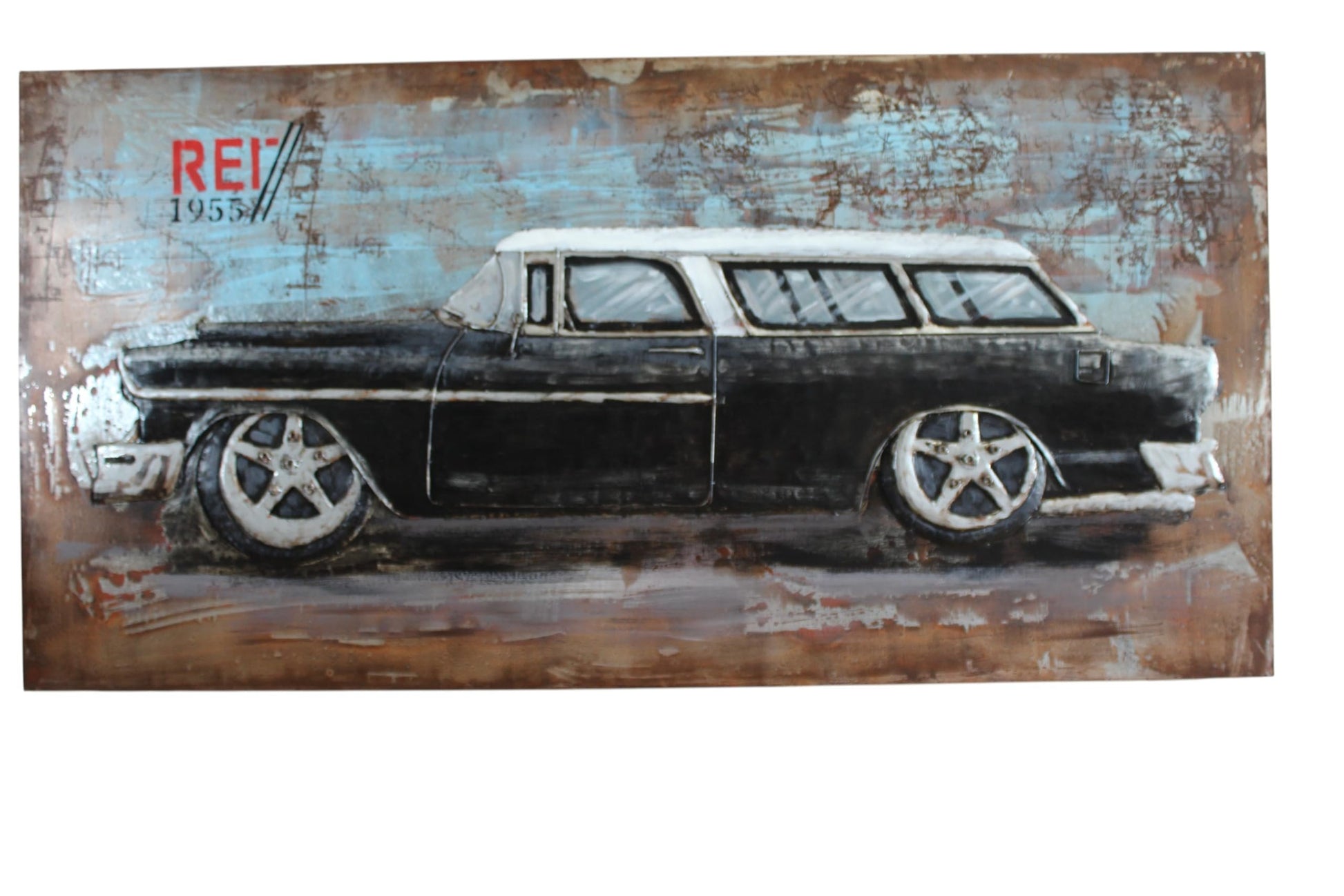 Handcrafted metal wall art with a 3D raised design of the iconic 1955 Chevrolet Nomad station wagon. Each piece is sculpted and painted with rustic textures, showcasing the legendary styling of this classic American car. A standout decor piece for vintage car enthusiasts, man caves, garages, or retro interiors. Size: 79"L x 2"W x 40"H. Weight: 30LbHandcrafted metal wall art depicting the 1955 Chevrolet Nomad3D raised sculpted design for a dimensional lookSculpted and painted with rustic textures for vintage appealRetro statement piece ideal for man caves garages and classic interiorsLarge size 79 in x 2 in x 40 in weighing 30 lb