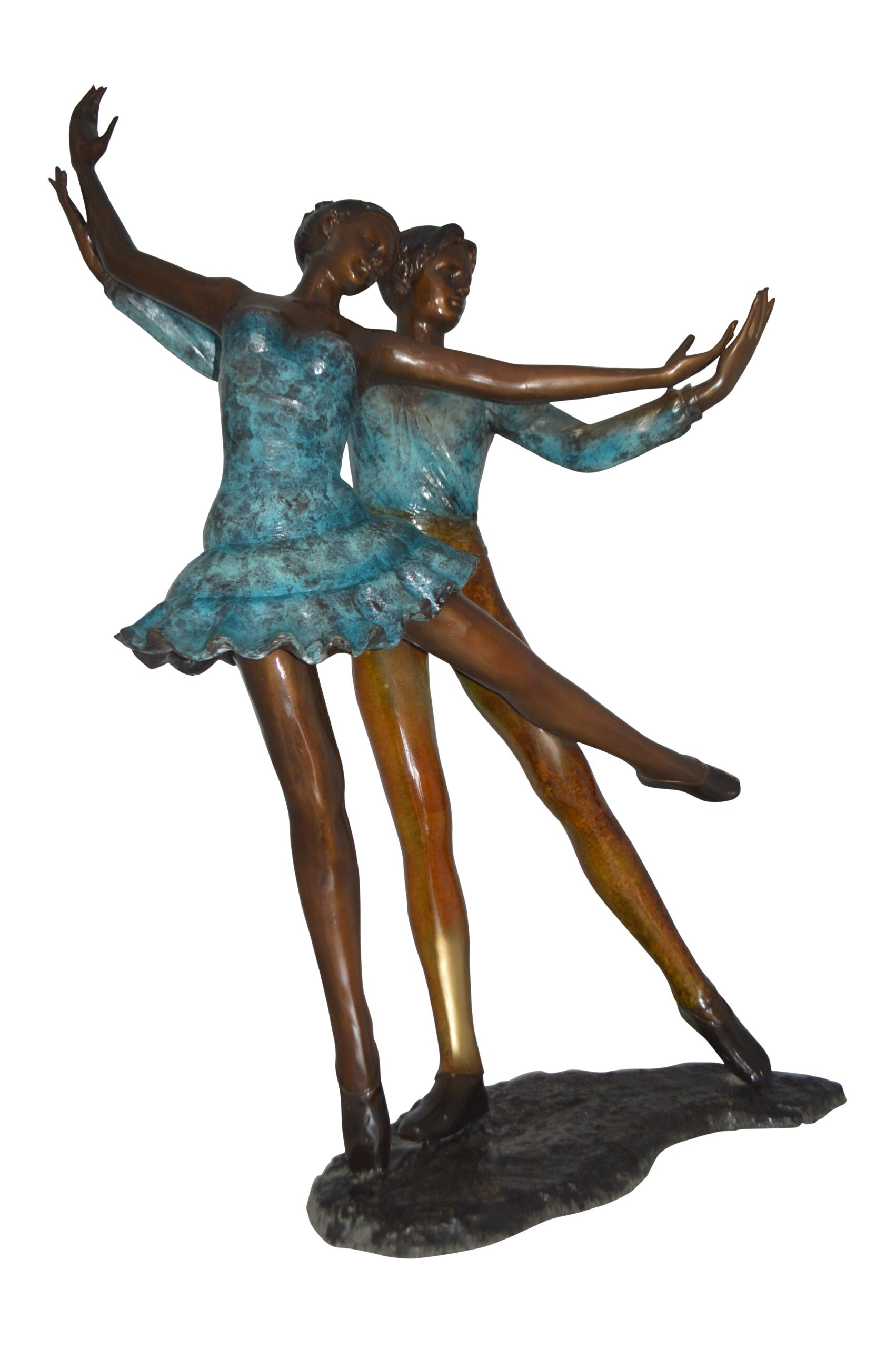 Ballerinas are known for their grace, athleticism, and beauty. All of these components are captured in this beautiful bronze statue of a couple ballerina dancers. Our impressive, 360-degree, large scale Ballerina statue is expertly finished with a hand-applied, classic bronze patina accented by an antiqued colored patinas applied in Polychrome techniques also referred to as enameling over bronze which brings out the amazing detail Size: 21"L x 38"W x 57"H. Weight is: 88Lb
