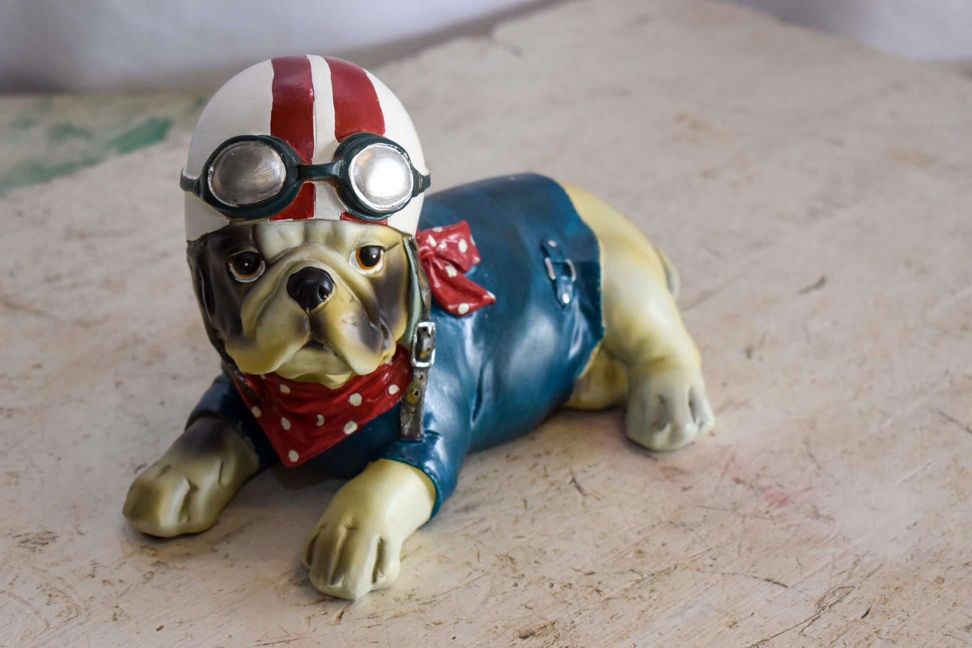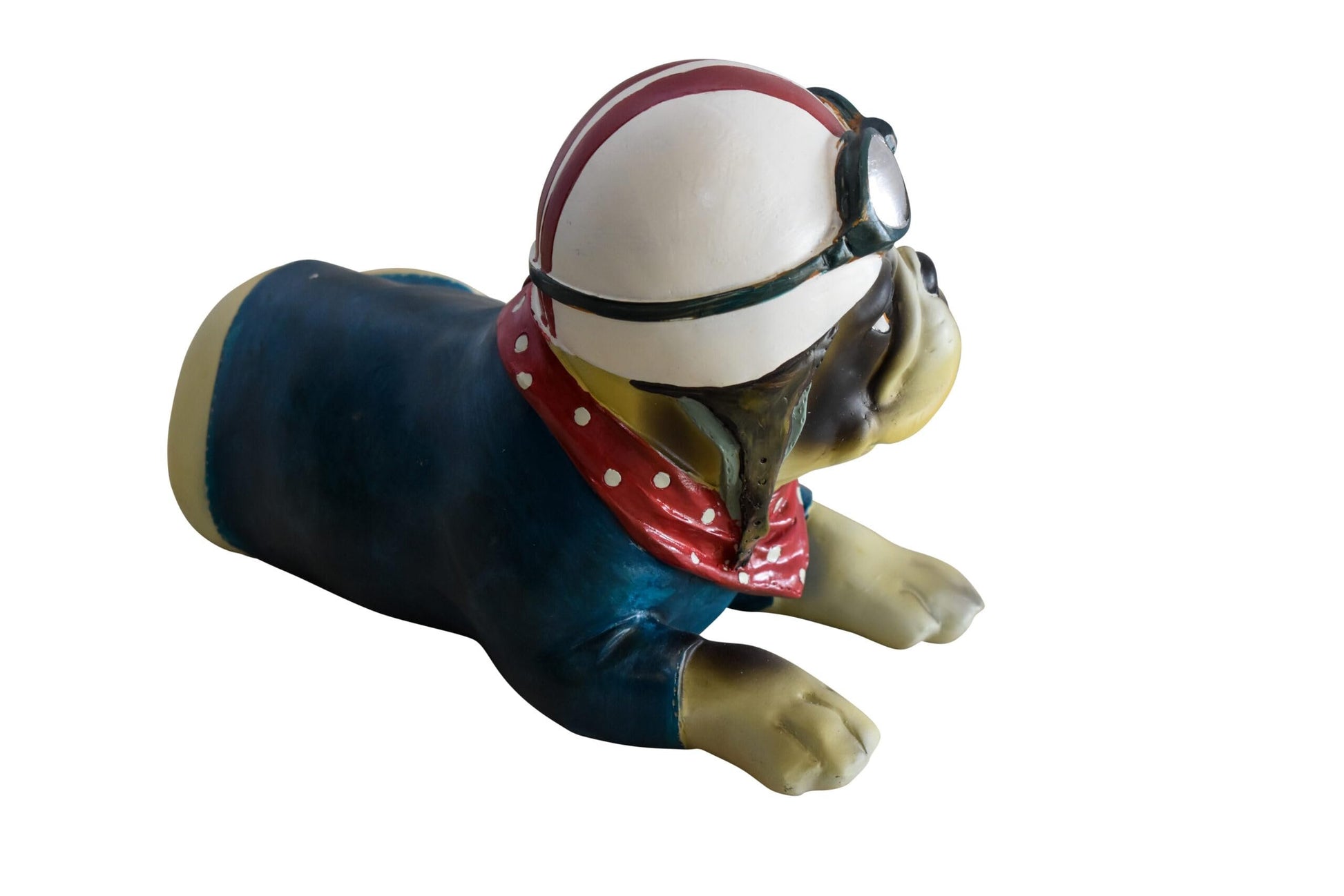 This happy dog is dressed in a biker suit with glasses and a helmet resin statue. There are many elements in this piece that make it an ideal addition to a room, office, or home. The colors and pattern of the statue make it add vibrancy, happiness, and beauty to any space. Size: 9"L x 6"W x 7"H. Weight is: 2Lb