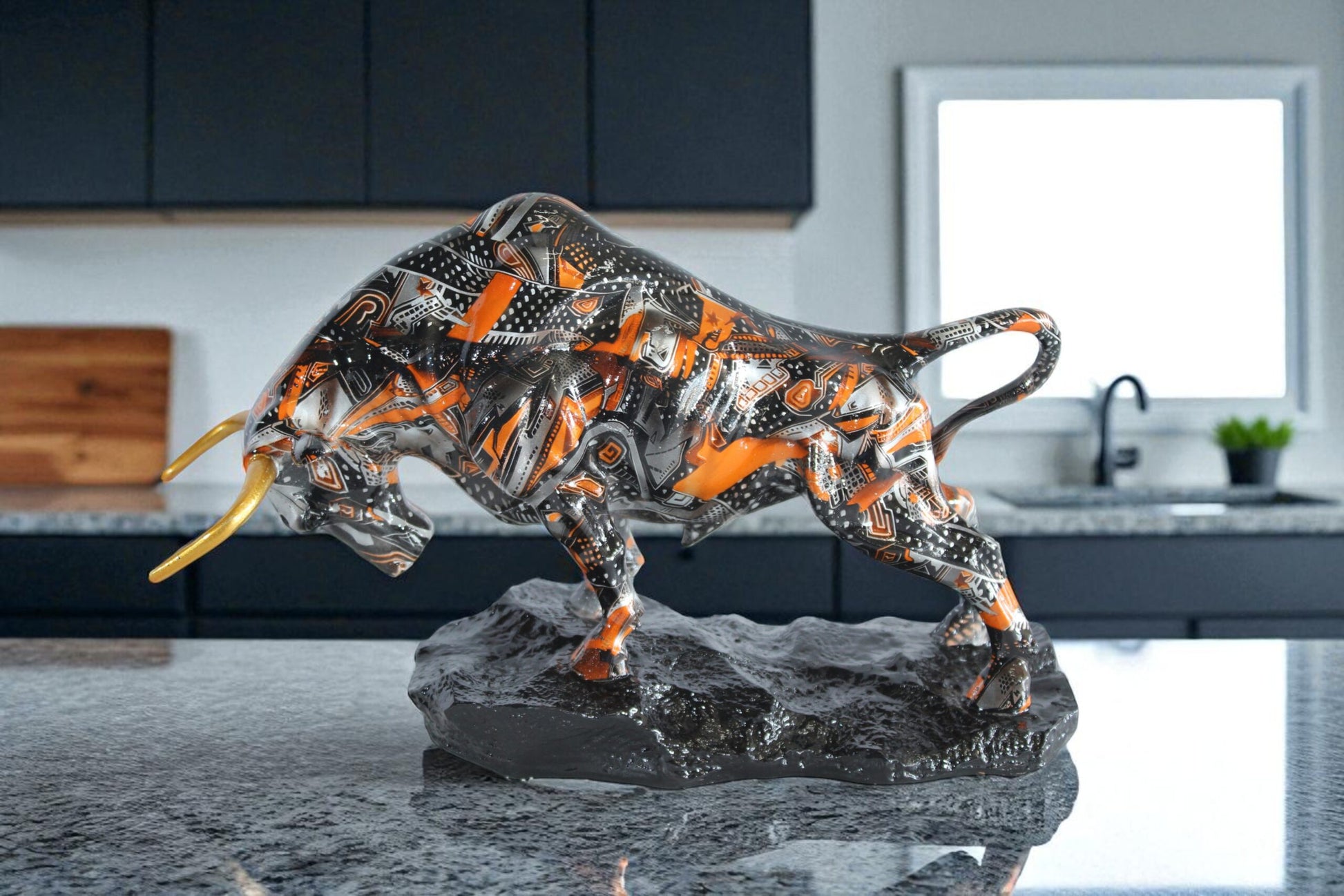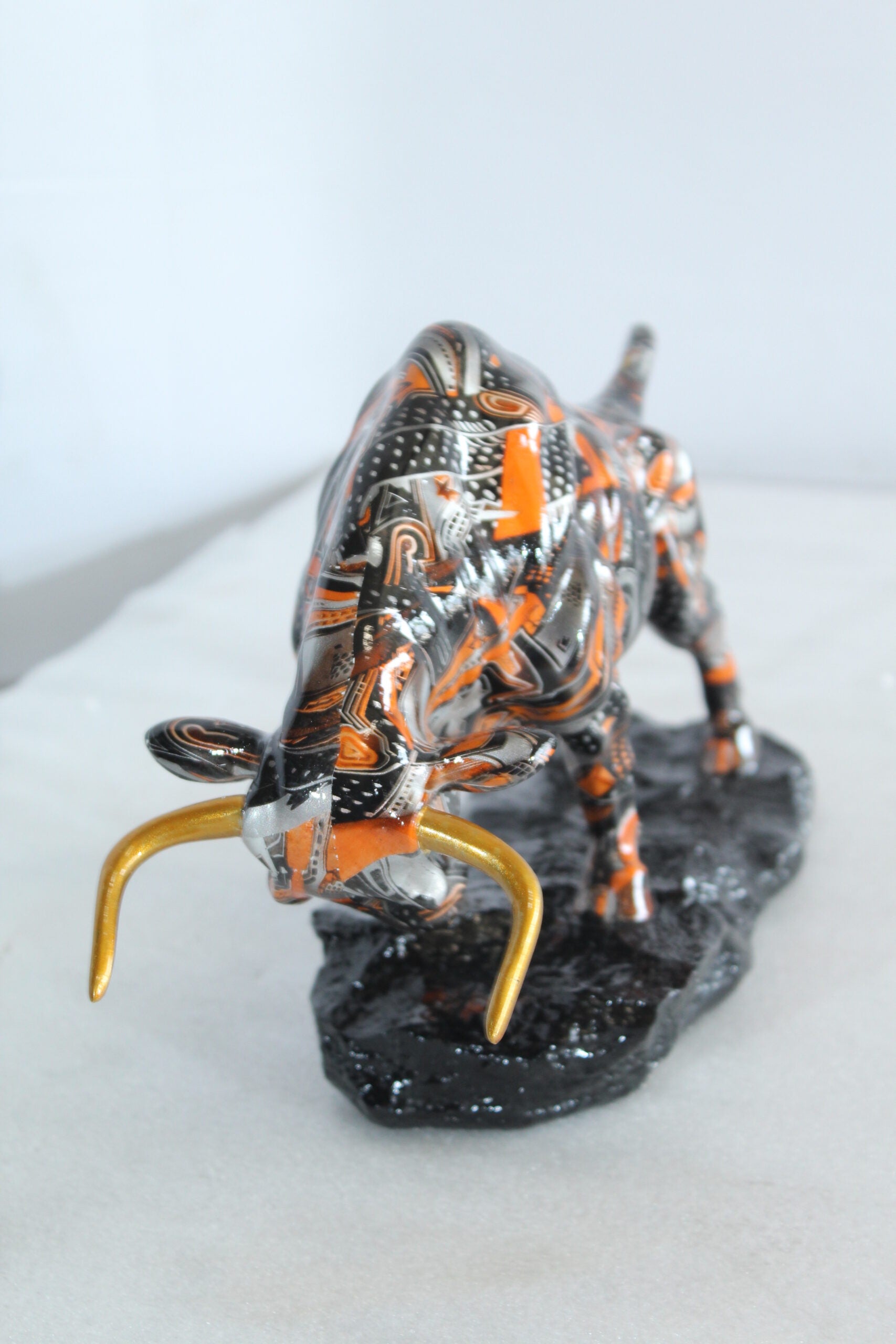 This bold resin bull statue features a striking abstract pattern in vivid orange, black, and metallic accents, making it a standout piece for any modern decor. Set on a textured black base, the dynamic pose symbolizes power and momentum—perfect for offices, dens, or contemporary spaces. Made of durable resin with a high-gloss finish. A unique gift for art lovers and market bulls alike. Size: 14"L x 4"W x 9"H. Weight: 2Lb