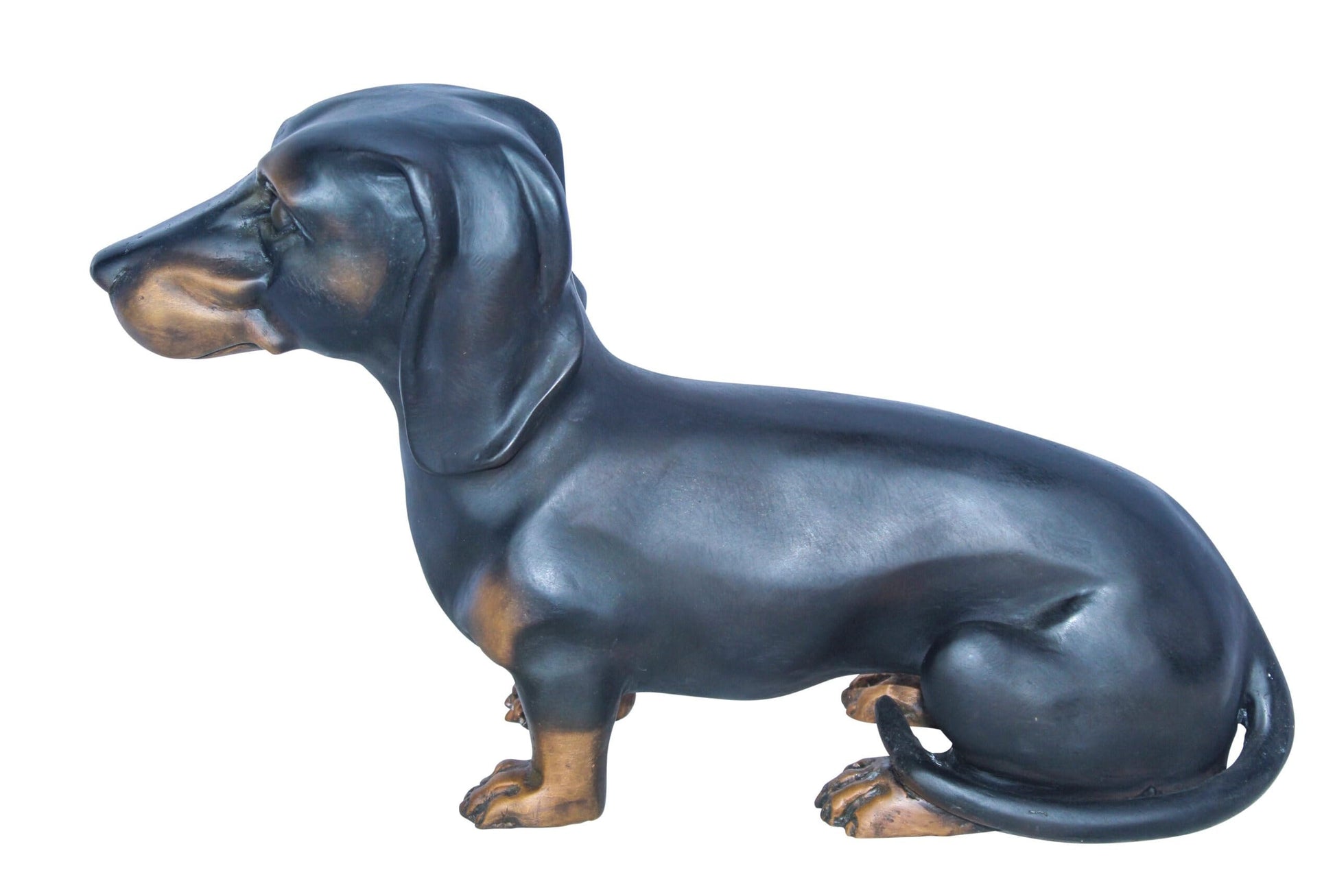 Adorable dachshund dog sitting bronze statue, handcrafted and casted using traditional lost wax method. This charming piece captures the essence of the beloved dachshund breed with meticulous craftsmanship, making it a delightful addition to any dog lover collection or decor scheme. Size: 17"L x 5"W x 10"H. Weight: 11Lb