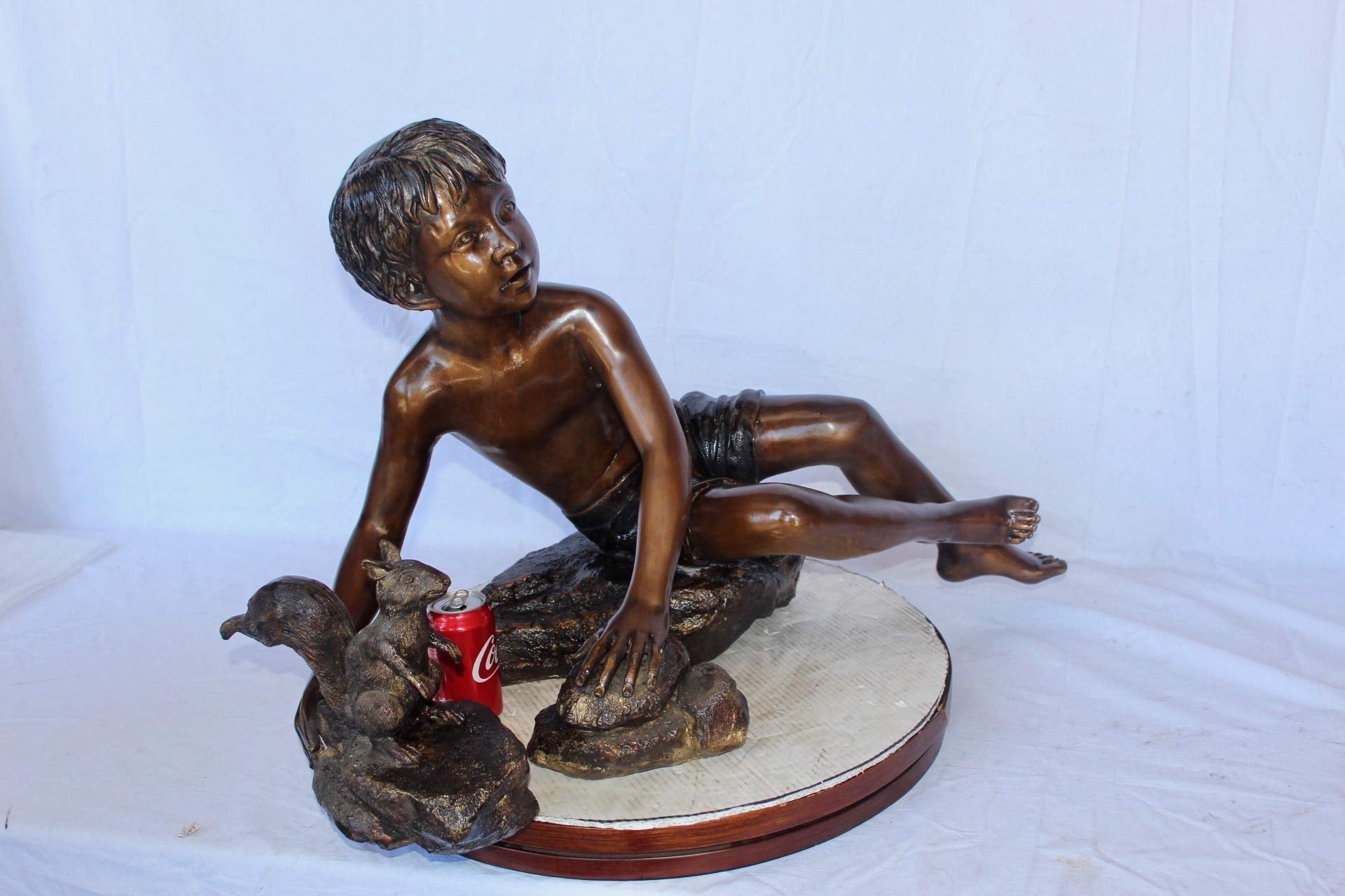 The large bronze statue illustrated a real-life situation of a young boy enjoying the outdoors. Perched on rocks with a squirrel companion alongside him, this pleasant piece would fit well in anyone's home or space. The detail in his face and body makes it a worthy purchase for anyone seeking a piece of this kind. Size: 36"L x 18"W x 22"H. Weight is: 32Lb