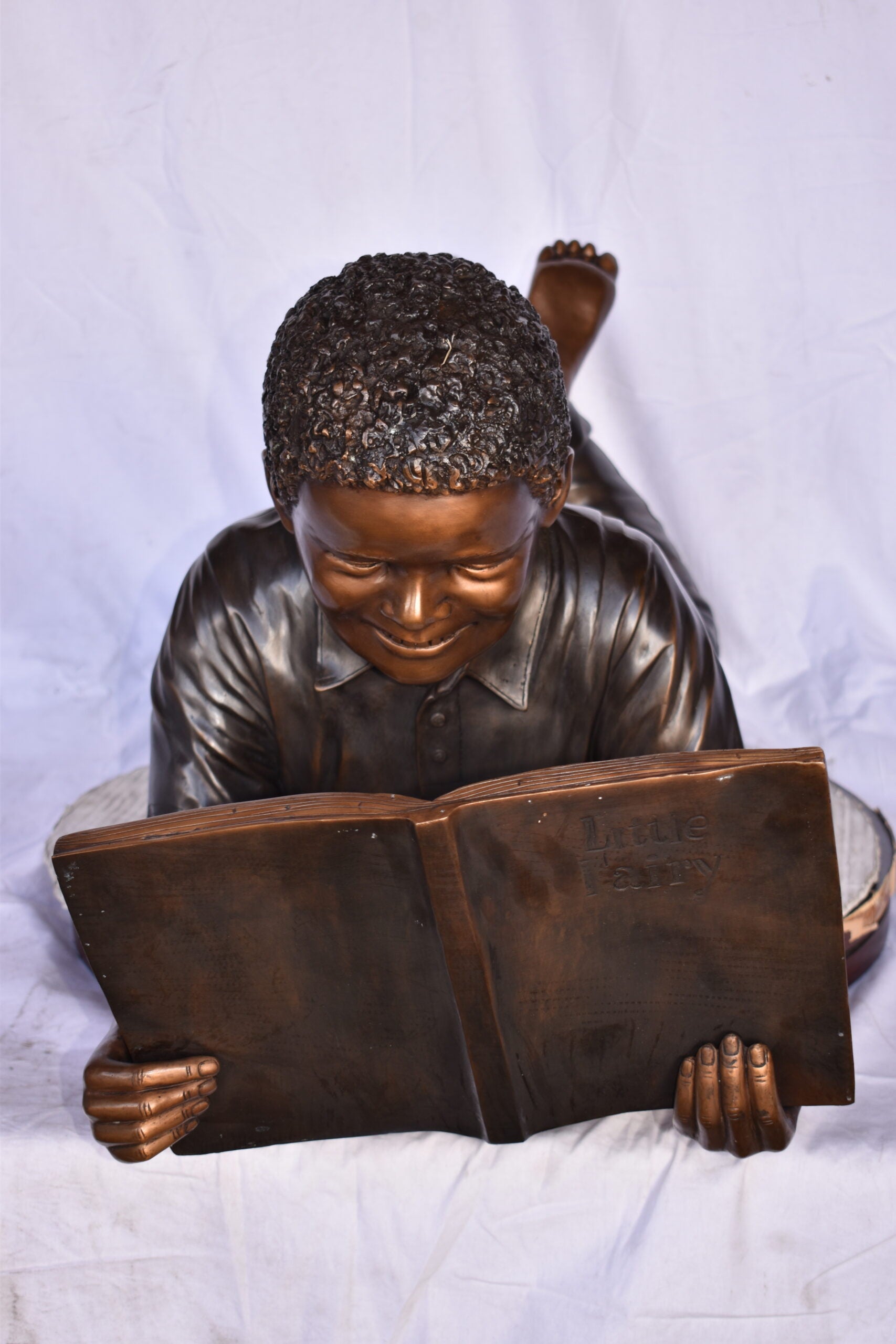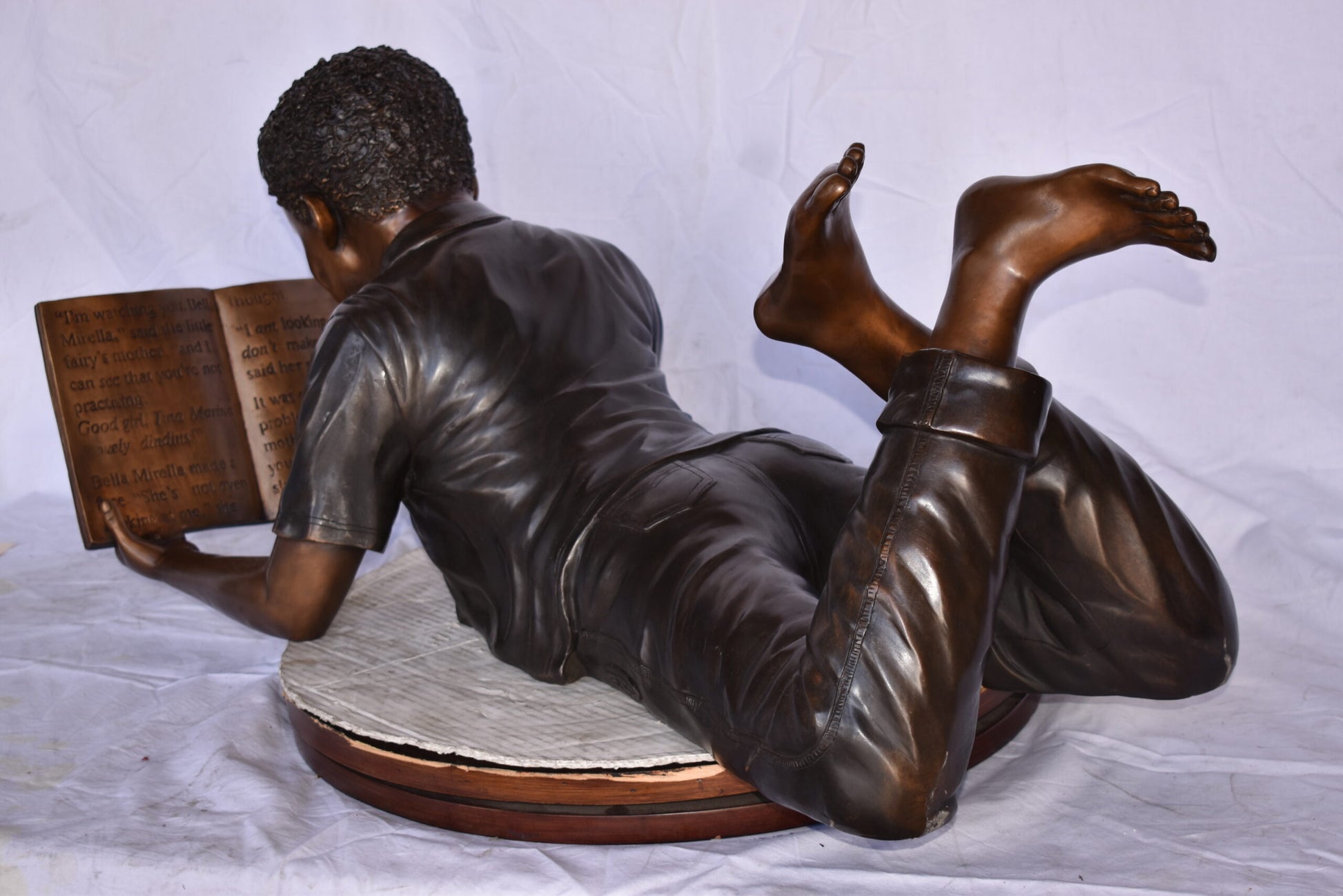 Magnificent large size bronze statue of an African American Boy outside laying on the ground and reading a book. The joy of youth, lost in a book and putting thoughts to paper, will make your landscape come alive. The sculpture tones are finished in a lacquer patina on a heavy bronze base. This bronze statue is museum quality, hand-cast in high-quality pure bronze using the Lost Wax Process of bronze casting. This bronze statue would look adorable in any space of the home of any classic art and nature lover. Size: 42"L x 15"W x 19"H. Weight is: 63Lb