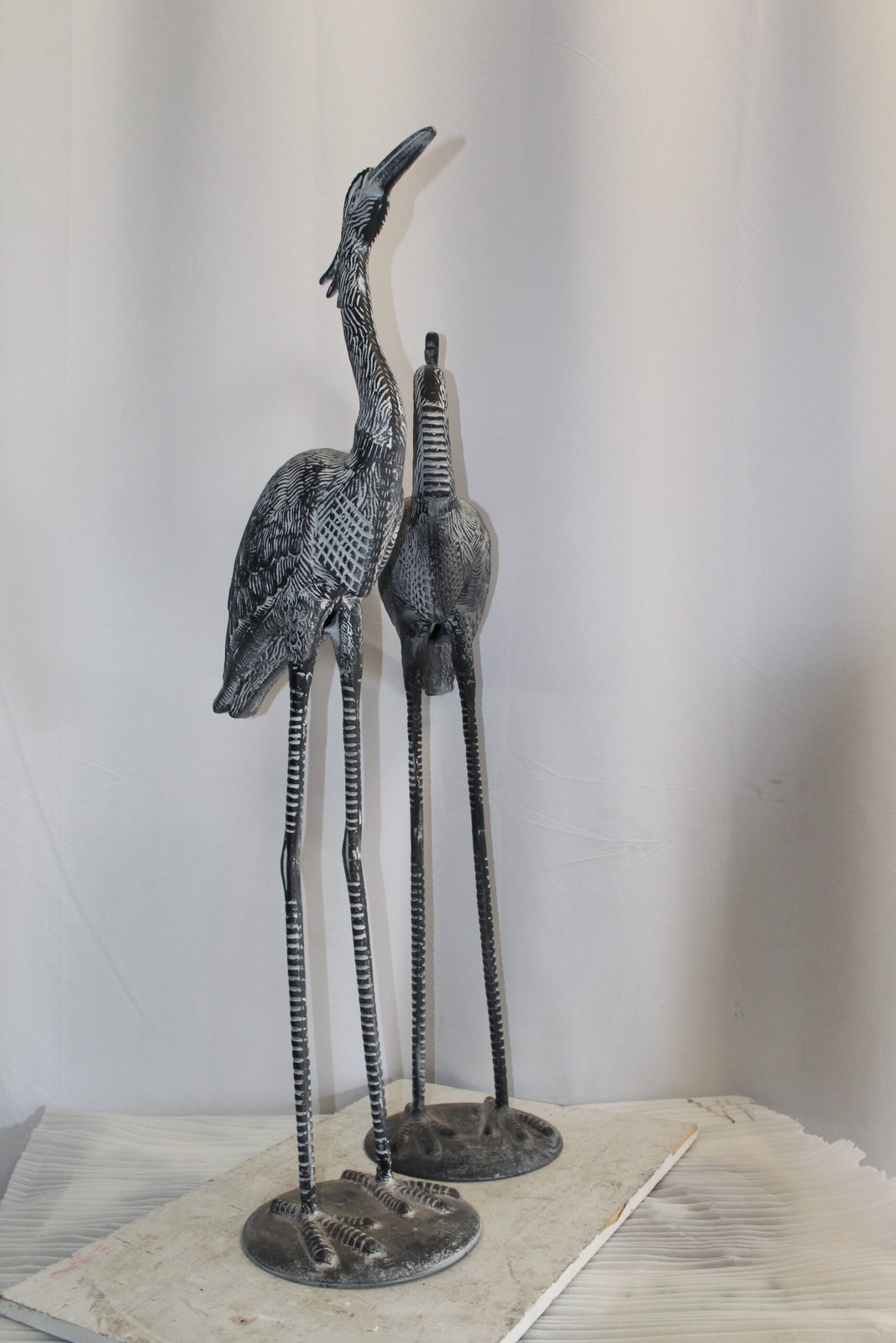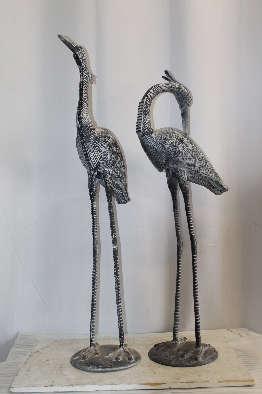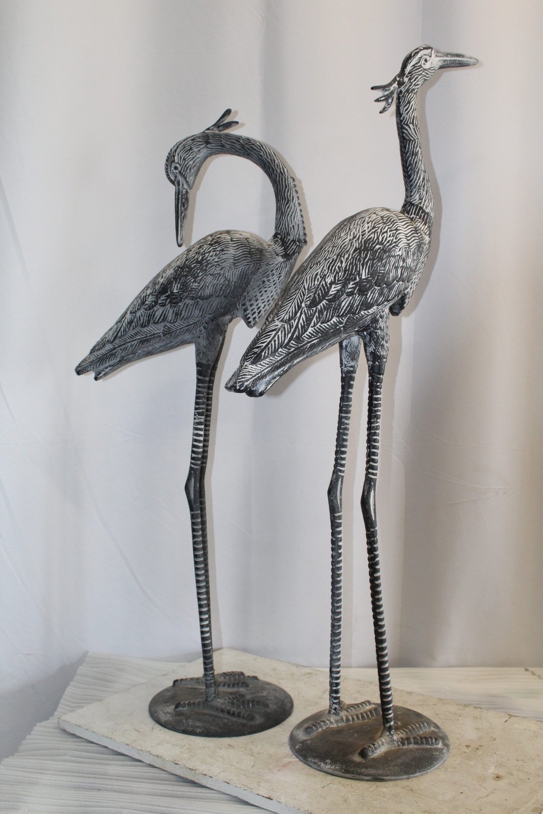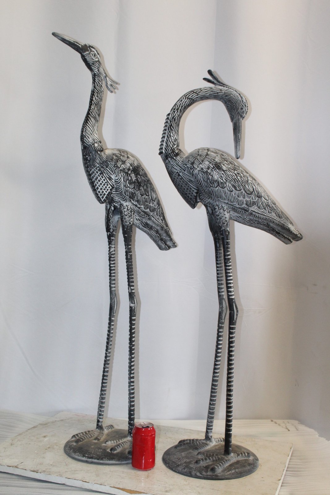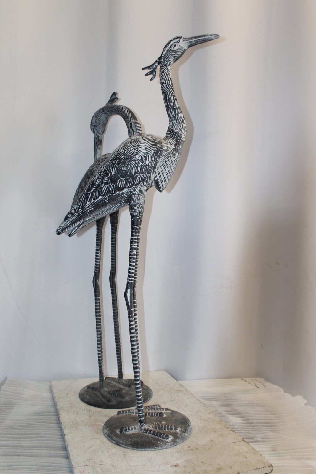 Elegant pair of decorative cranes crafted from aluminum. Handcrafted with care, adds sophistication to any space. Perfect as a home accent or garden decoration. Durable casting ensures lasting beauty. Size: 26"L x 11"W x 48"H. Weight is: 28Lb