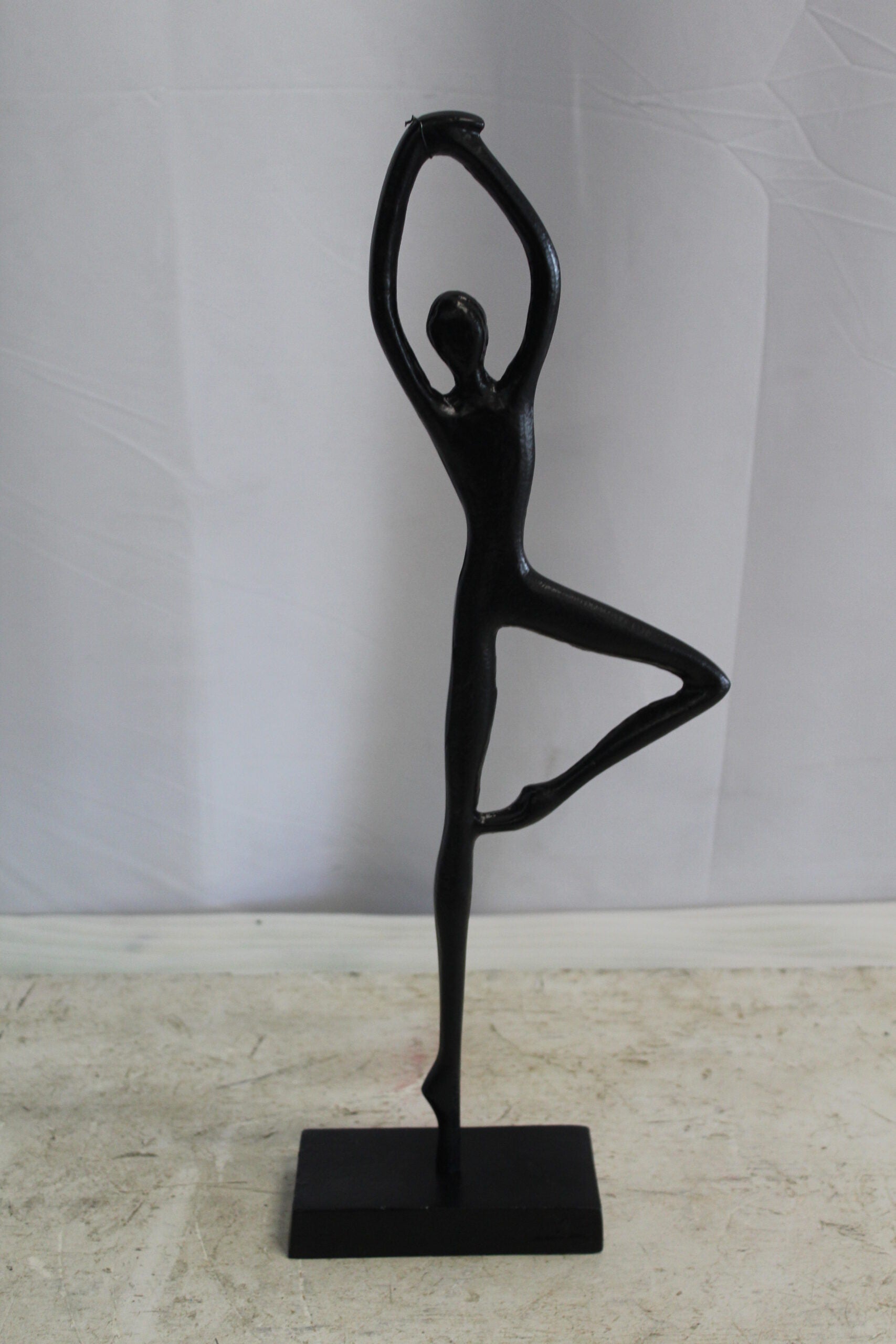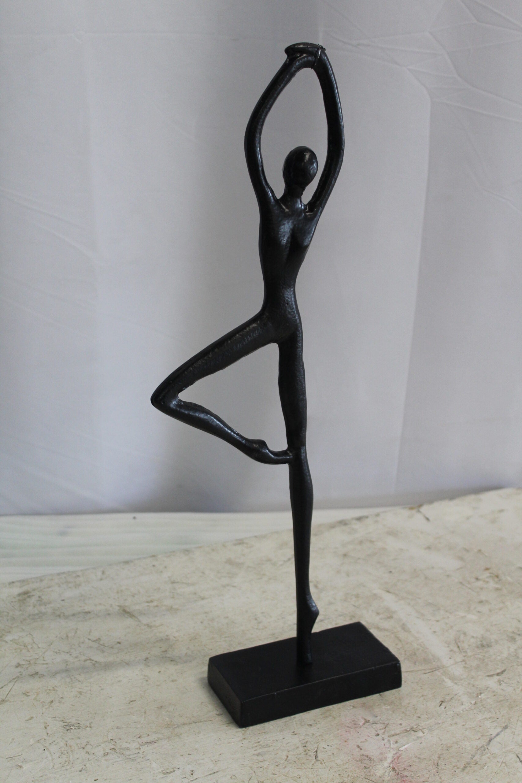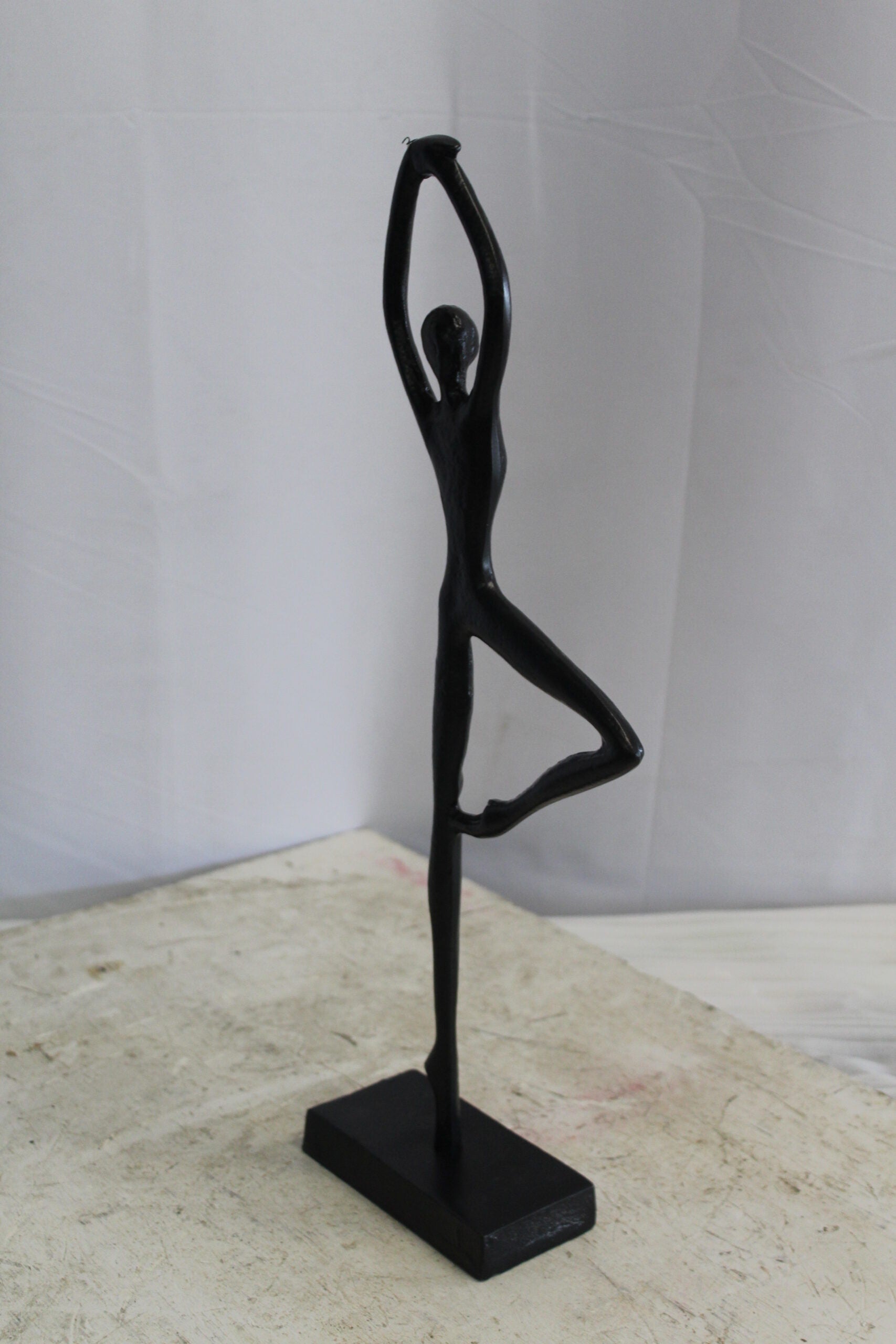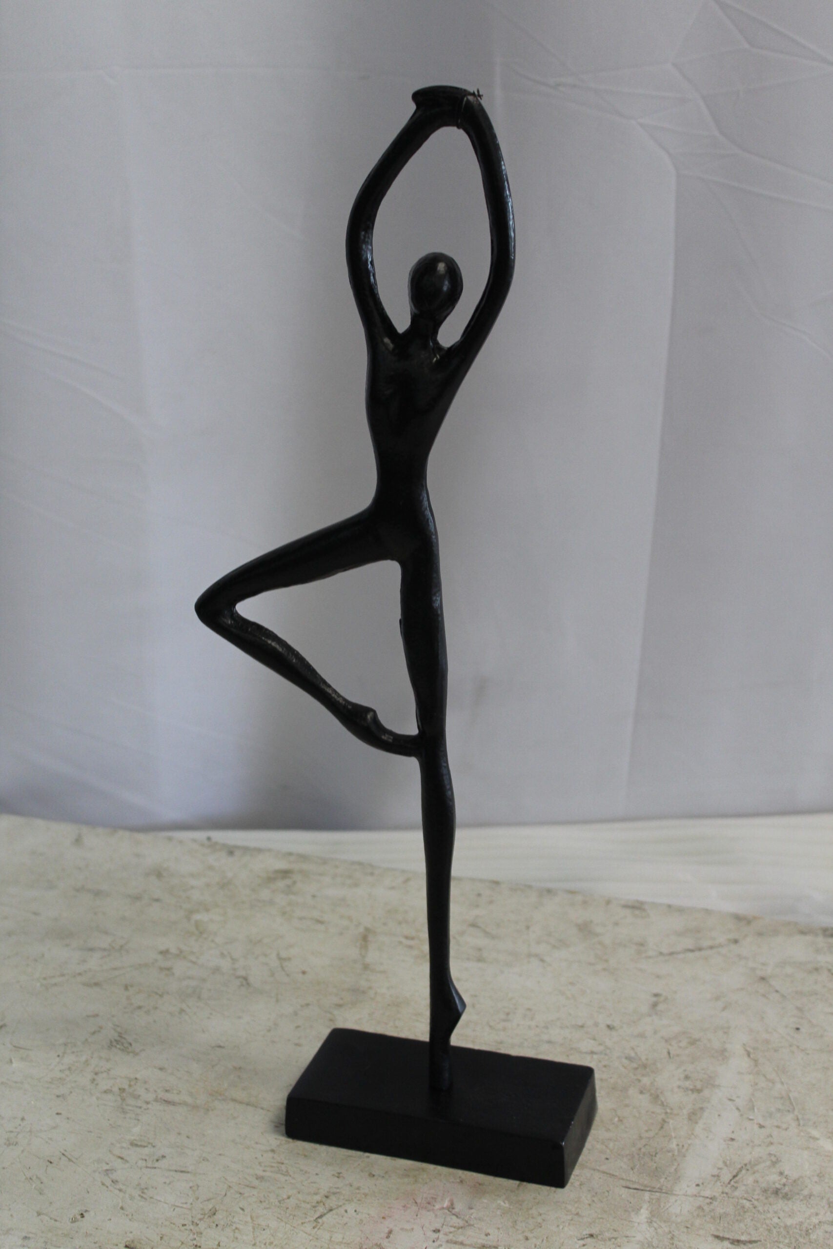 Aluminum tree pose statue for serene yoga decor. Handcrafted with care, exudes tranquility. Perfect for enhancing your yoga space. Durable casting ensures lasting serenity. Size: 7"L x 3"W x 20"H. Weight is: 2Lb