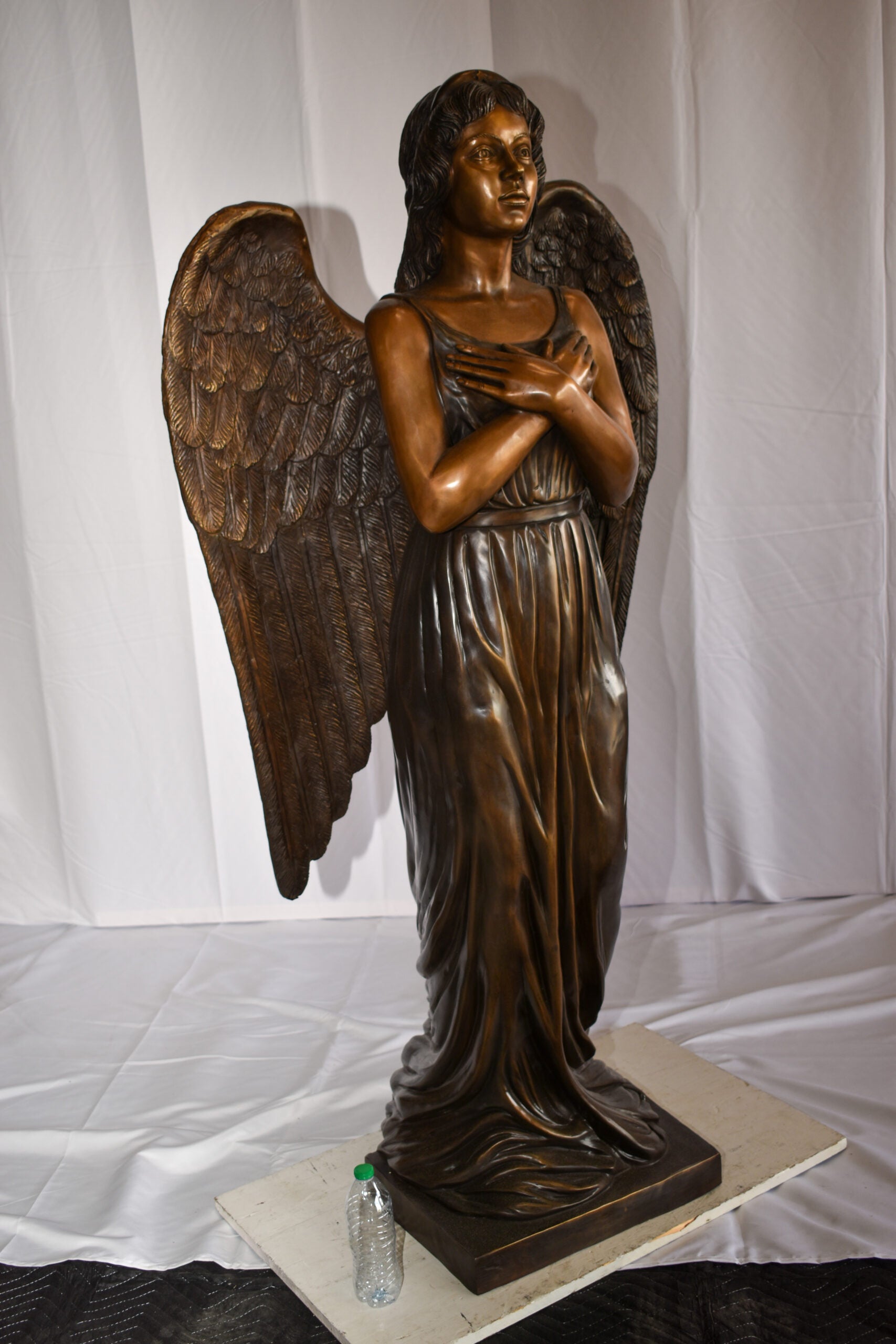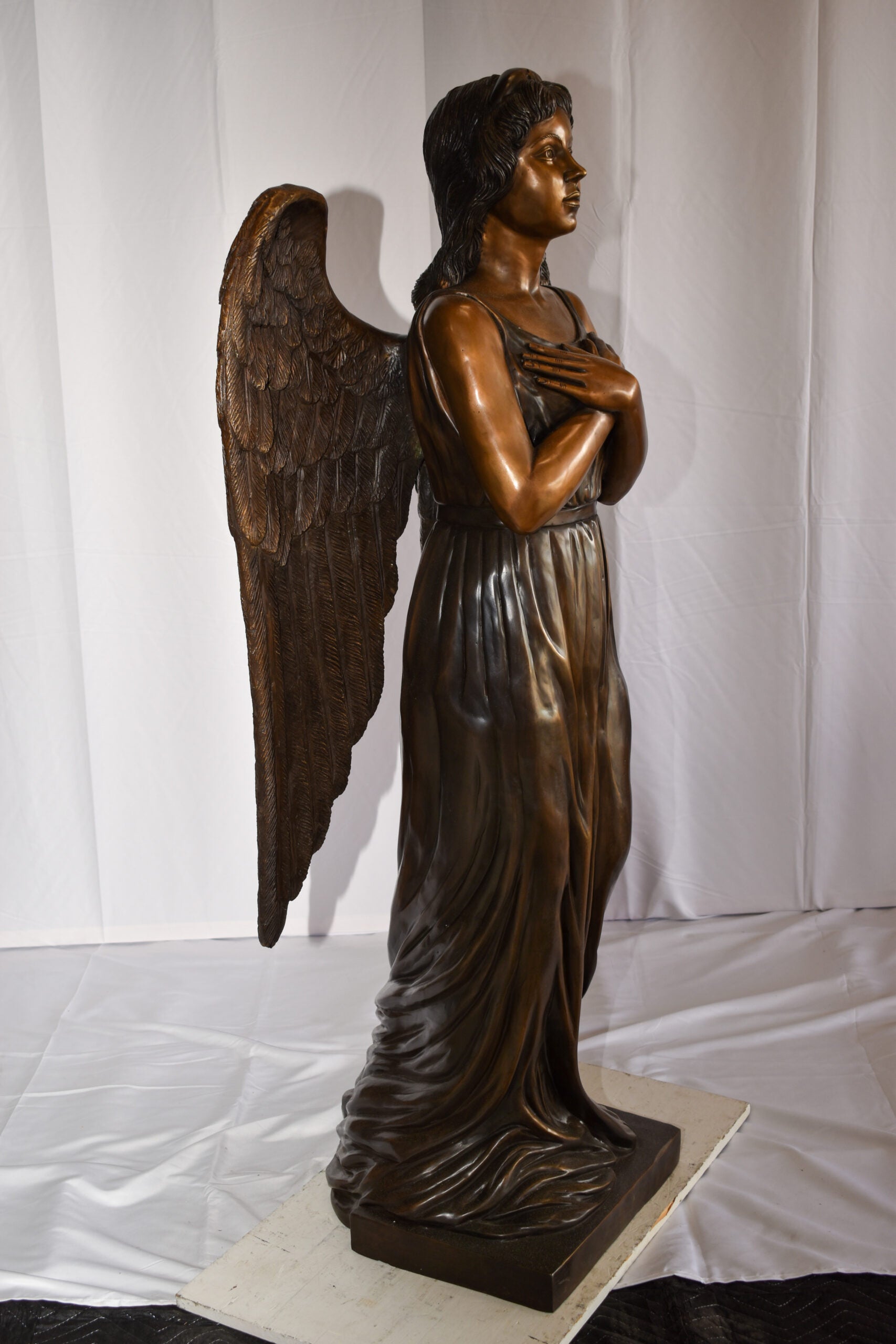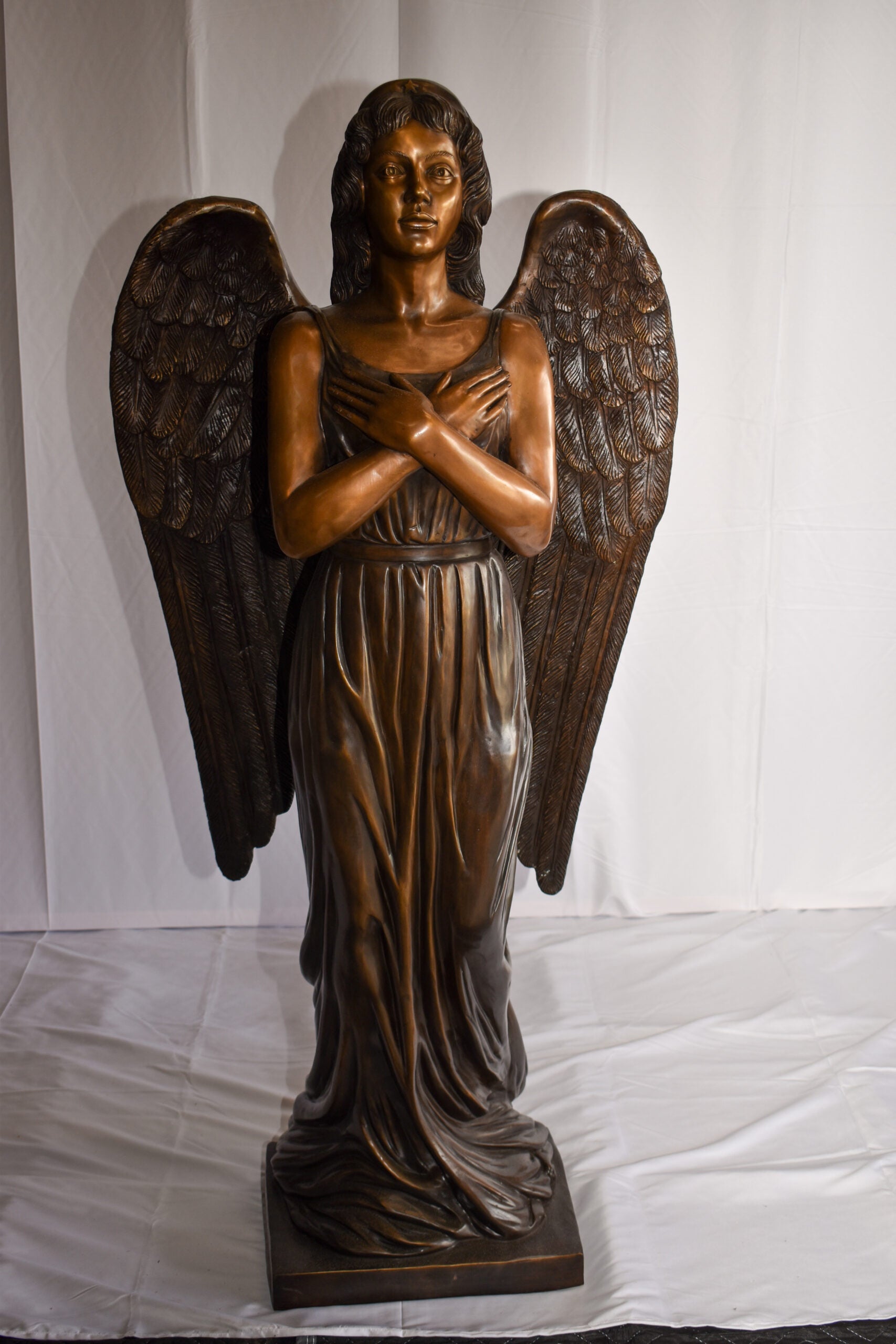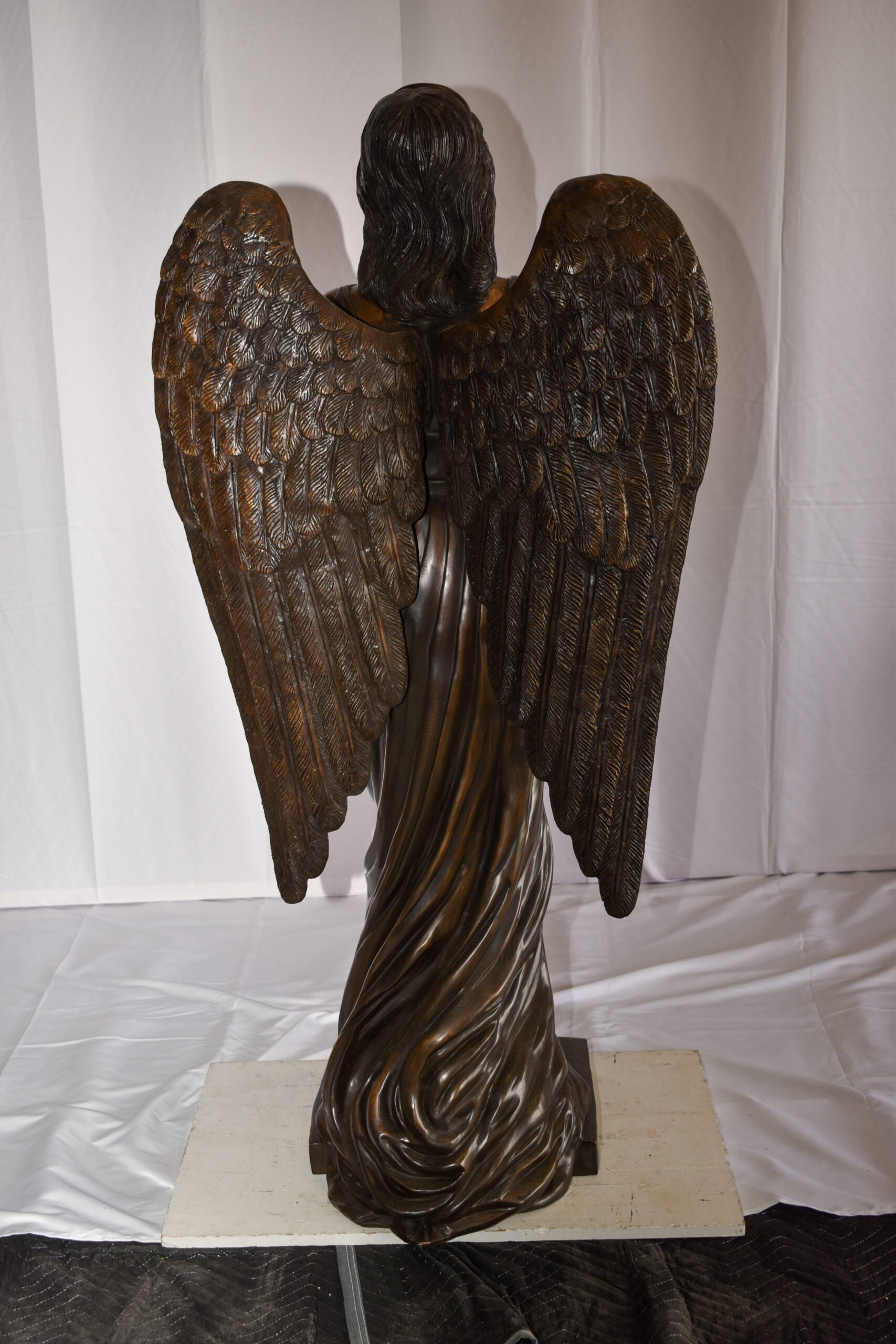 This is a gorgeous statue of a life size angel standing on a base made of bronze. At once tender and powerful, this winged angel represents the forces of heaven in an idyllic and comforting presence that creates an instant spot for prayer or meditation. This angel would be a great addition to the church, home or garden. Size: 29"L x 16"W x 63"H. Weight is: 122Lb