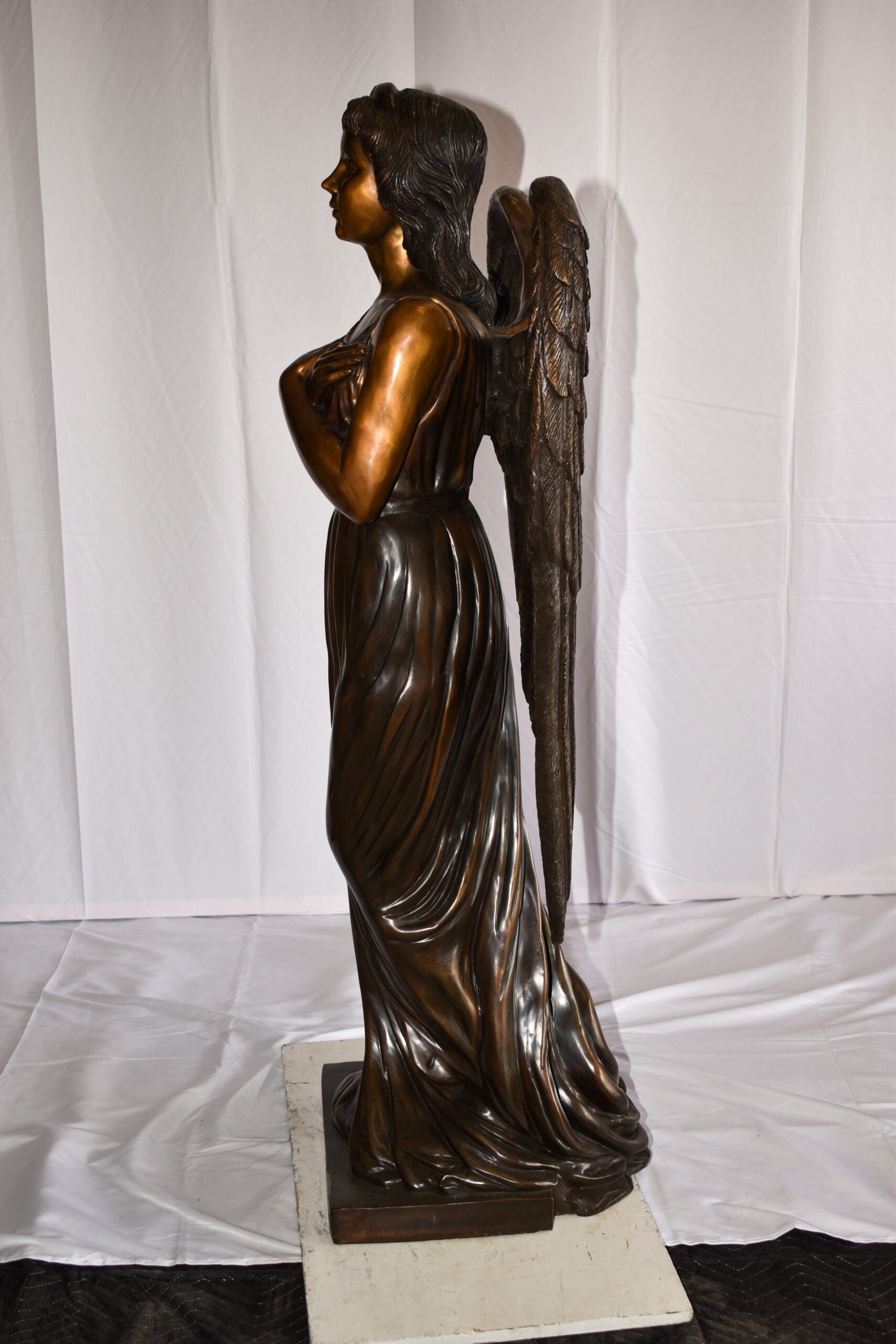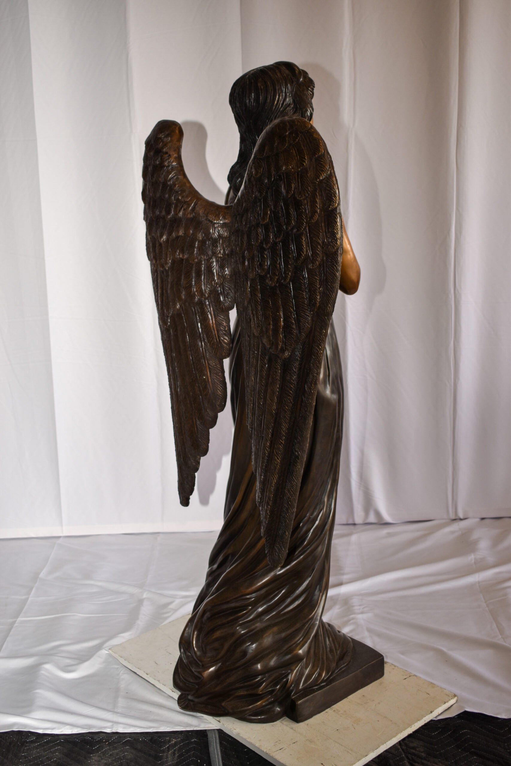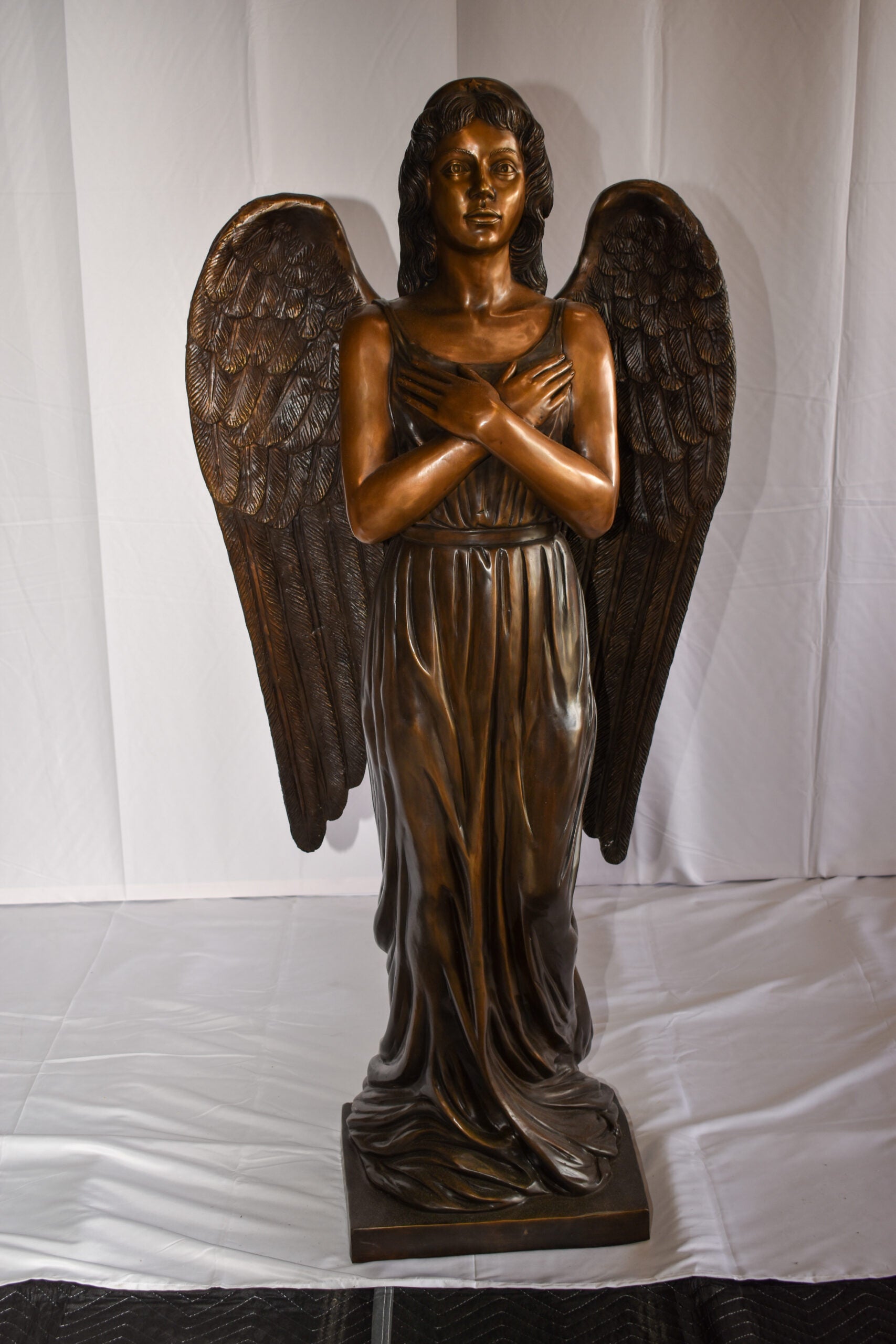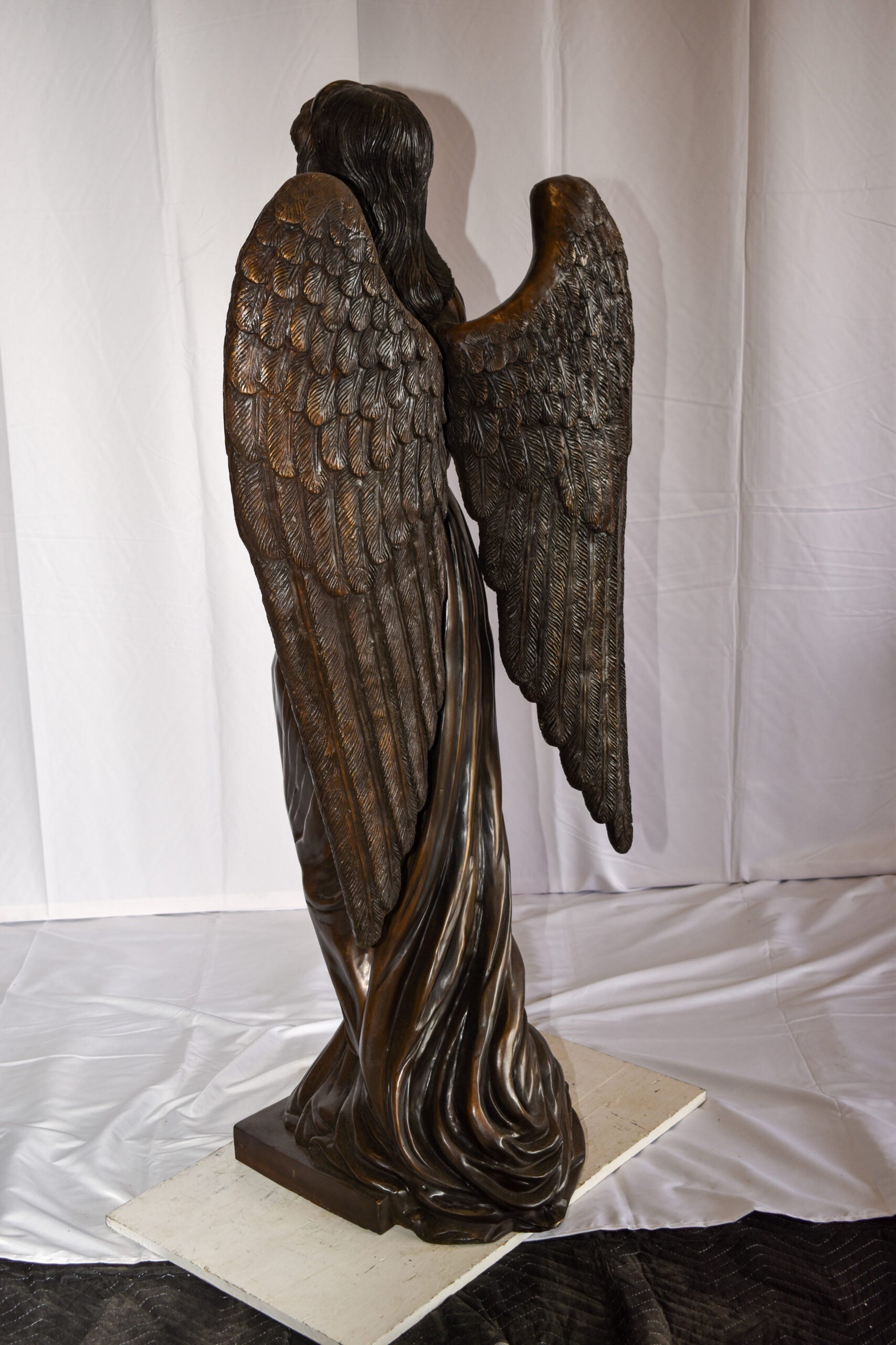 This is a gorgeous statue of a life size angel standing on a base made of bronze. At once tender and powerful, this winged angel represents the forces of heaven in an idyllic and comforting presence that creates an instant spot for prayer or meditation. This angel would be a great addition to the church, home or garden. Size: 29"L x 16"W x 63"H. Weight is: 122Lb