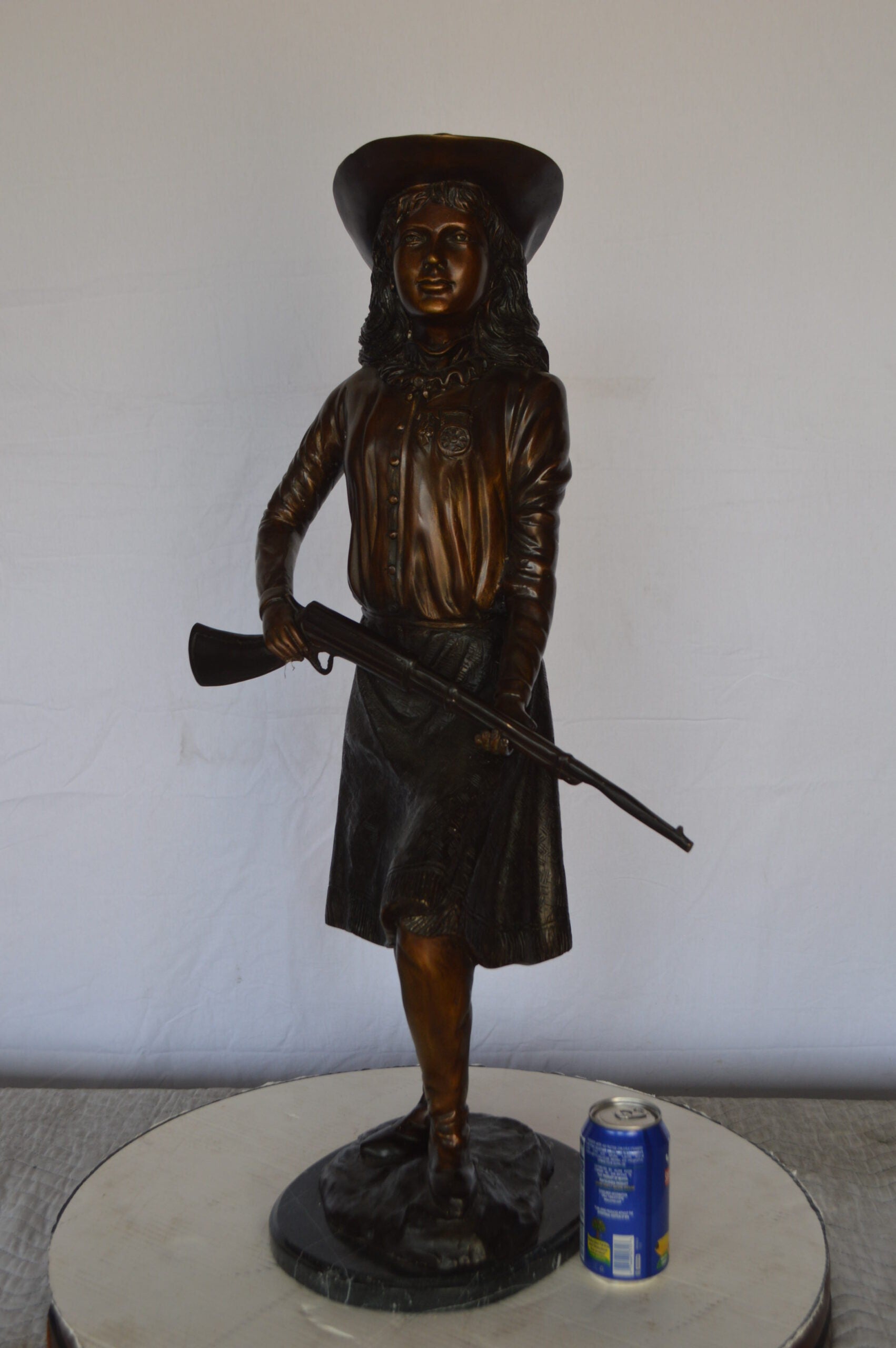 This statue depicts a multi-toned bronze statue mounted on a marble base of Annie Oakley. Annie Oakley (born Phoebe Ann Mosey; August 13, 1860 – November 3, 1926) was an American sharpshooter and exhibition shooter. Her talent first came to light when at age 15 she won a shooting match against traveling-show marksman Frank E. Butler, whom she later married.<1> The couple joined Buffalo Bill's Wild West show a few years later. Oakley became a renowned international star, performing before royalty and heads of state. The statue’s detailed face and body is finished with the traditional, hand-rubbed bronze finish truly bring this beautiful bronze statue to life. This bronze statue is cast in the traditional lost-wax method, which highlights the exceptionally fine detail and guarantees lasting heirloom beauty. Size: 11"L x 9"W x 33"H. Weight is: 31Lb
