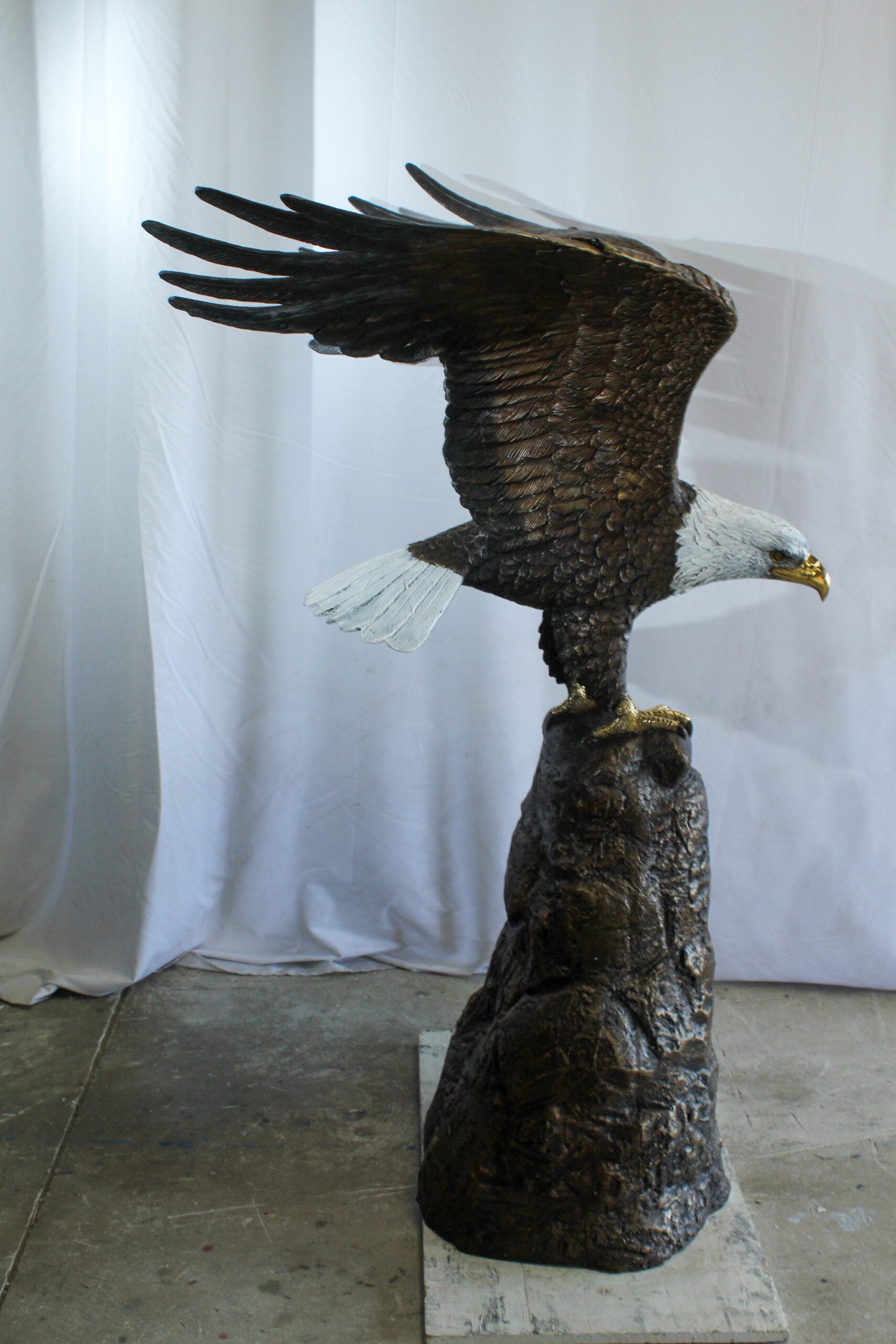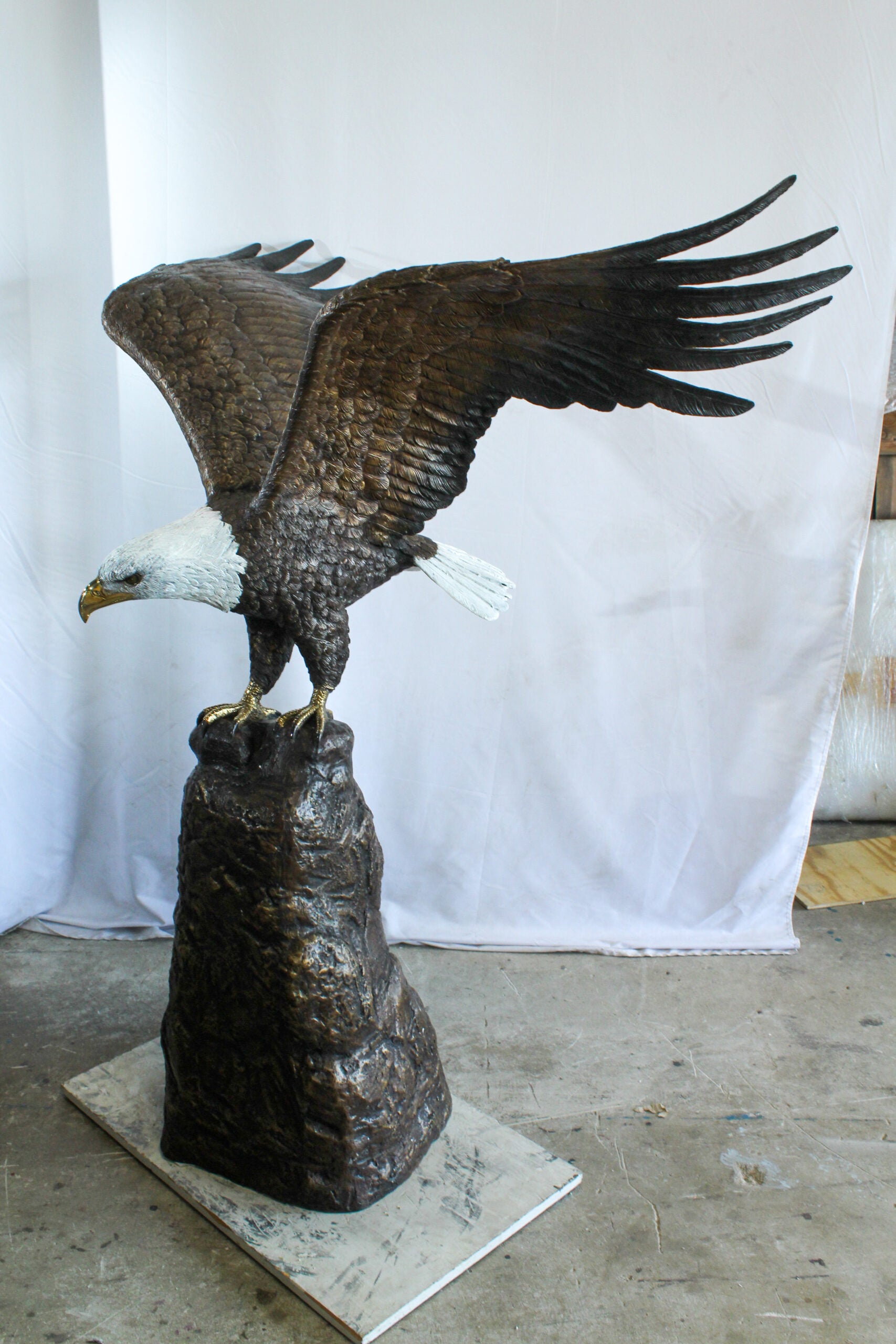 This striking bronze statue features a bald eagle with a distinctive white head, captured in mid-descent as it lands on a rugged rock with wings fully spread. Crafted using the lost wax casting method, it showcases fine feather details and a lifelike expression. Symbolizing power and freedom, this solid bronze sculpture is perfect for outdoor spaces or patriotic decor. Size: 51"L x 36"W x 58"H. Weight: 161Lb