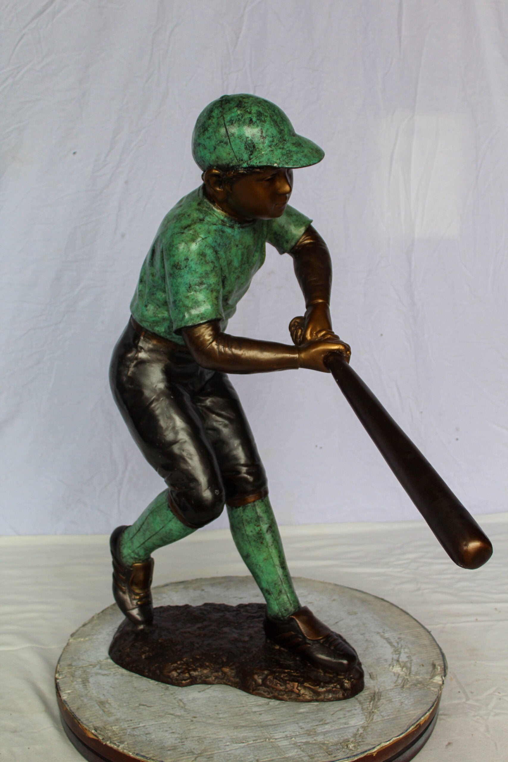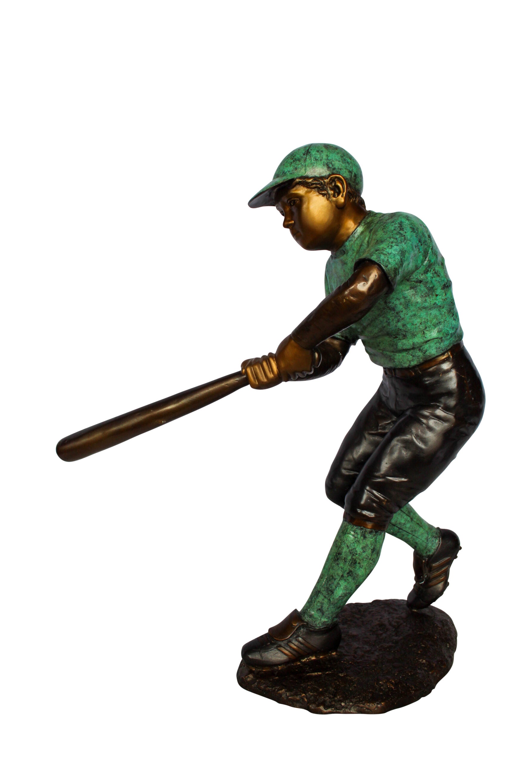 Nifao Bronze Baseball Boy Statue – Young Athlete Mid-Swing Sculpture with Green & Brown Patina – Lost Wax Cast Bronze Sports Artwork for Garden, Park, or Home Decor 27" x 12" x 24"H