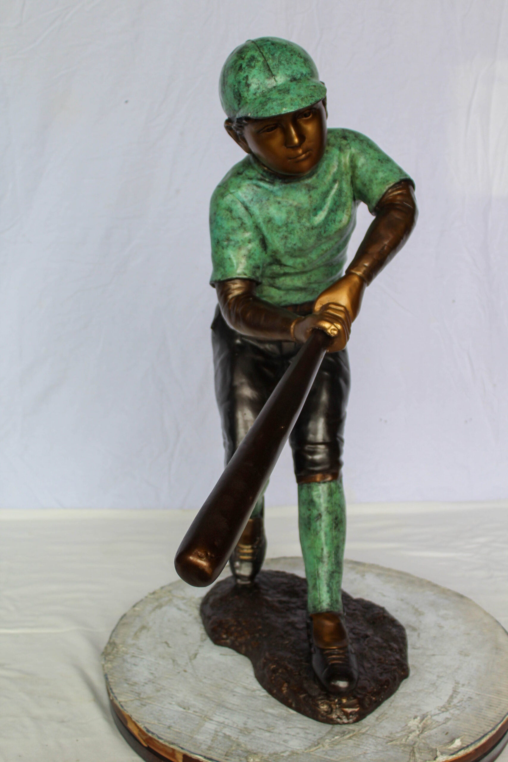This delightful bronze statue captures a young boy mid-swing in a classic baseball pose, exuding energy and childhood joy. Crafted with a rich green and brown patina, the sculpture brings a playful yet artistic touch to any garden, park, or sports-themed space. Made using the traditional lost wax casting process, ensuring lasting quality and exceptional detail. Size: 27"L x 12"W x 24"H. Weight: 30Lb