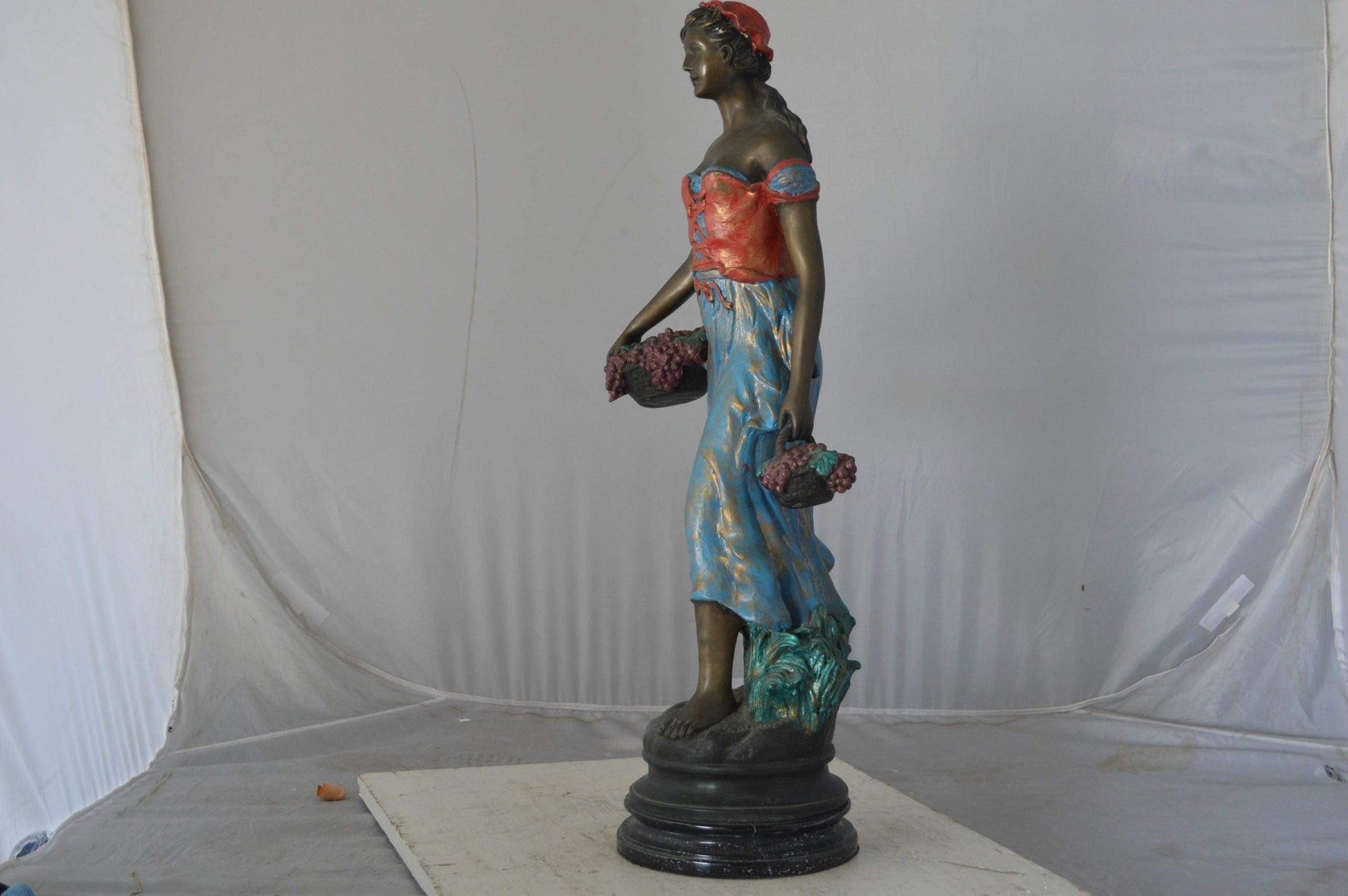 This bronze statue shows a young woman going about gracefully while carrying baskets of grapes in both hands. For this piece of art, the artist ensured beauty through the use of a process known as enameling over bronze. Through this method, he gave a colored shiny effect for the clothing, making it sure to stop eyes in any room of a home or office. Size: 14"L x 6"W x 20"H. Weight is: 15Lb