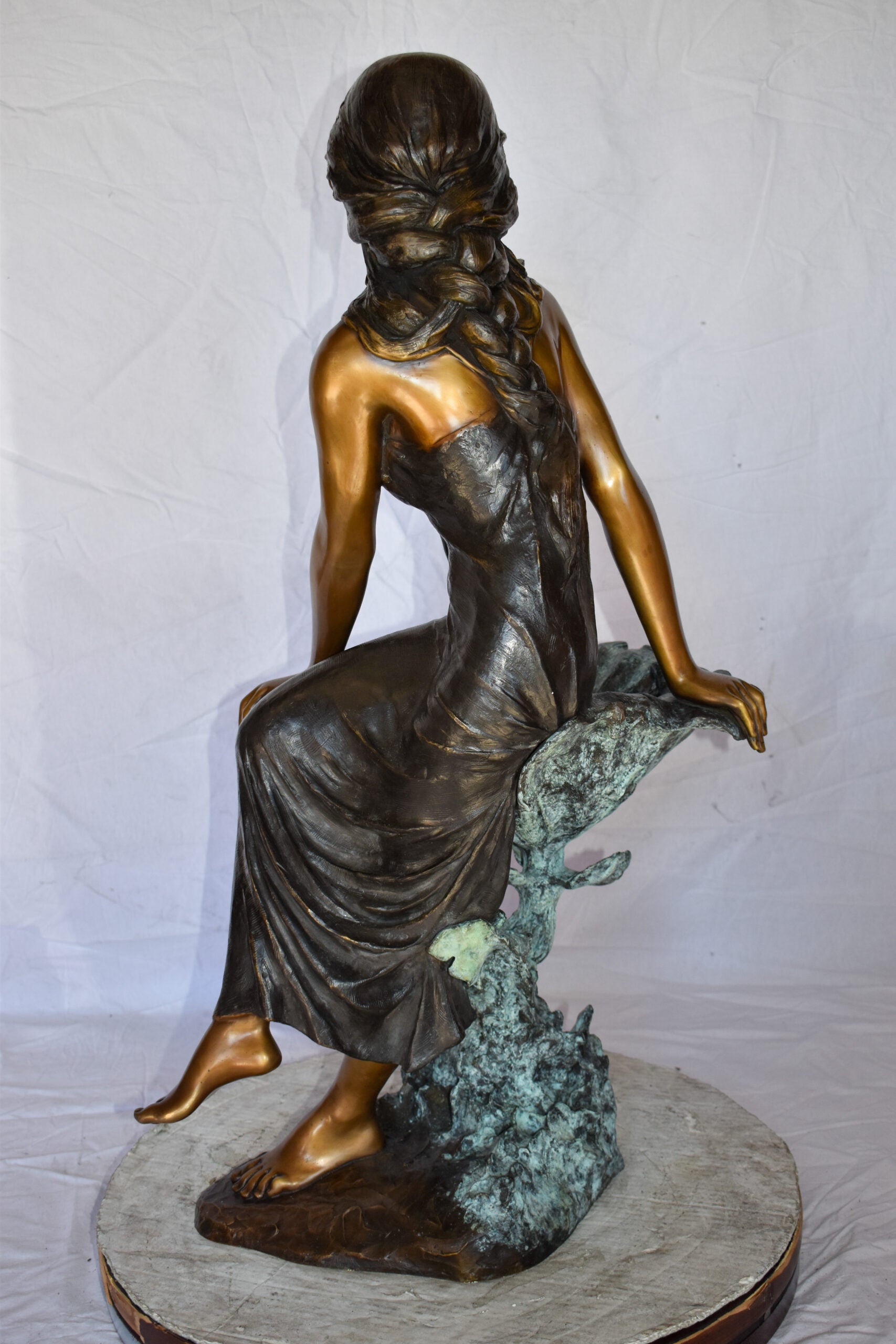 A large size Birdbath made of bronzed metal with beautiful girl and a hamming bird feeding on a flower. This extraordinary sculpture is cast in the traditional lost-wax method, features a realistic flower. The bird is shown with marvelous detail to the feathers, beaks and eyes with a unique expression and pose. This impressive birdbath Bronze Statue will be a permanent fixture on the grounds of your estate for years to come. Size: 22"L x 17"W x 39"H. Weight is: 66Lb