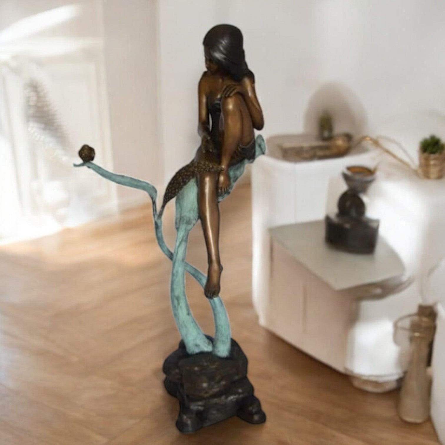 This charming large size bronze statue depicts Beautiful Young Girl Sitting on a Tree and Enjoying Nature. This very fine and unique abstract was casted using the ancient old "Lost Wax Method" stained in green and brown patina finish for preservation. 100% handmade and 100% bronze. This beautiful large bronze-cast statue will be a valuable addition to any area of the home, office, patio, or garden. Size: 35"L x 50"W x 55"H. Weight is: 54Lb