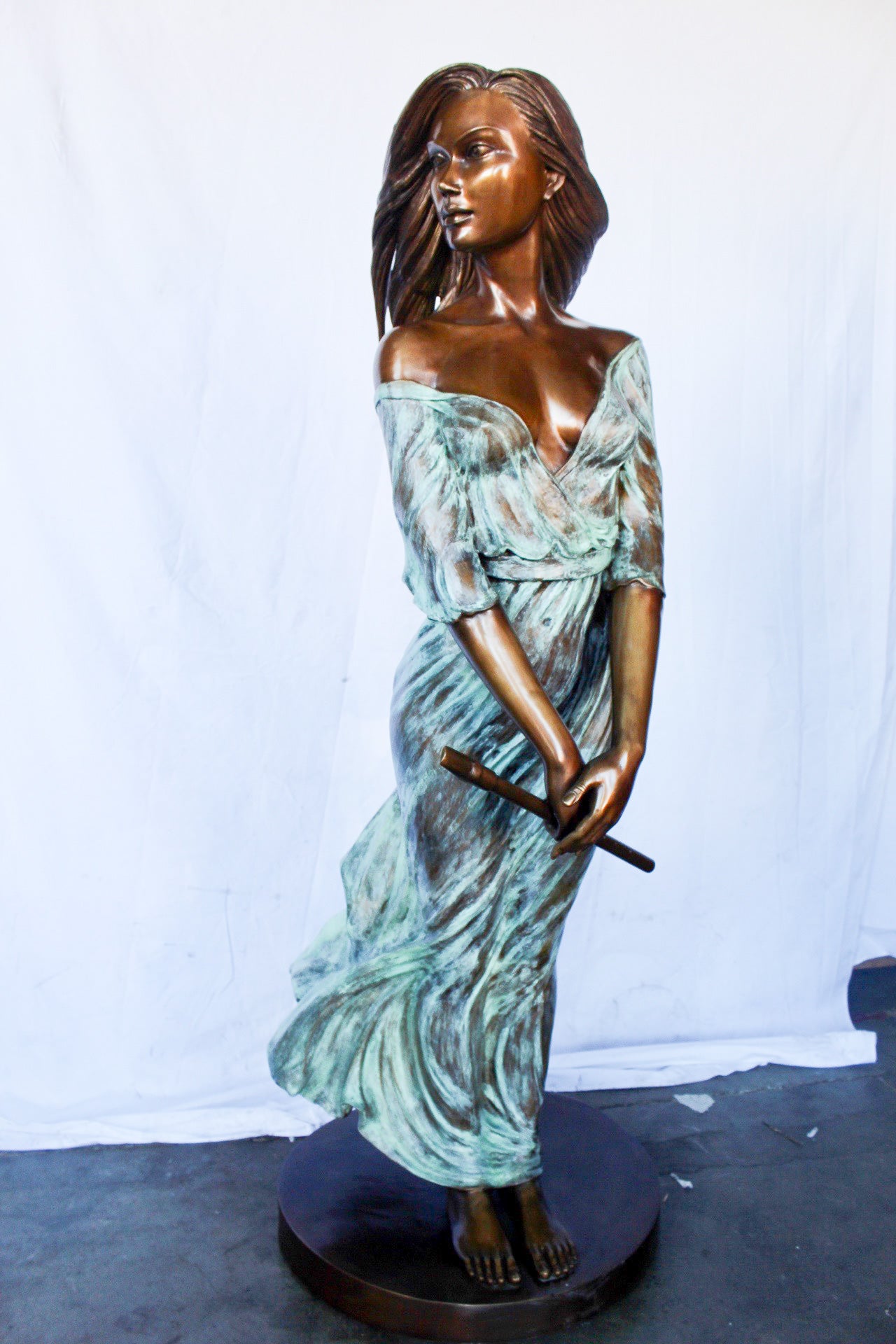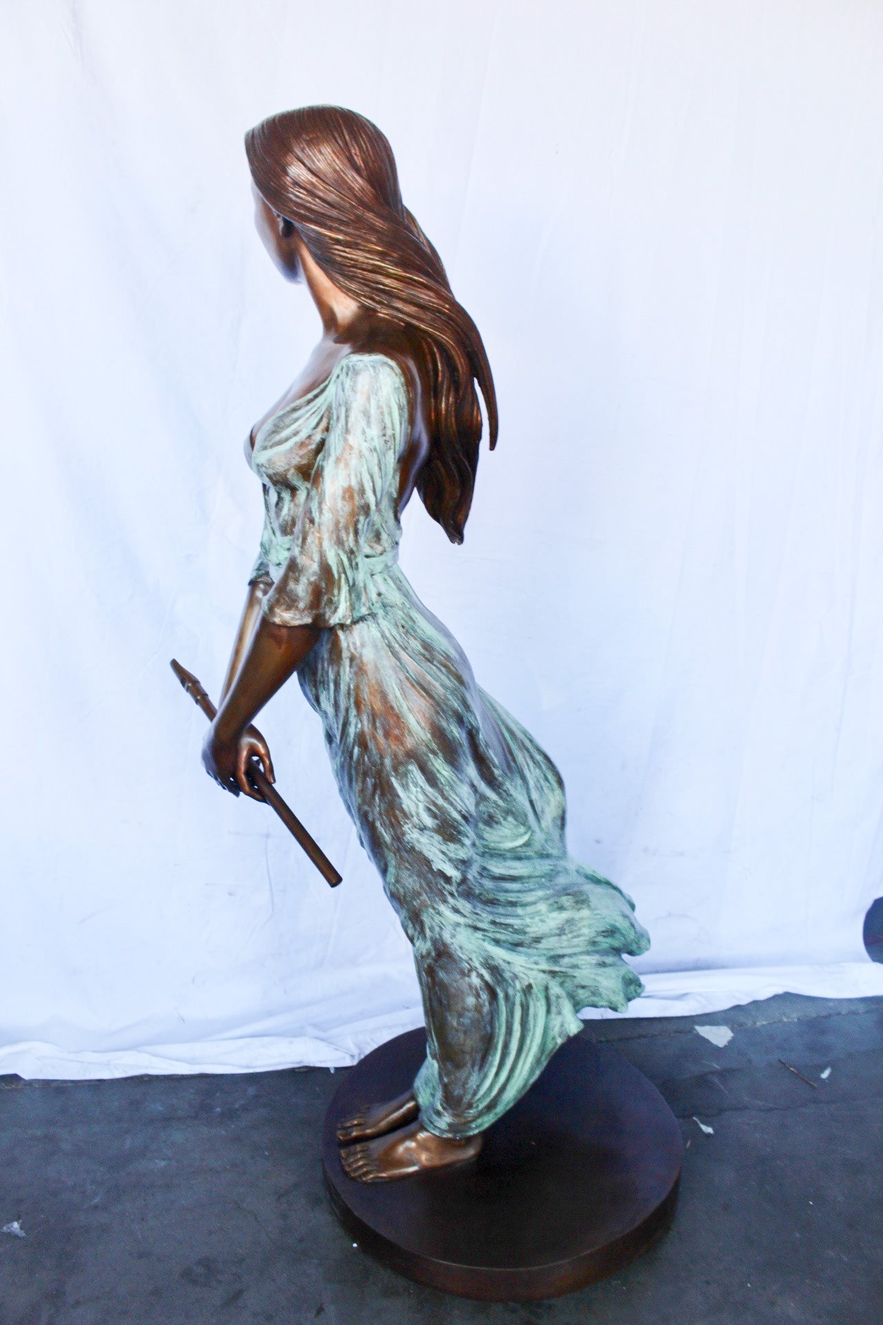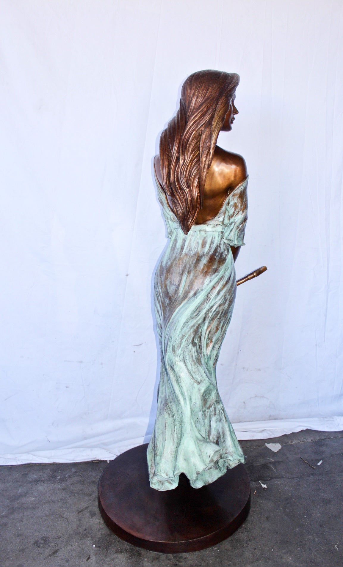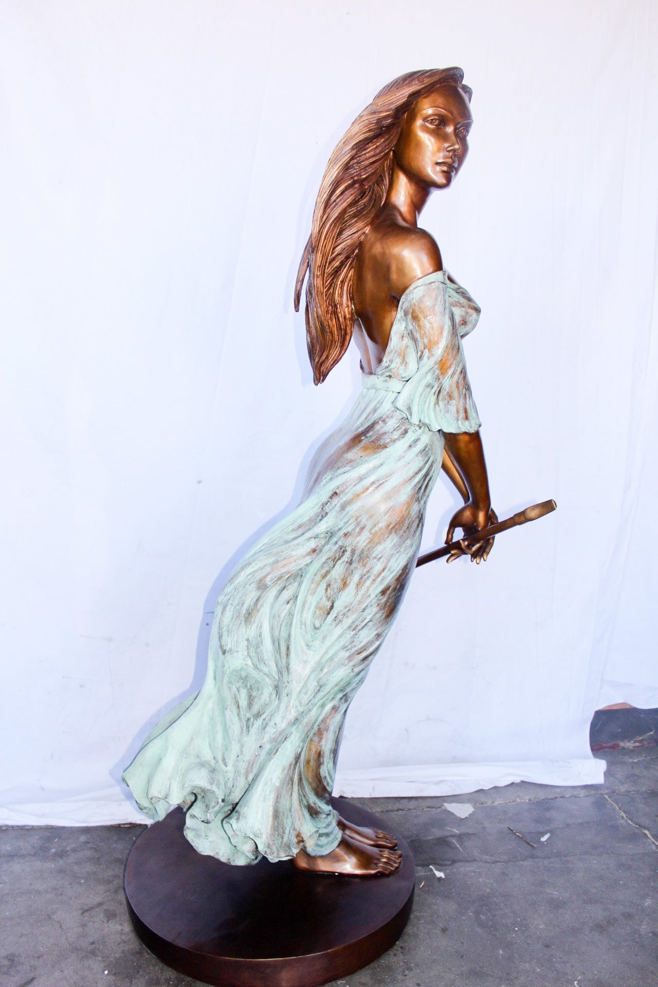 This breathtaking bronze statue is one of our most exquisite pieces. With a dress comprised of green patina, it creates the illusion of a thin sheer dress. The beautiful woman sways peacefully in the wind while holding her flute, signifying the talent and beauty of the individual. Her hair and dress flow with the wind. This statue would look gorgeous in any large space and will most definitely capture the entire room. Size: 34"L x 25"W x 68"H. Weight is: 142Lb
