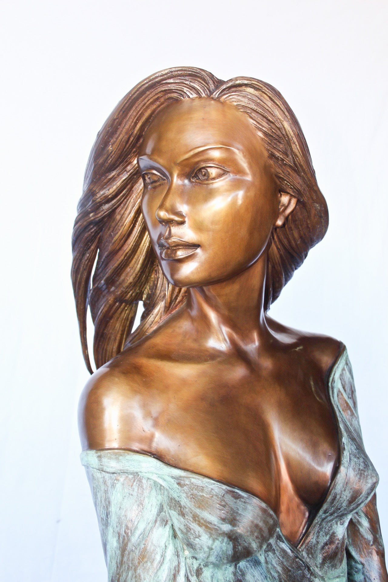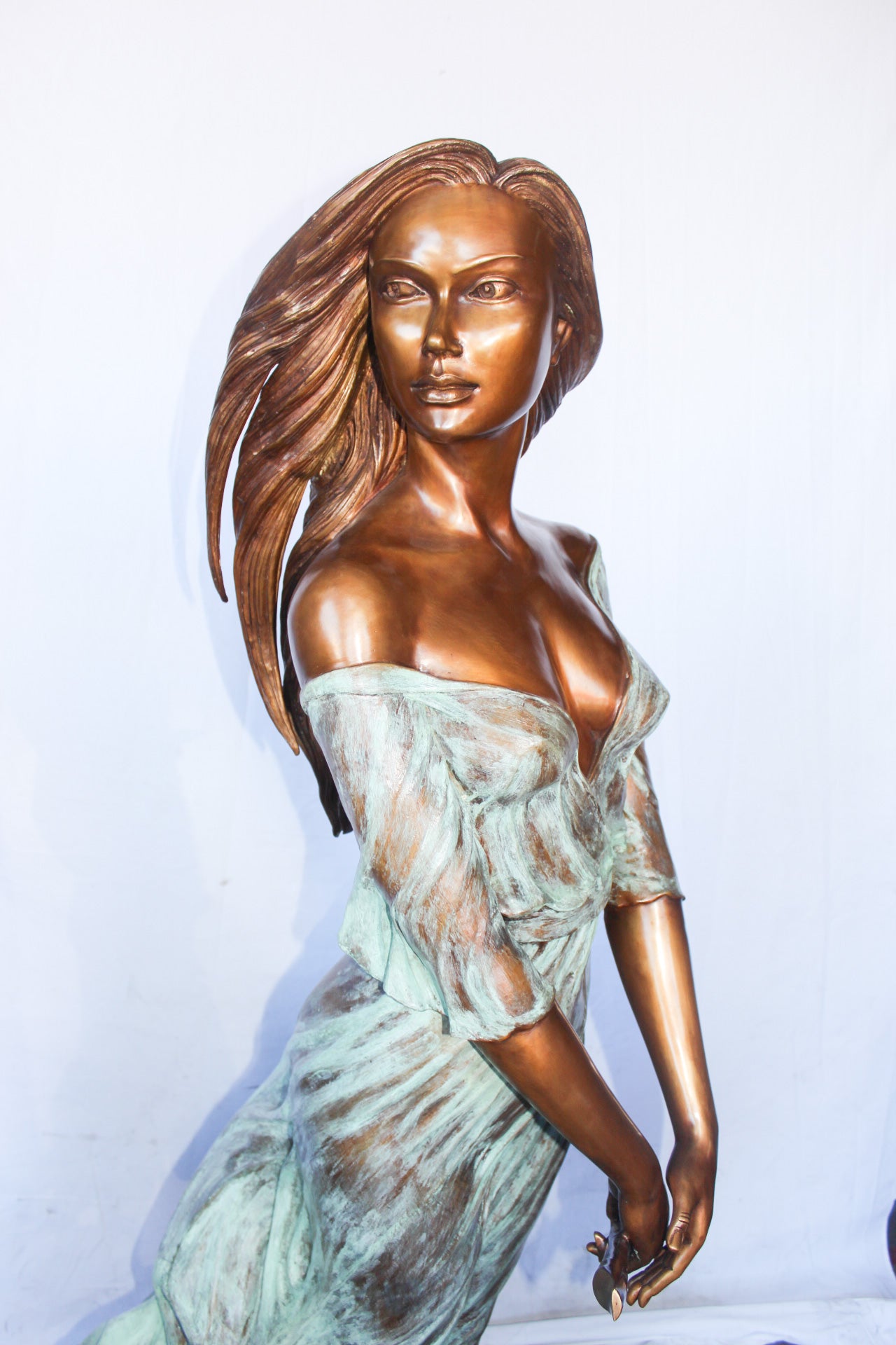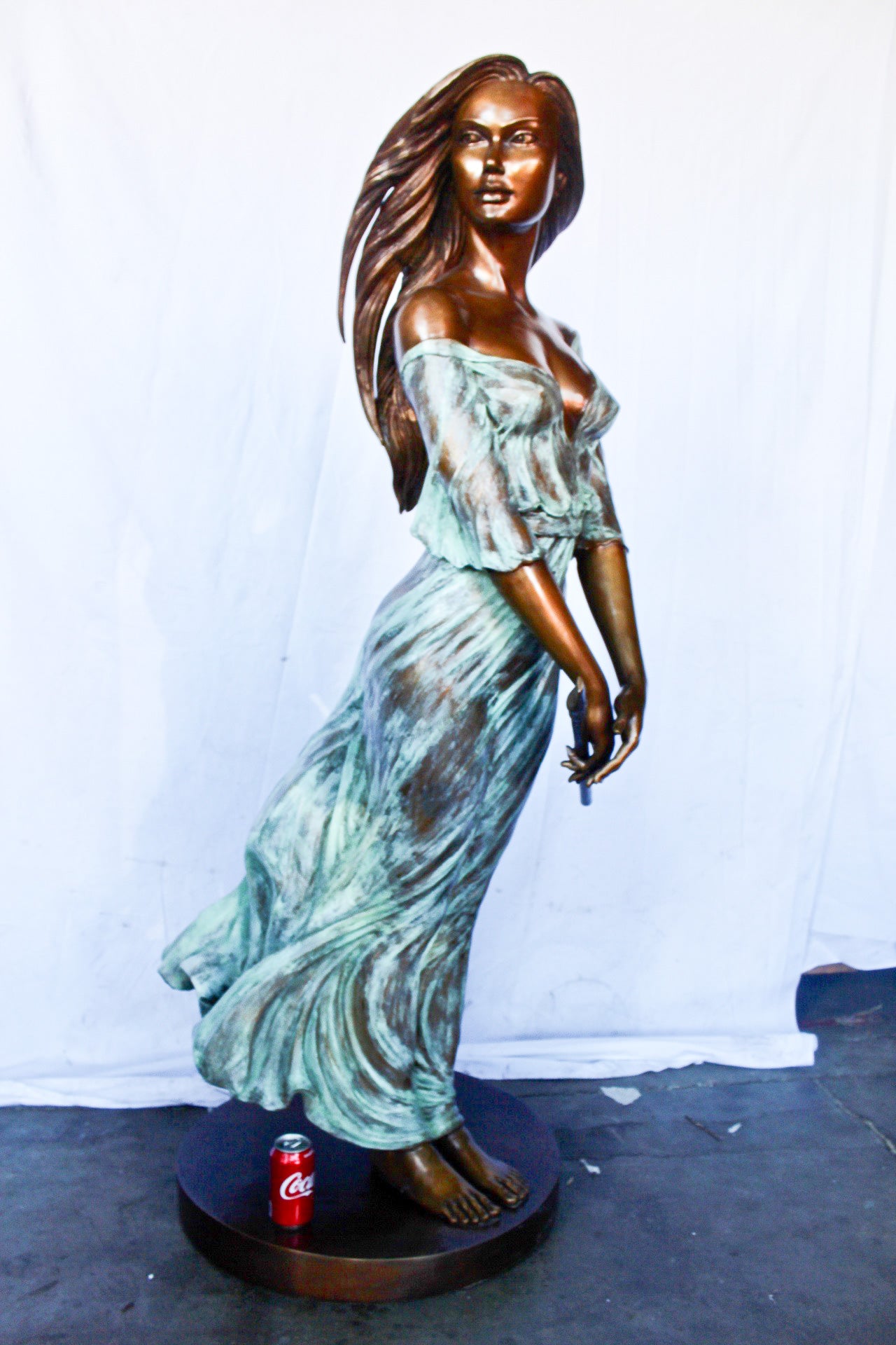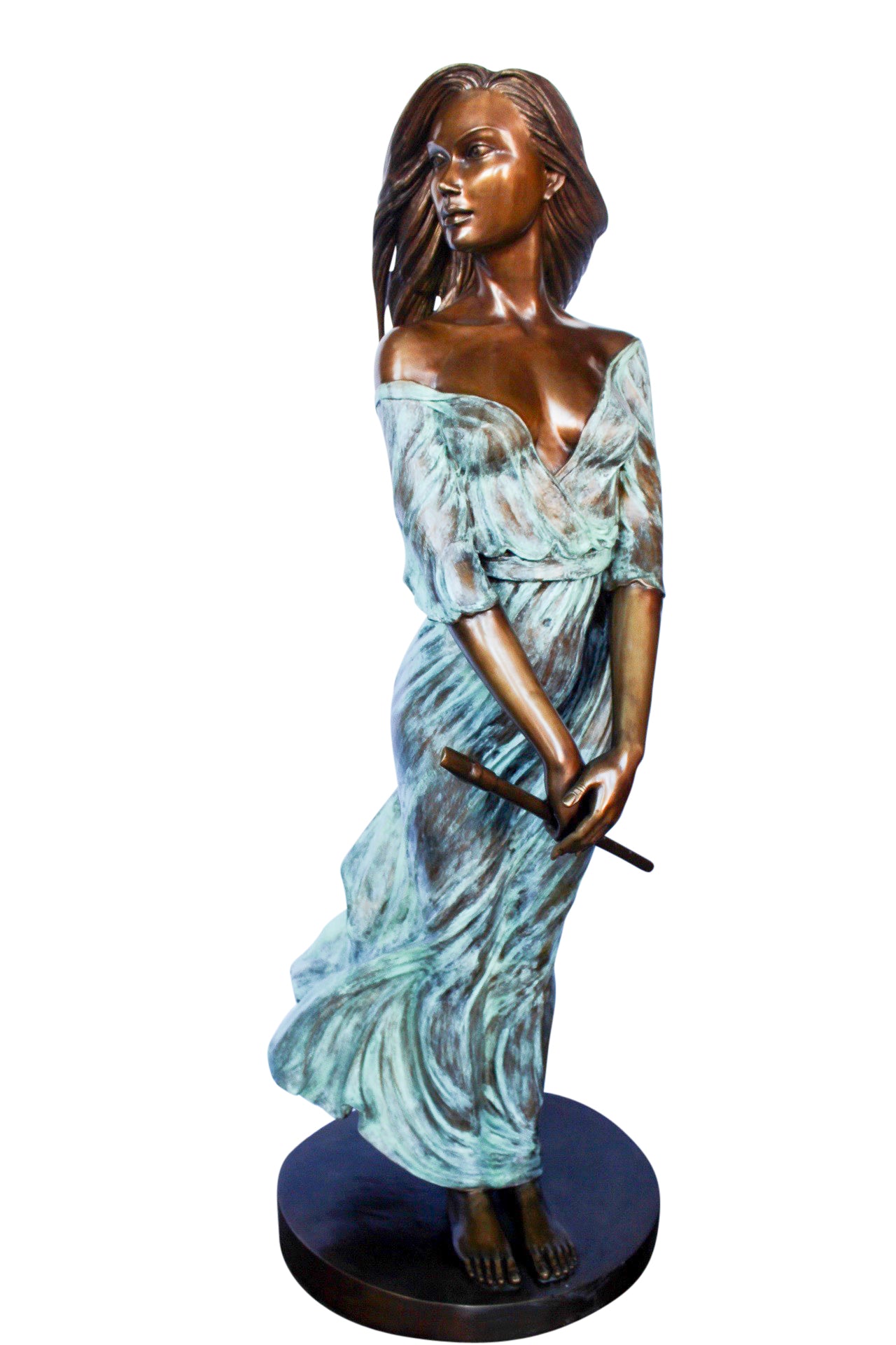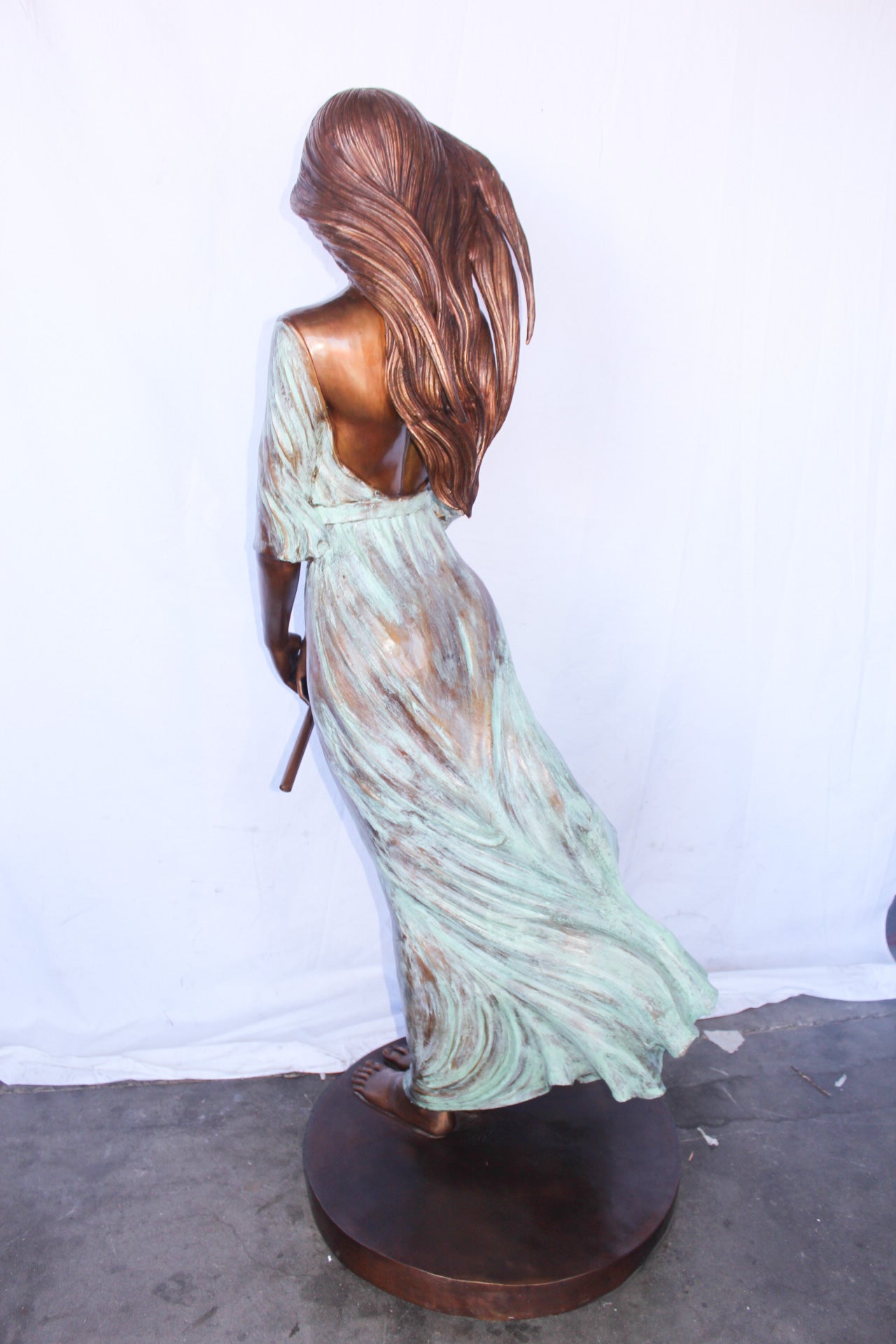 This breathtaking bronze statue is one of our most exquisite pieces. With a dress comprised of green patina, it creates the illusion of a thin sheer dress. The beautiful woman sways peacefully in the wind while holding her flute, signifying the talent and beauty of the individual. Her hair and dress flow with the wind. This statue would look gorgeous in any large space and will most definitely capture the entire room. Size: 34"L x 25"W x 68"H. Weight is: 142Lb