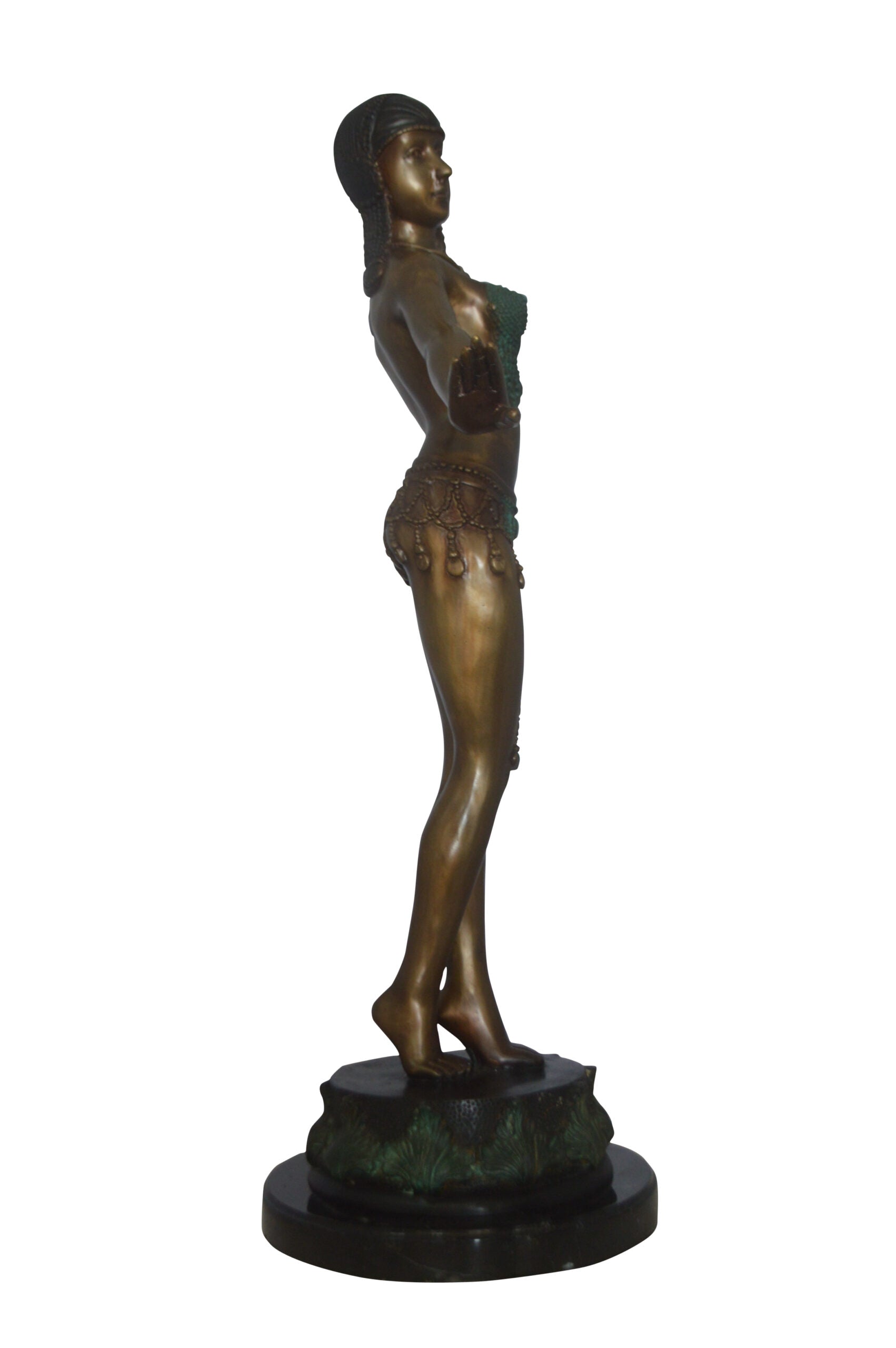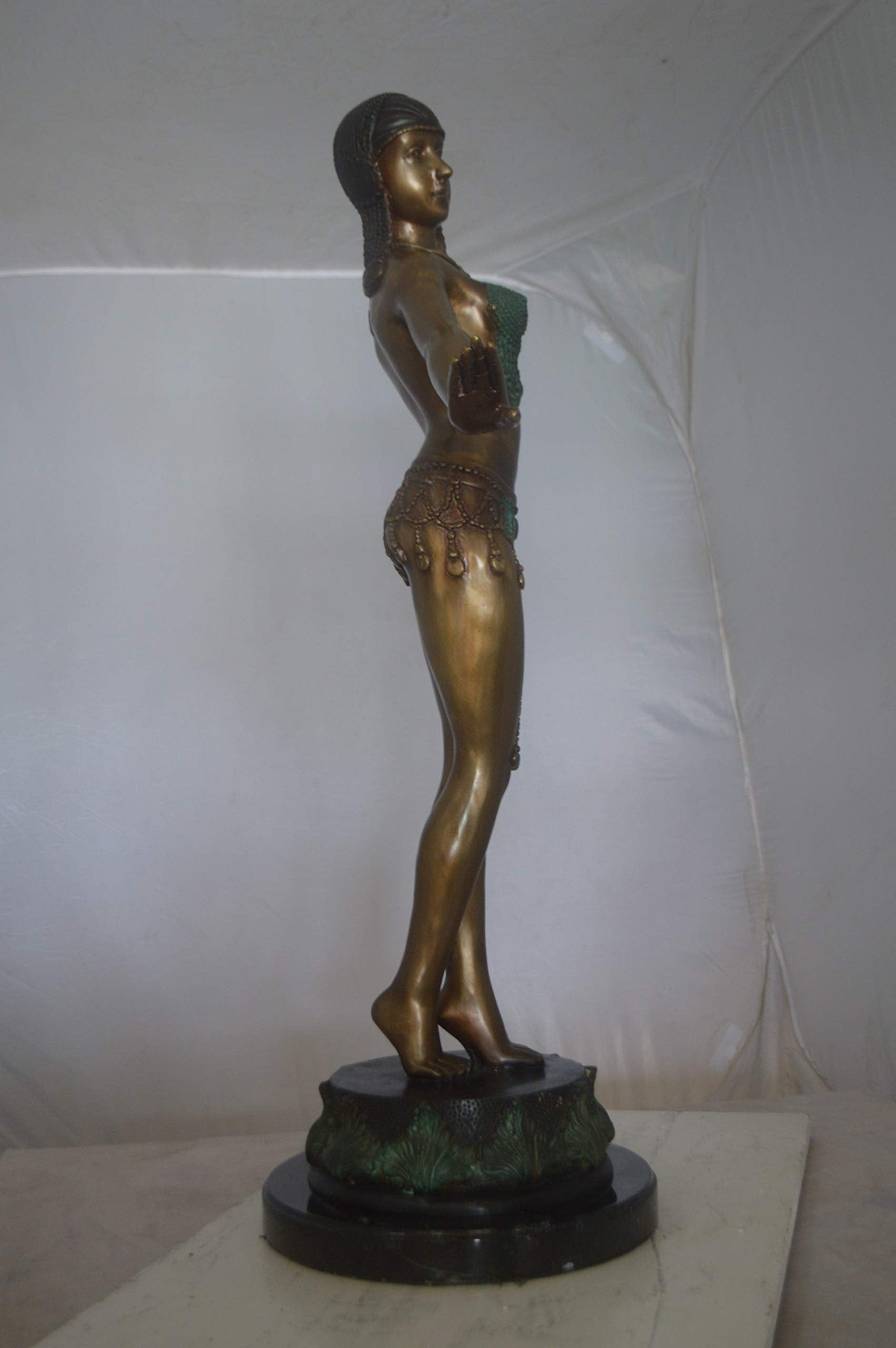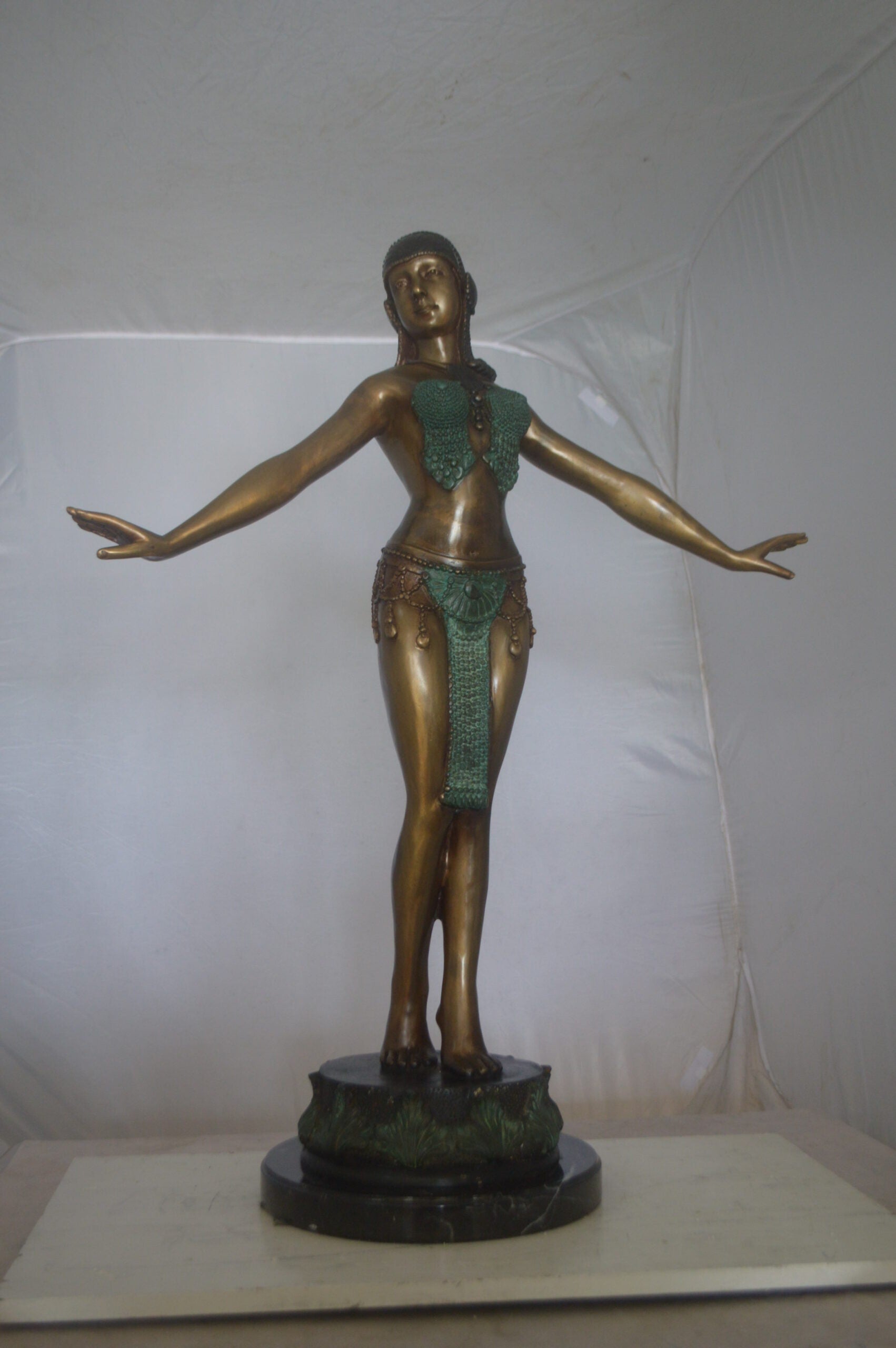 Impressive, classic, beautiful Belly Dancer bronze Statue mounted on a large and heavy piece of marble. The colors chosen for this Timeless Creation is stained in green and brown patina finish for preservation, handmade and pure bronze. This impressive Bronze Statue will be a permanent fixture on the grounds of your estate for years to come. Size: 32"L x 8"W x 41"H. Weight is: 55Lb