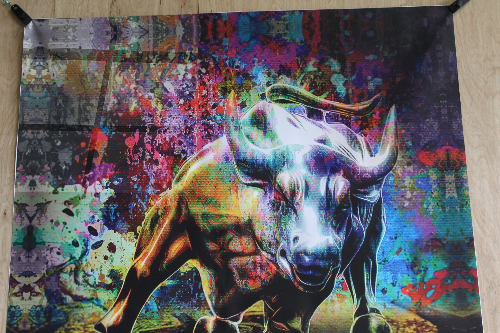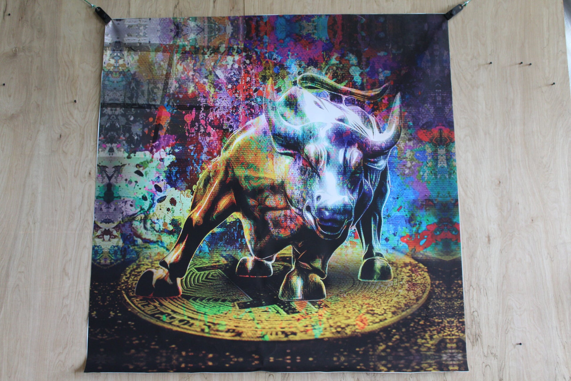 This giant painting on unstretched canvas captures the essence of the Bitcoin bull market with dynamic visuals and bold colors. Perfect for cryptocurrency enthusiasts and investors this artwork symbolizes growth and opportunity in the digital currency world. The canvas allows for flexible framing to complement your space. Size: 52"L x 52"W x "H. Weight is: Lb