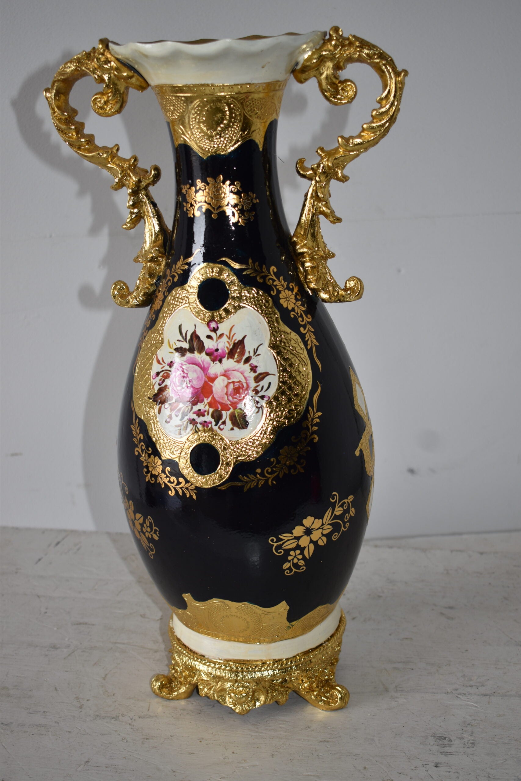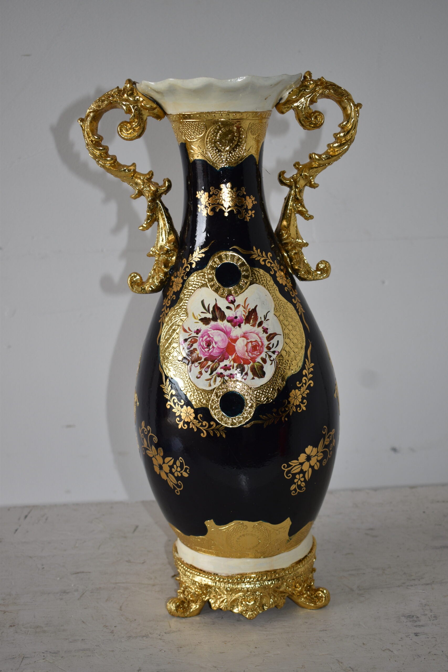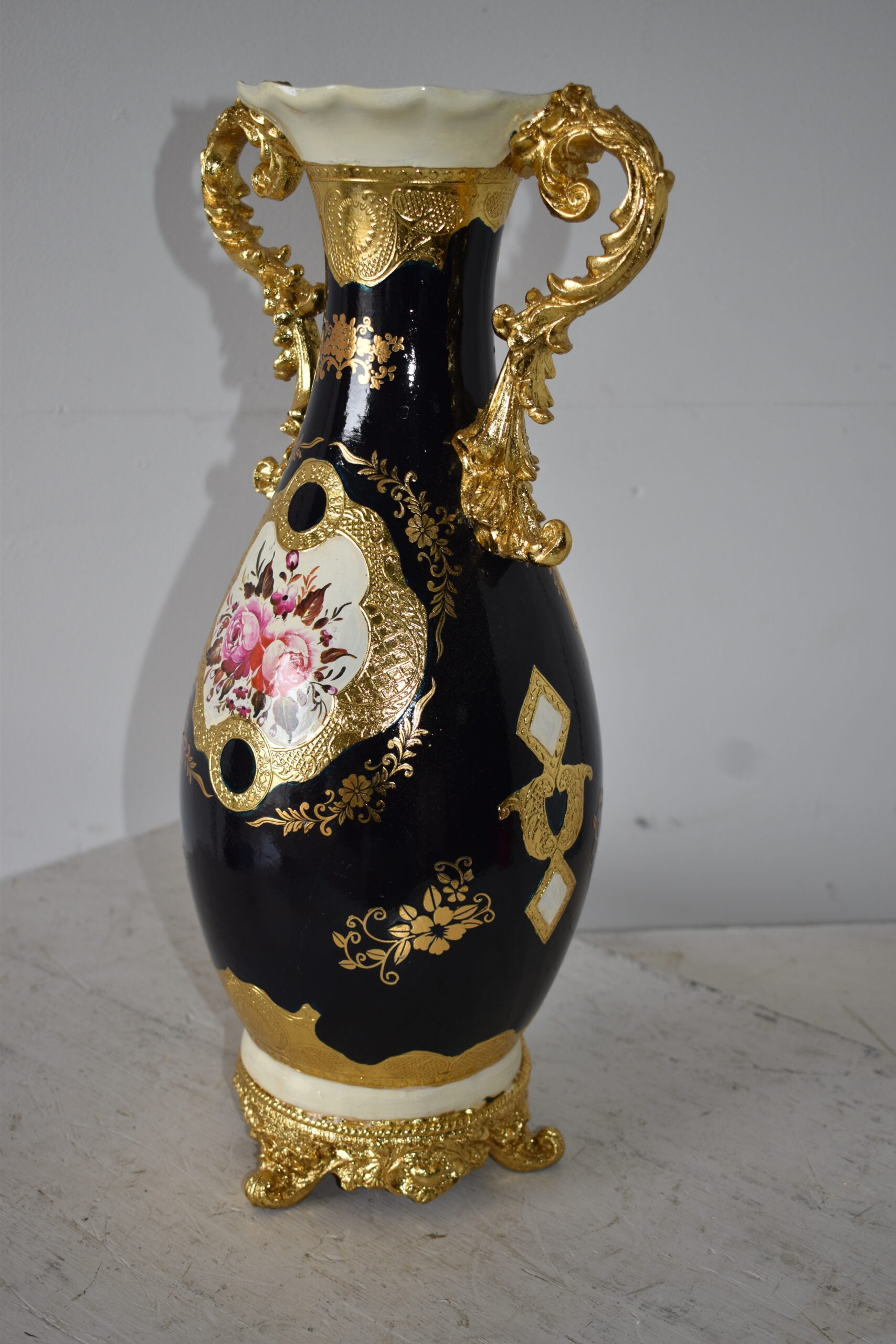 This black and gold resin vase statue will carry colorful contrast and detail into any room of your home. With its rounded handled covered in gold adorned detail finishes, it will bring a sense of artistic beauty to any room in your home. Size: 11"L x 9"W x 20"H. Weight is: 7Lb