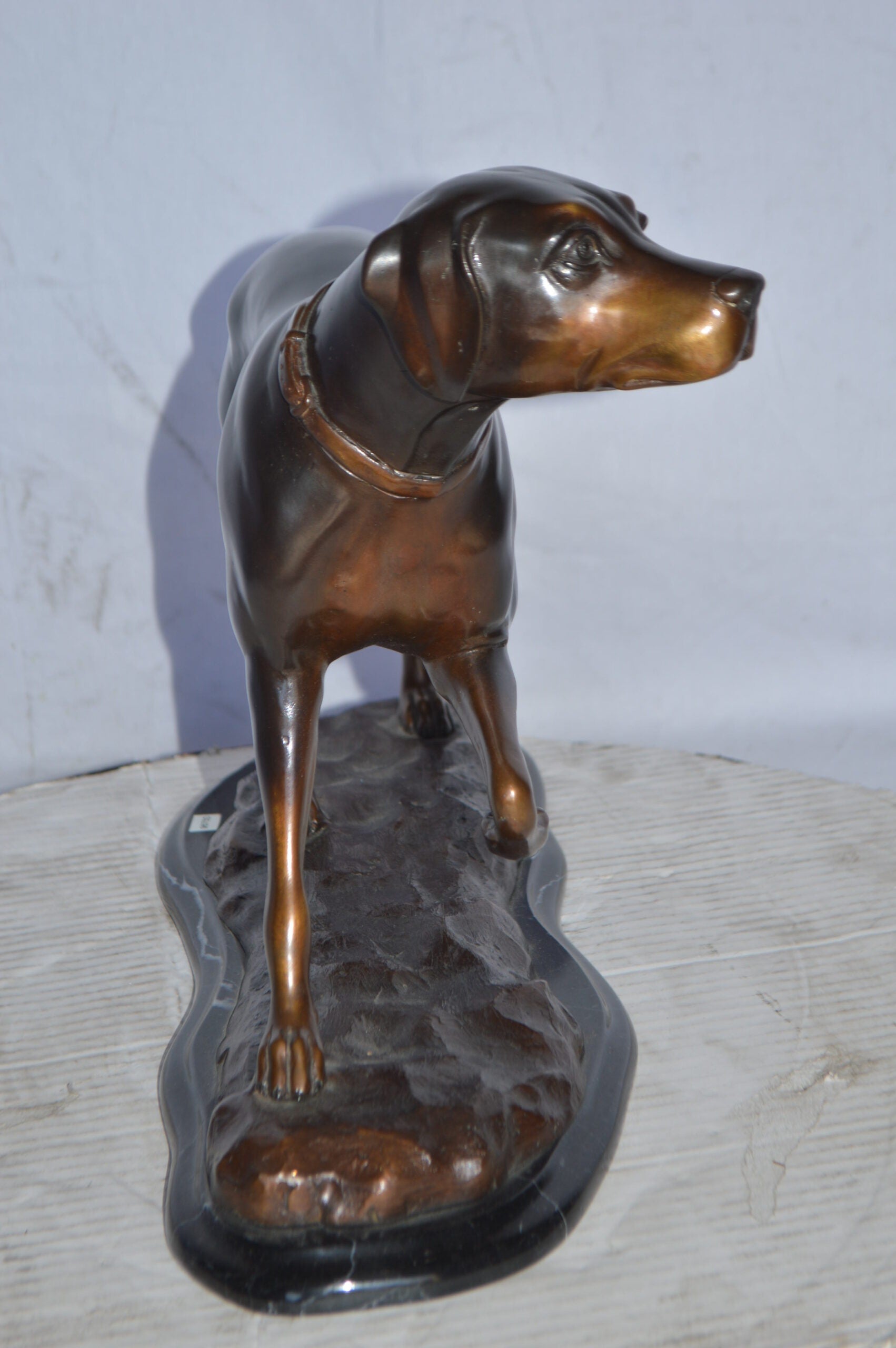 This black Labrador bronze statue reflects the wonderful qualities of these beautiful dogs. Labs are very friendly, playful, intelligent, trainable, energetic, and great companions. No wonder they are America most beloved breed of dog. Please pay close attention to the details of this statue. This bronze statue is cast in the traditional lost-wax method, which highlights the exceptionally fine detail and guarantees lasting heirloom beauty. Size: 20"L x 8"W x 14"H. Weight is: 18Lb
