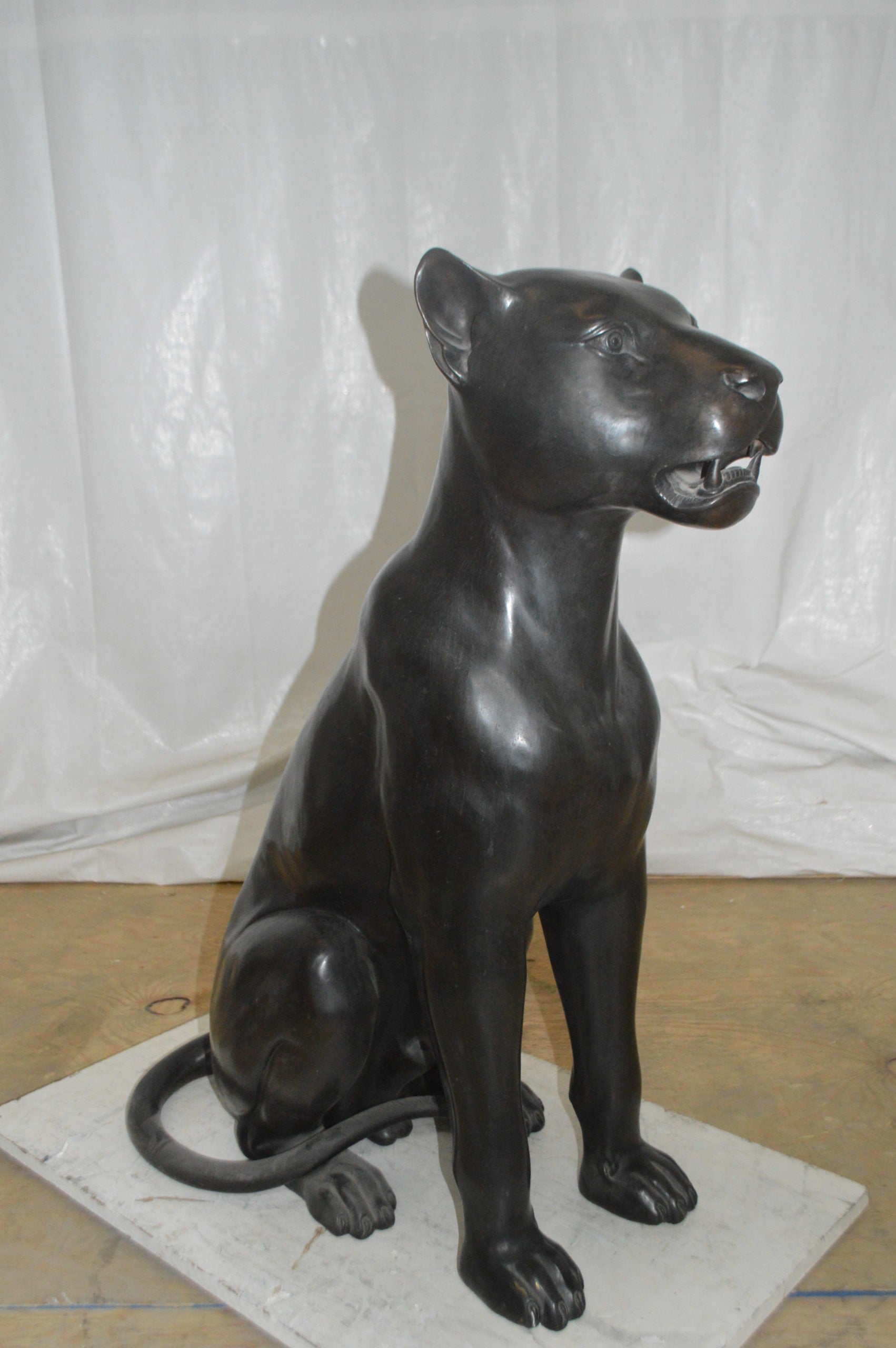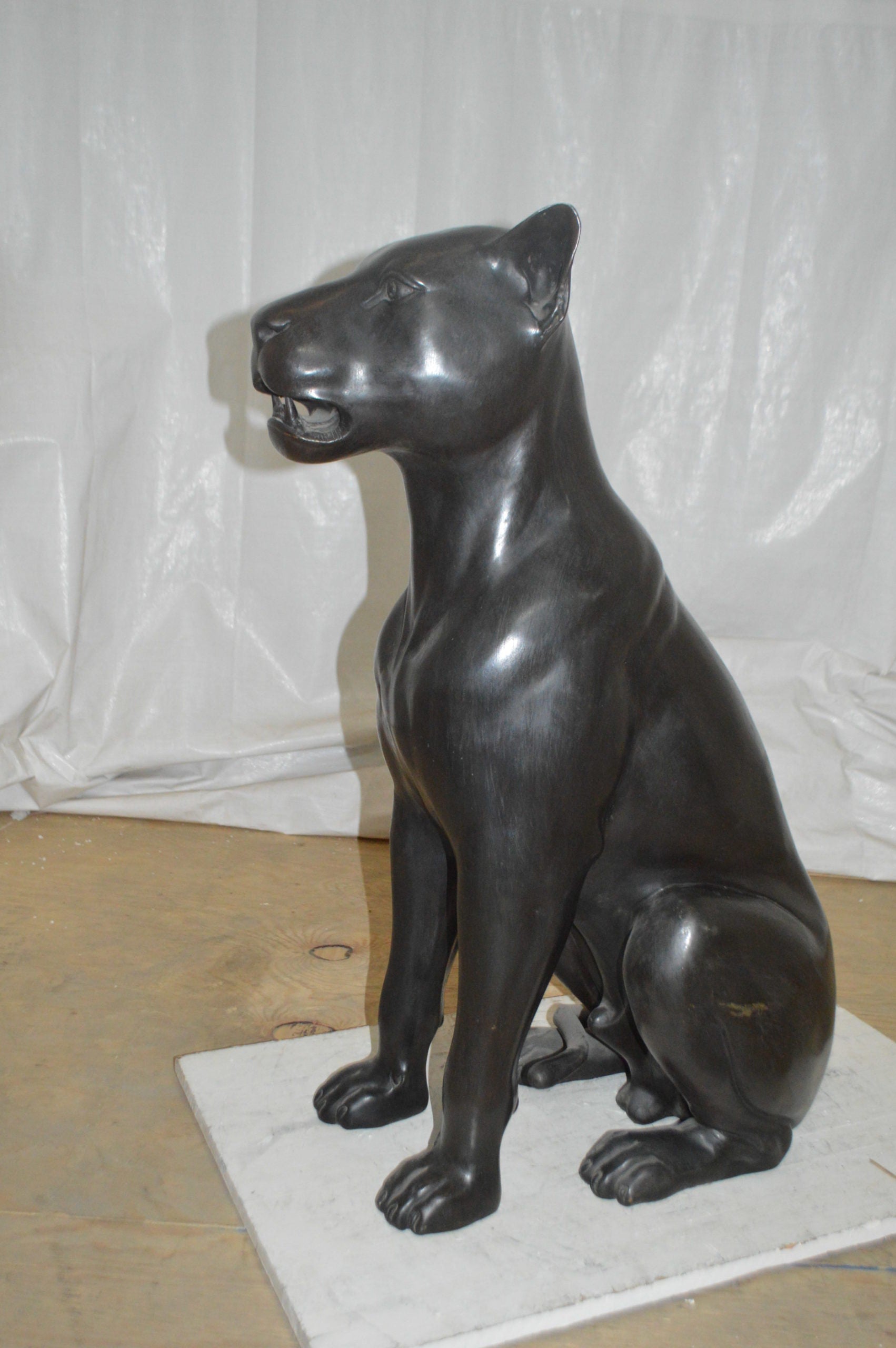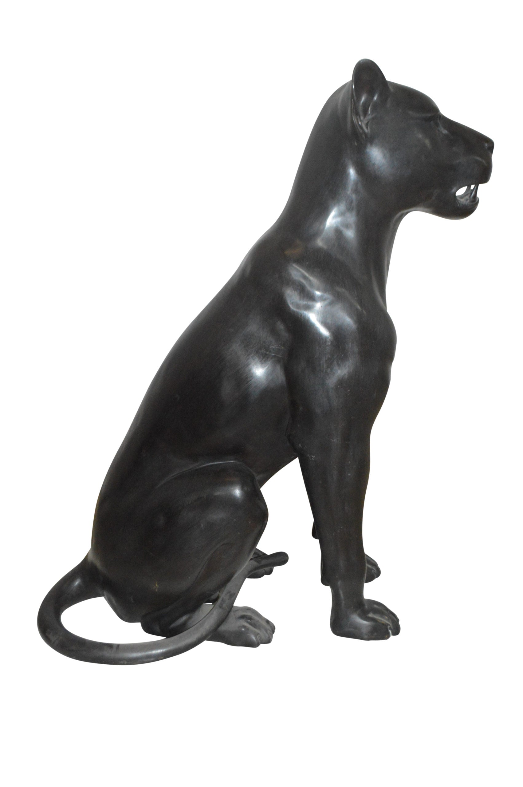 The black panther is a symbol of power in this bronze statue. Sitting on his hind legs, his gazes eagerly ahead of him ready to pound. This work of art would fit in well to any outdoor space or large room in need of a animal addition. Size: 32"L x 13"W x 36"H. Weight is: 92Lb