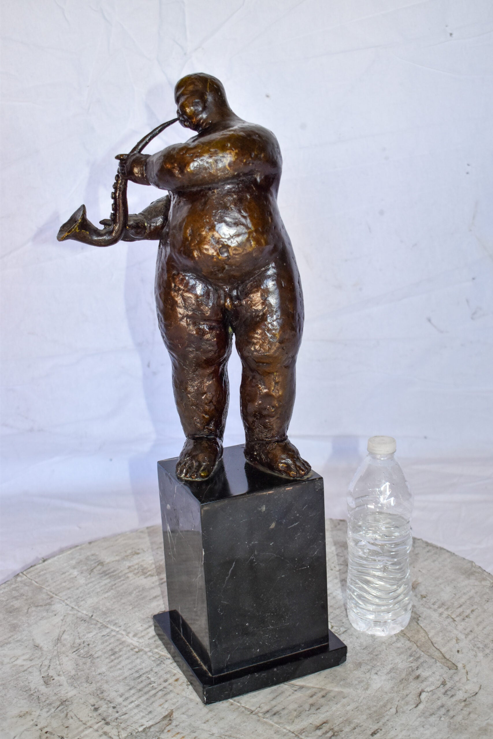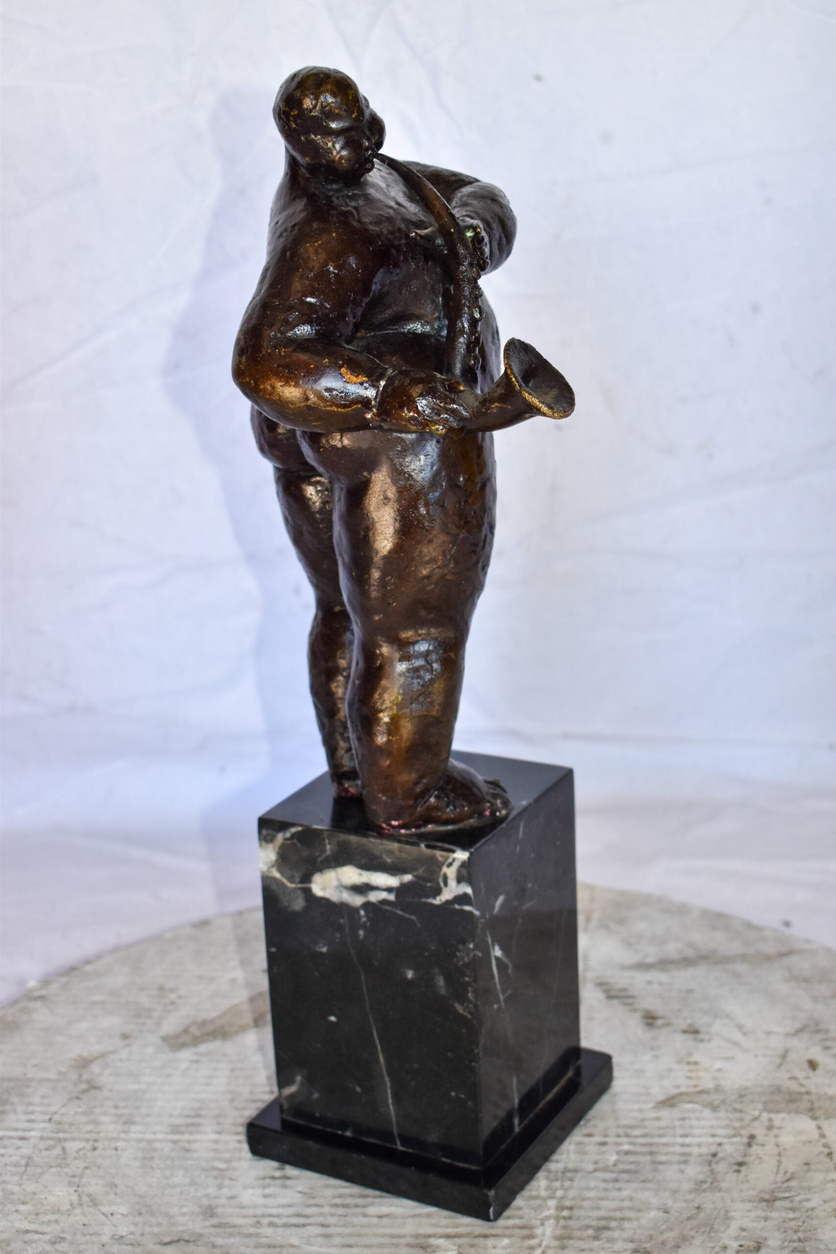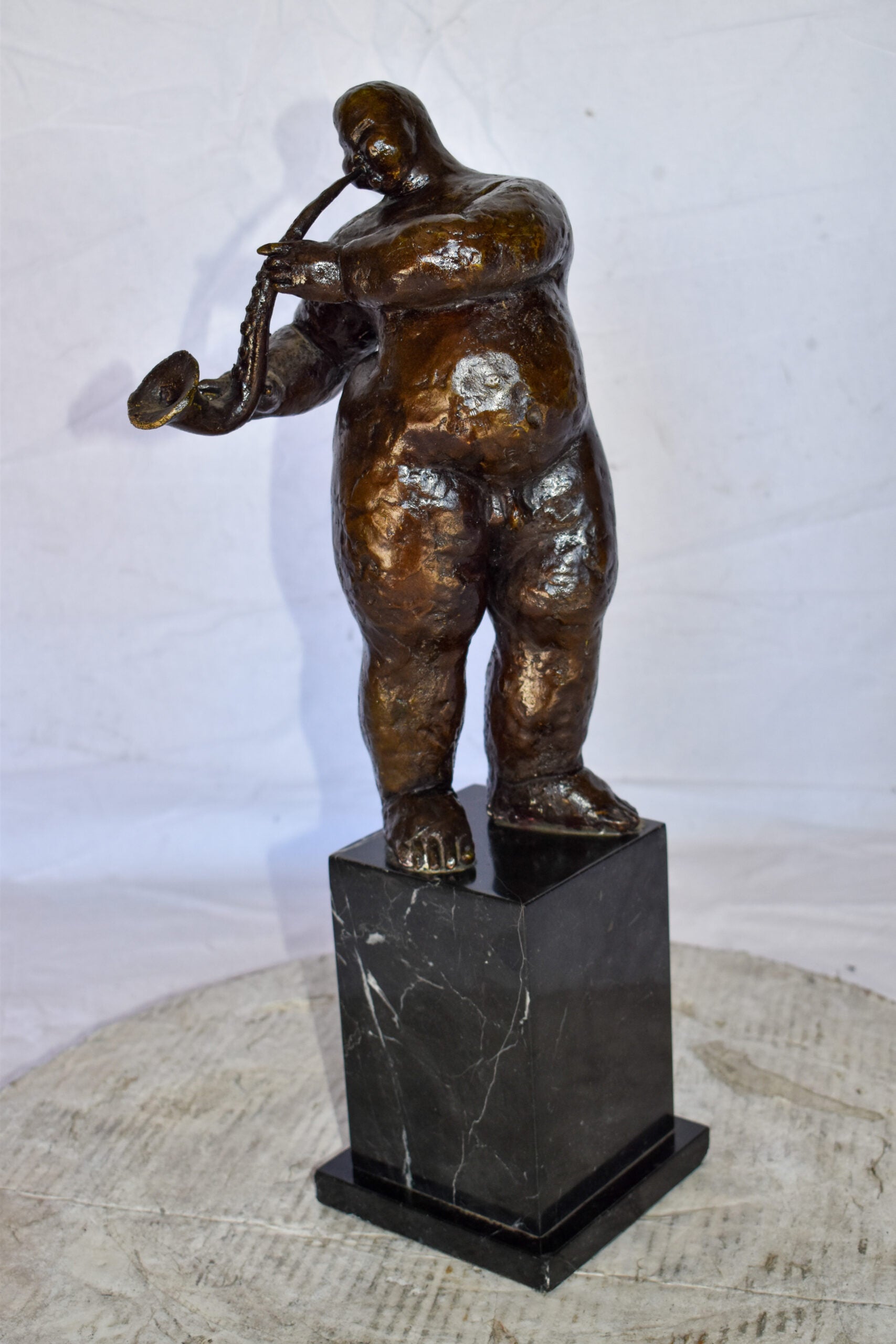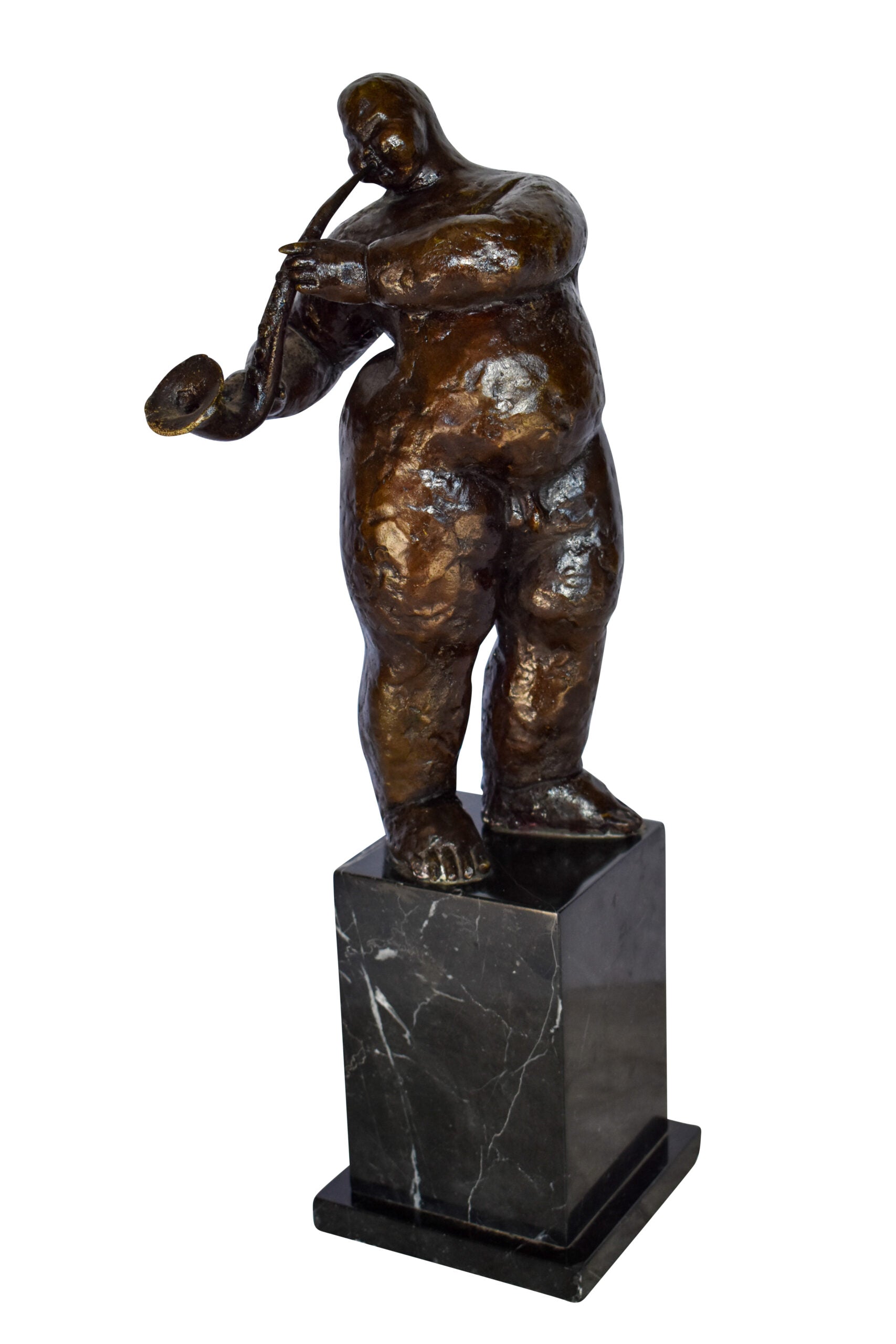 This proportionally exaggerated bronze sculpture is characteristic of Fernando Botero abstract and representational style. The fat man is playing the saxophone. The artist dramatic emphasis on shape and volume creates a great attraction and tangibility to form. The sculpture was molded using the lost-wax casting method and finished with brown patina. This is an exquisite three-dimensional work of art for anyone who is F. Botero enthusiast. Size: 7"L x 7"W x 23"H. Weight is: 28Lb