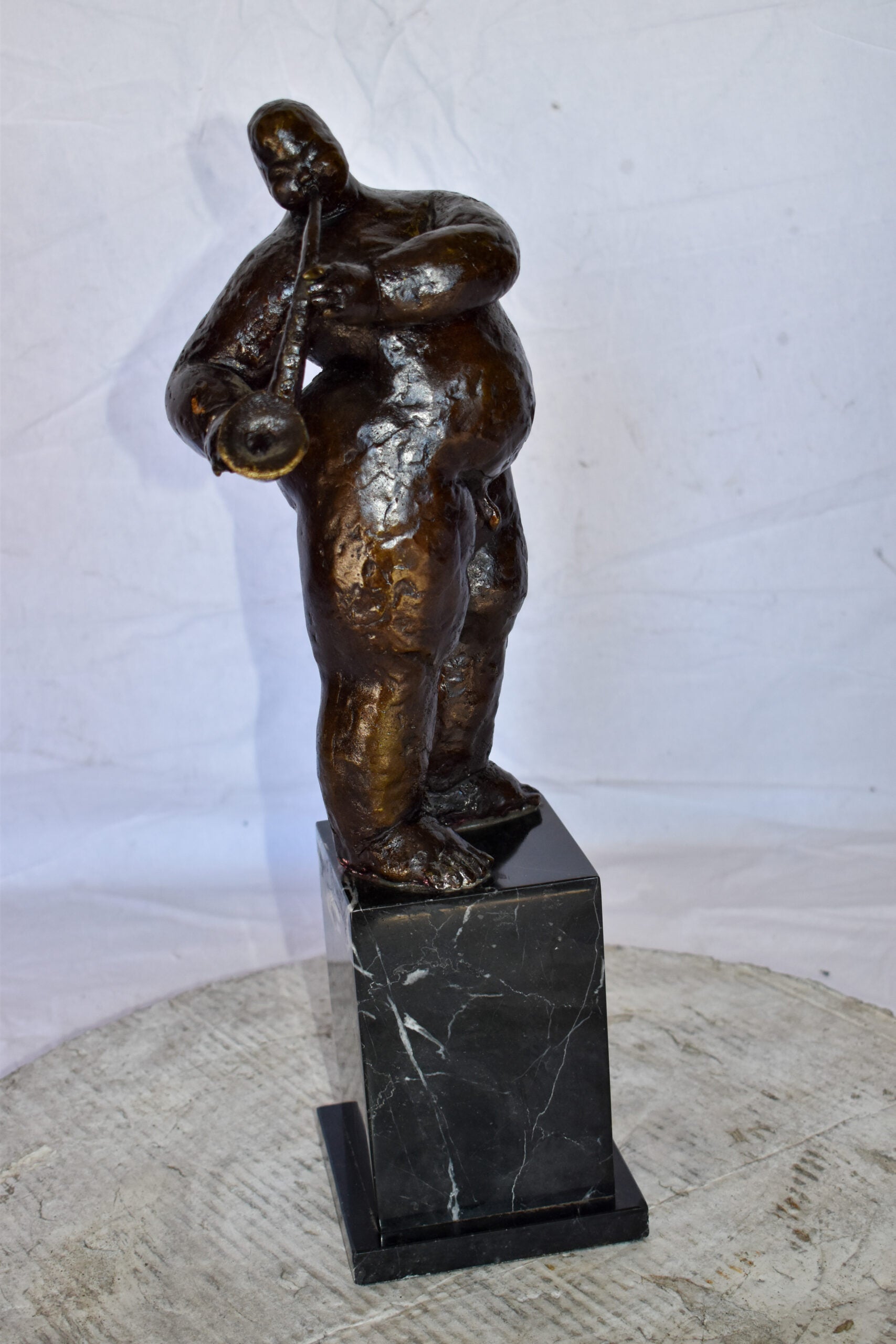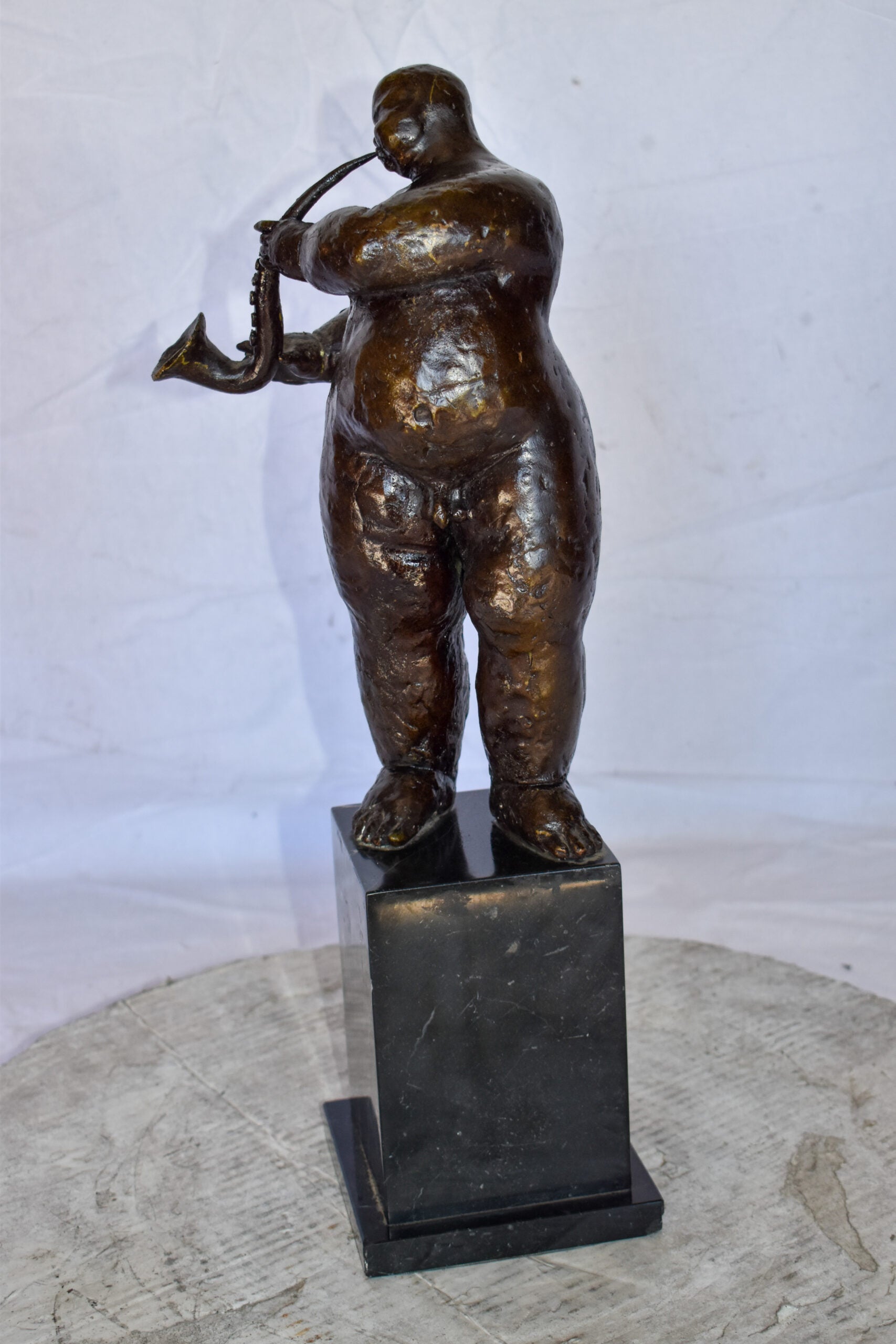 Botero Replica of Art Nude Man Playing Saxophone Bronze Statue 7" x 7" x 23"H