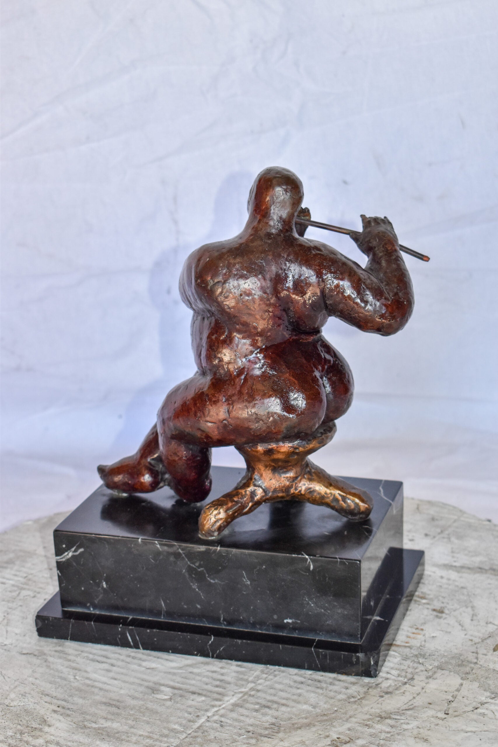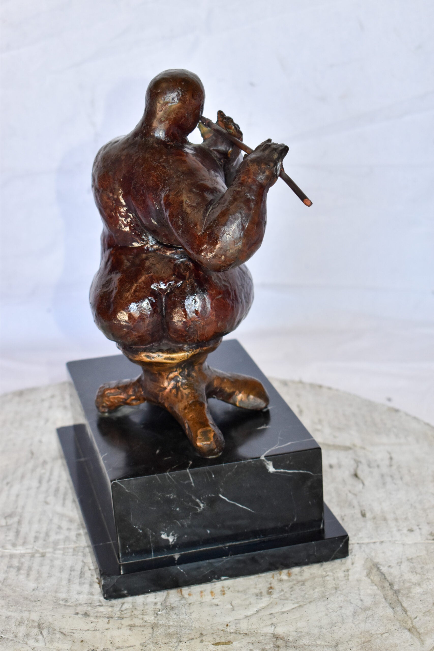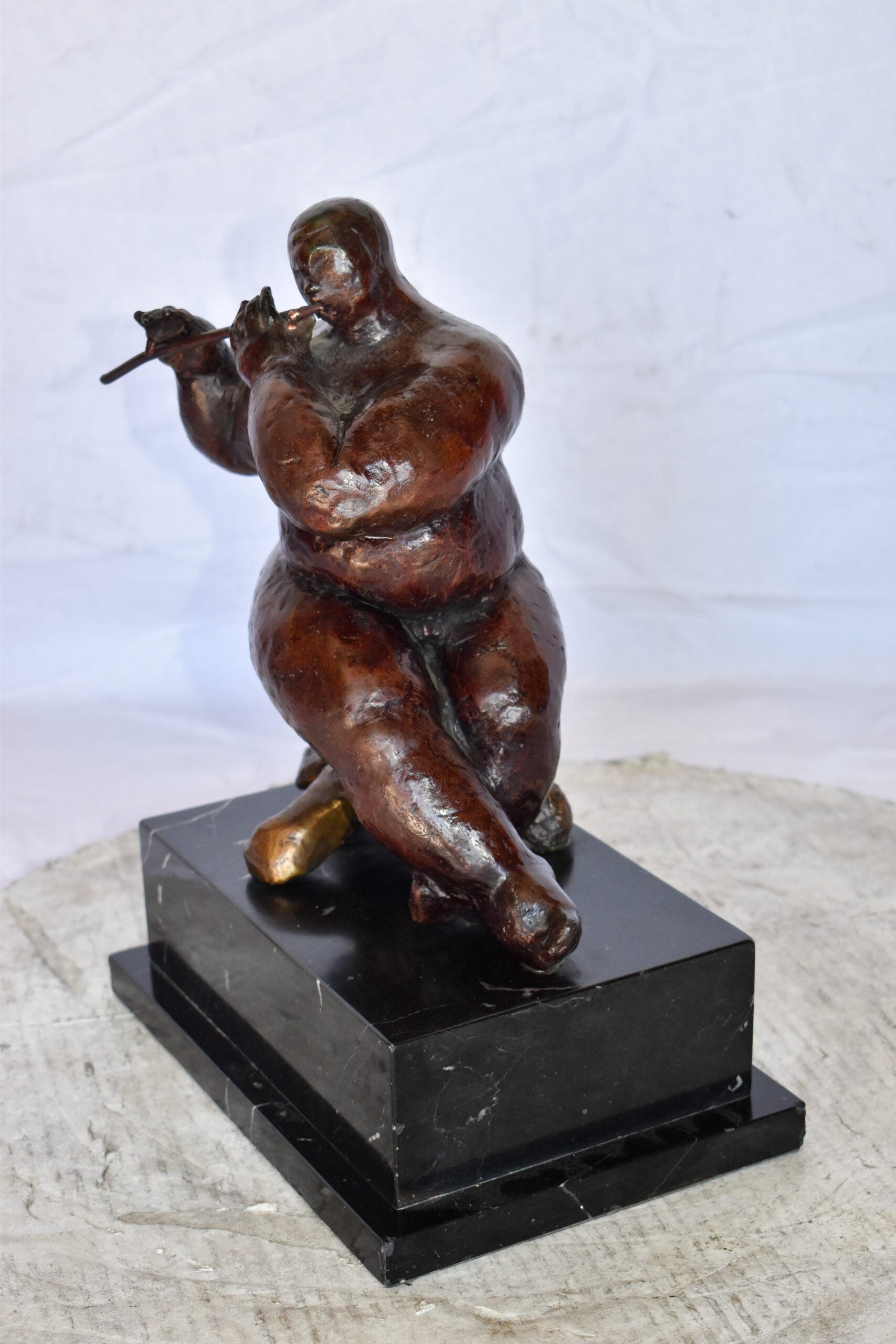 This proportionally exaggerated bronze sculpture is characteristic of Fernando Botero abstract and representational style. The fat man is playing the Flute. The artist dramatic emphasis on shape and volume creates a great attraction and tangibility to form. The sculpture was molded using the lost-wax casting method and finished with brown patina. This is an exquisite three-dimensional work of art for anyone who is F. Botero enthusiast. Size: 10"L x 7"W x 11"H. Weight is: 33Lb