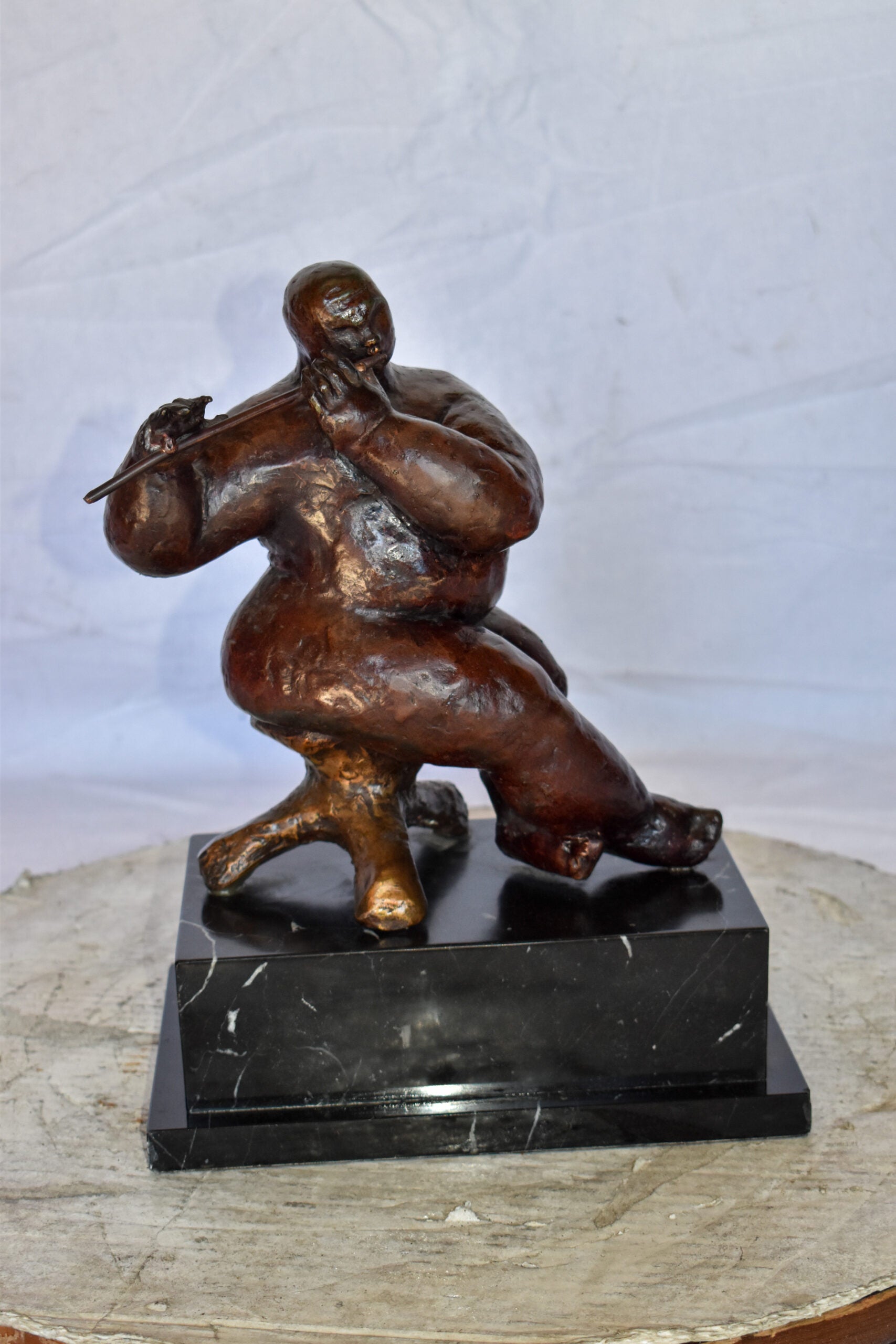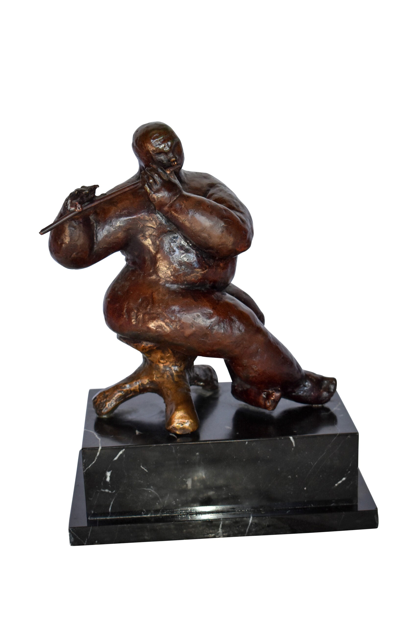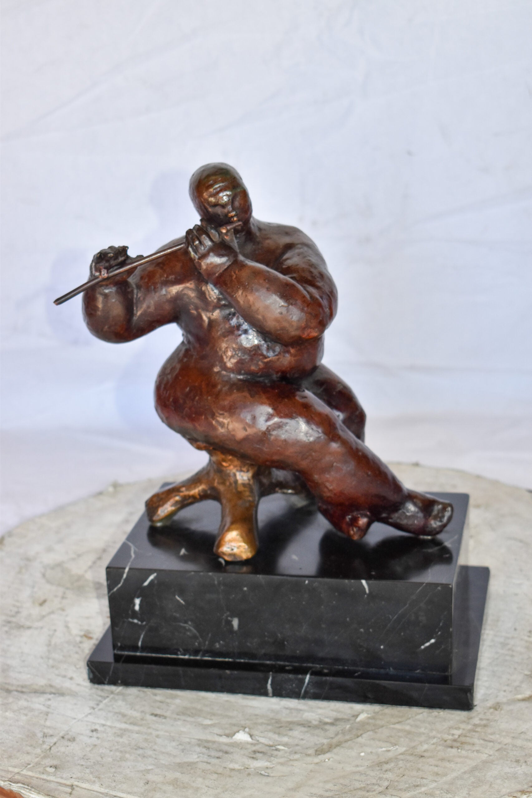 This proportionally exaggerated bronze sculpture is characteristic of Fernando Botero abstract and representational style. The fat man is playing the Flute. The artist dramatic emphasis on shape and volume creates a great attraction and tangibility to form. The sculpture was molded using the lost-wax casting method and finished with brown patina. This is an exquisite three-dimensional work of art for anyone who is F. Botero enthusiast. Size: 10"L x 7"W x 11"H. Weight is: 33Lb