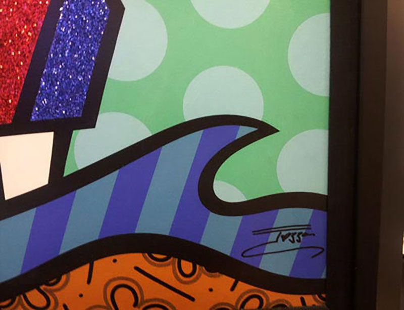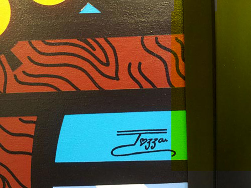 Boy and a Fish, A Wall Art Painting by Jozza, limited edition giclee on canvas, hand signed by artist. Jozza, born in 1958 in Hidrolandia, a small town located in central Brazil, one of the most exciting Pop Artists in the world, creates his artistic vision with vibrant imagery and combinations of bright color and hard-edged abstract. This artwork comes framed. Image Size: 32x32.