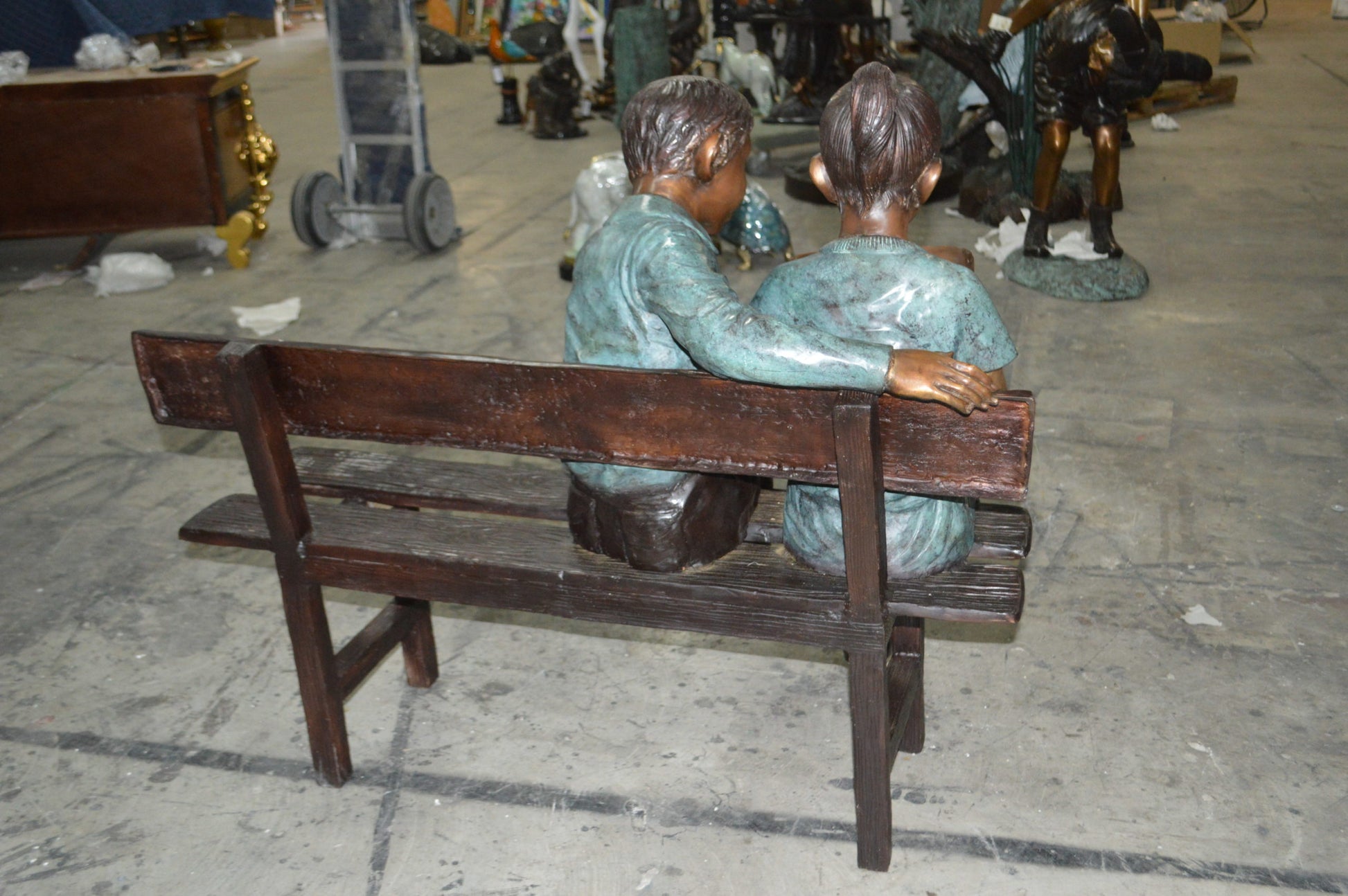 Magnificent large size bronze statue of a young boy and a girl sitting on a bench and reading a book. The joy of youth, lost in a book and putting thoughts to paper, will make your landscape come alive. (Girl reading a book on a bench is available). Size: 43"L x 20"W x 36"H. Weight is: 150Lb