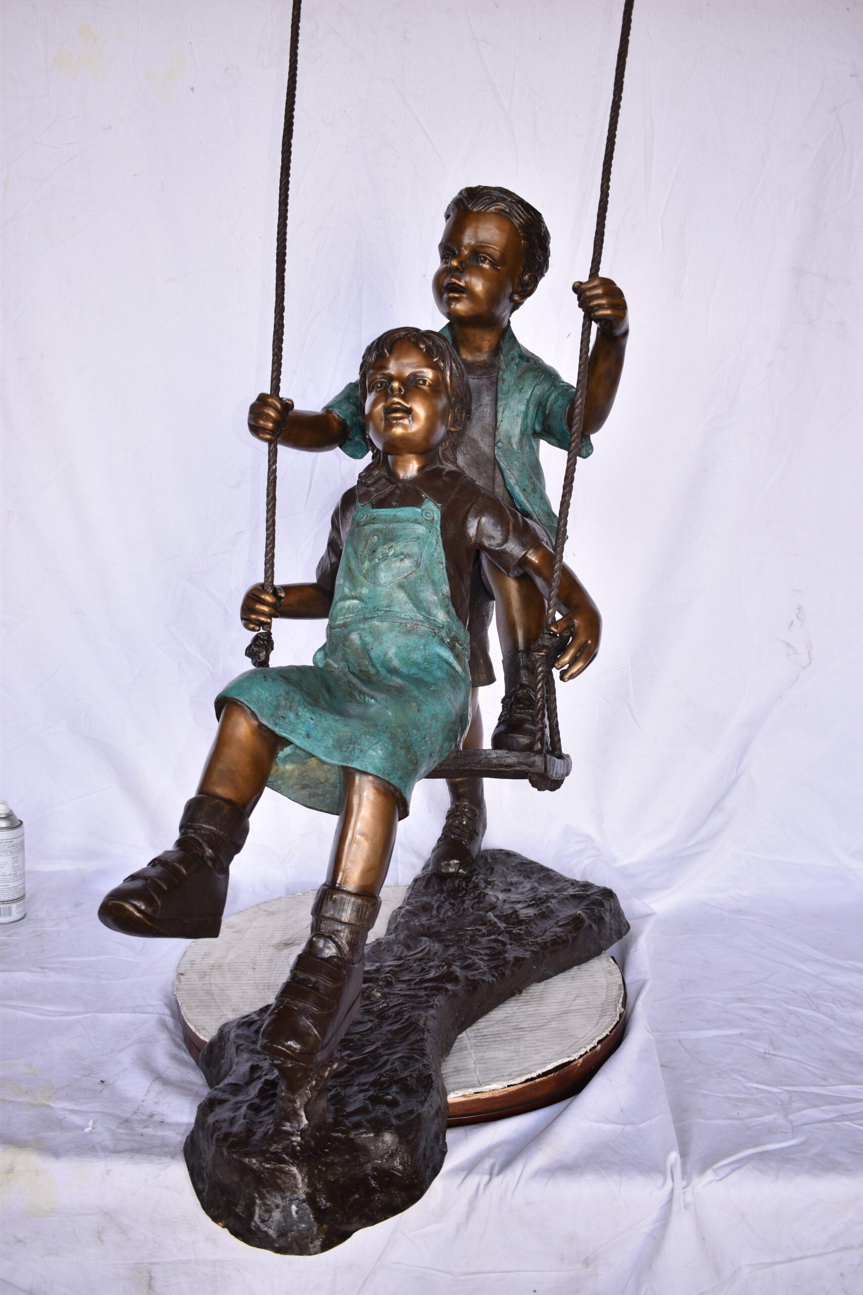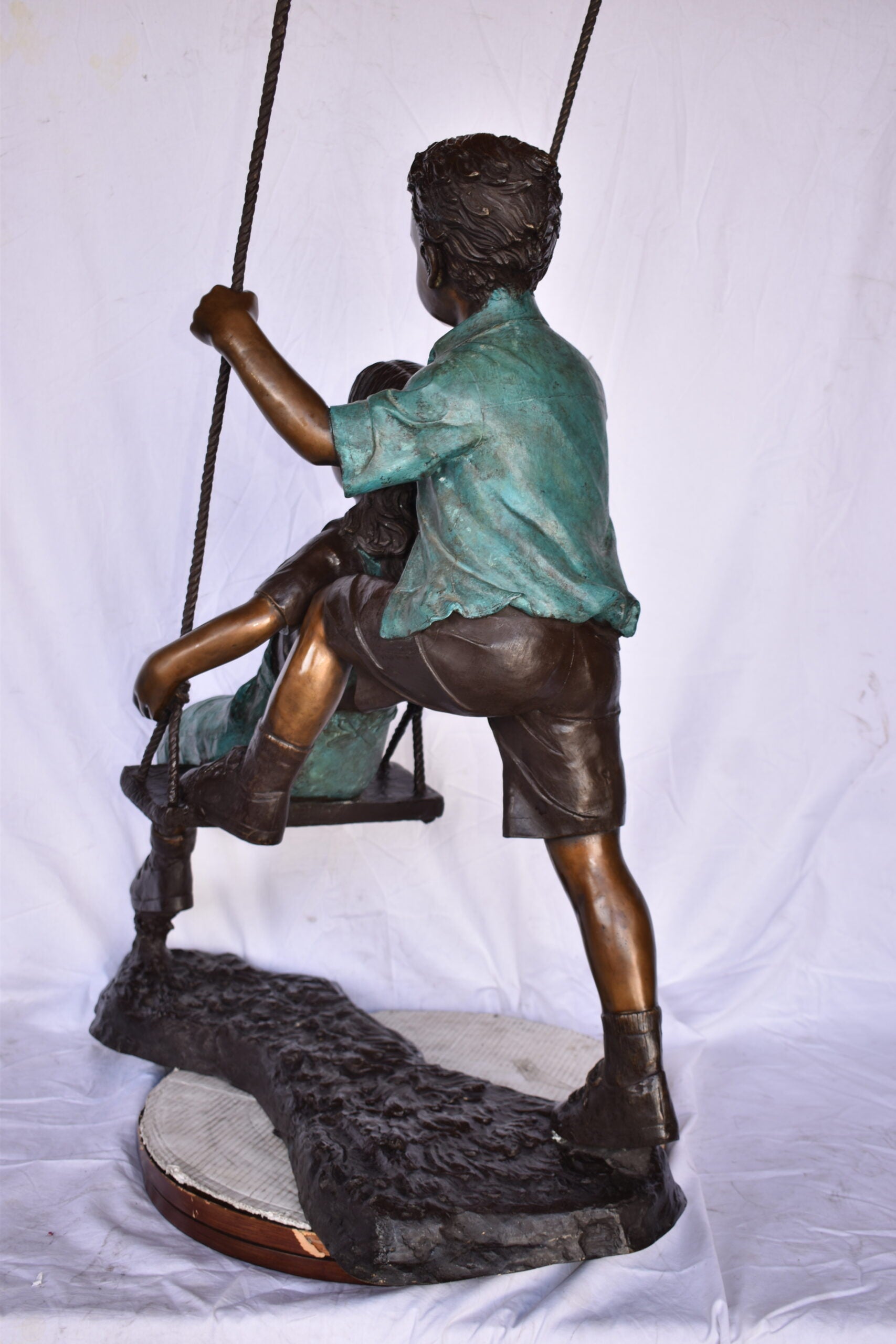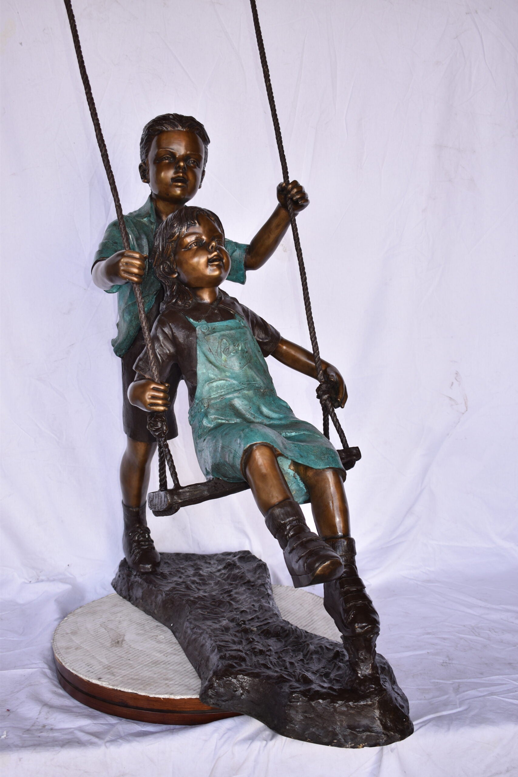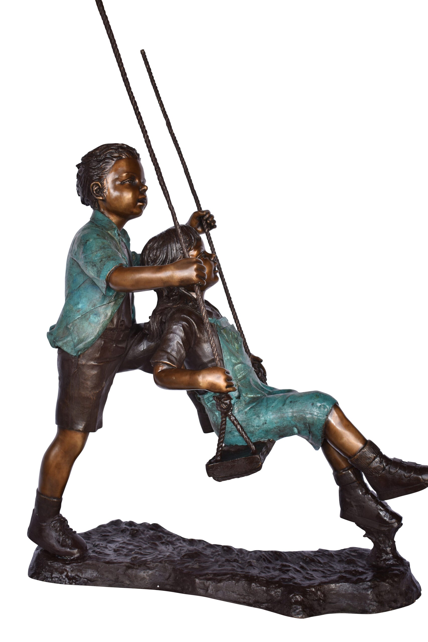 Boy and Girl Playing on a Swing bronze Statue - Size: 39"L x 17"W x 53"H.