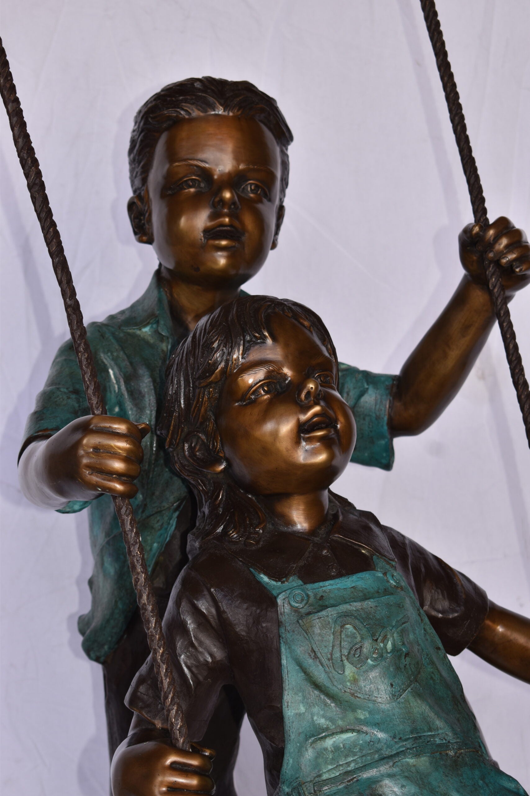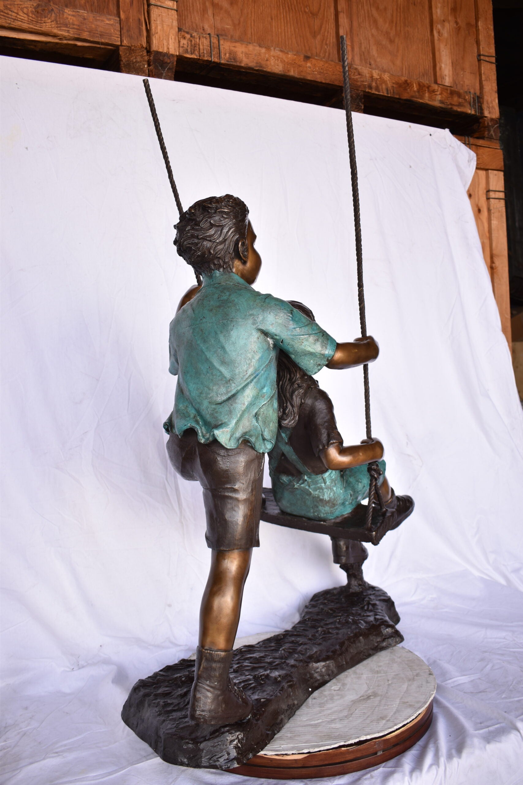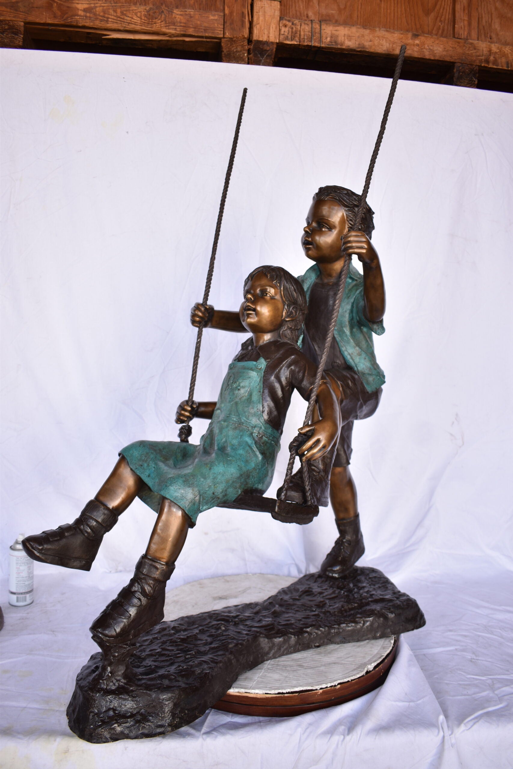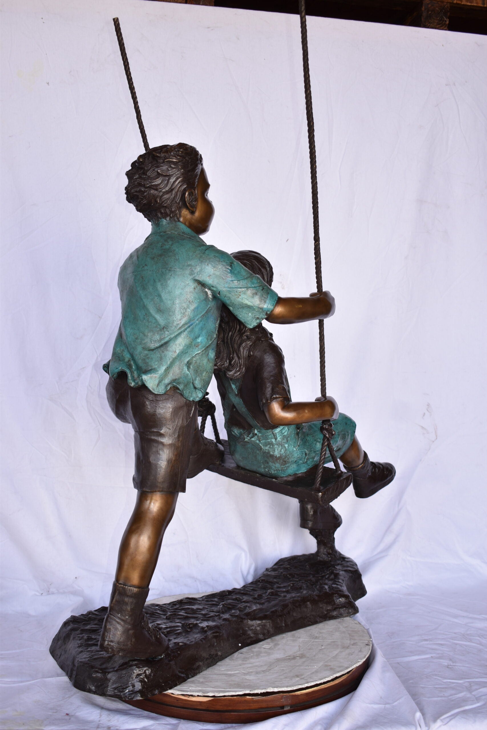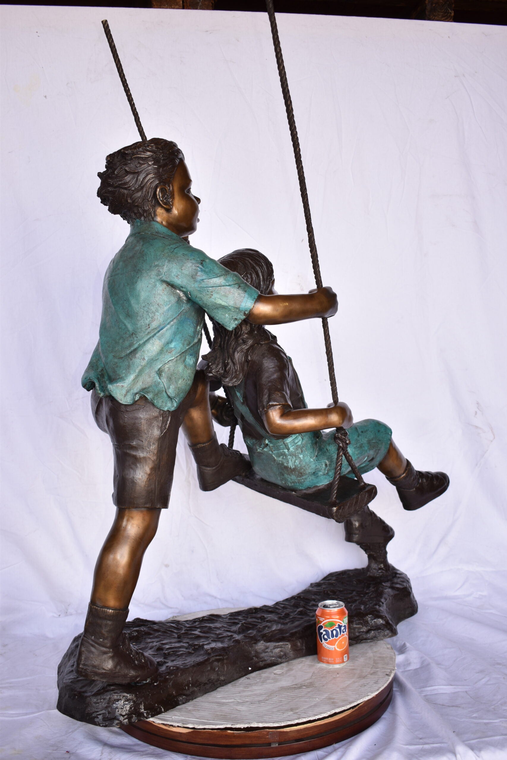 Boy and Girl Playing on a Swing bronze Statue - Size: 39"L x 17"W x 53"H.