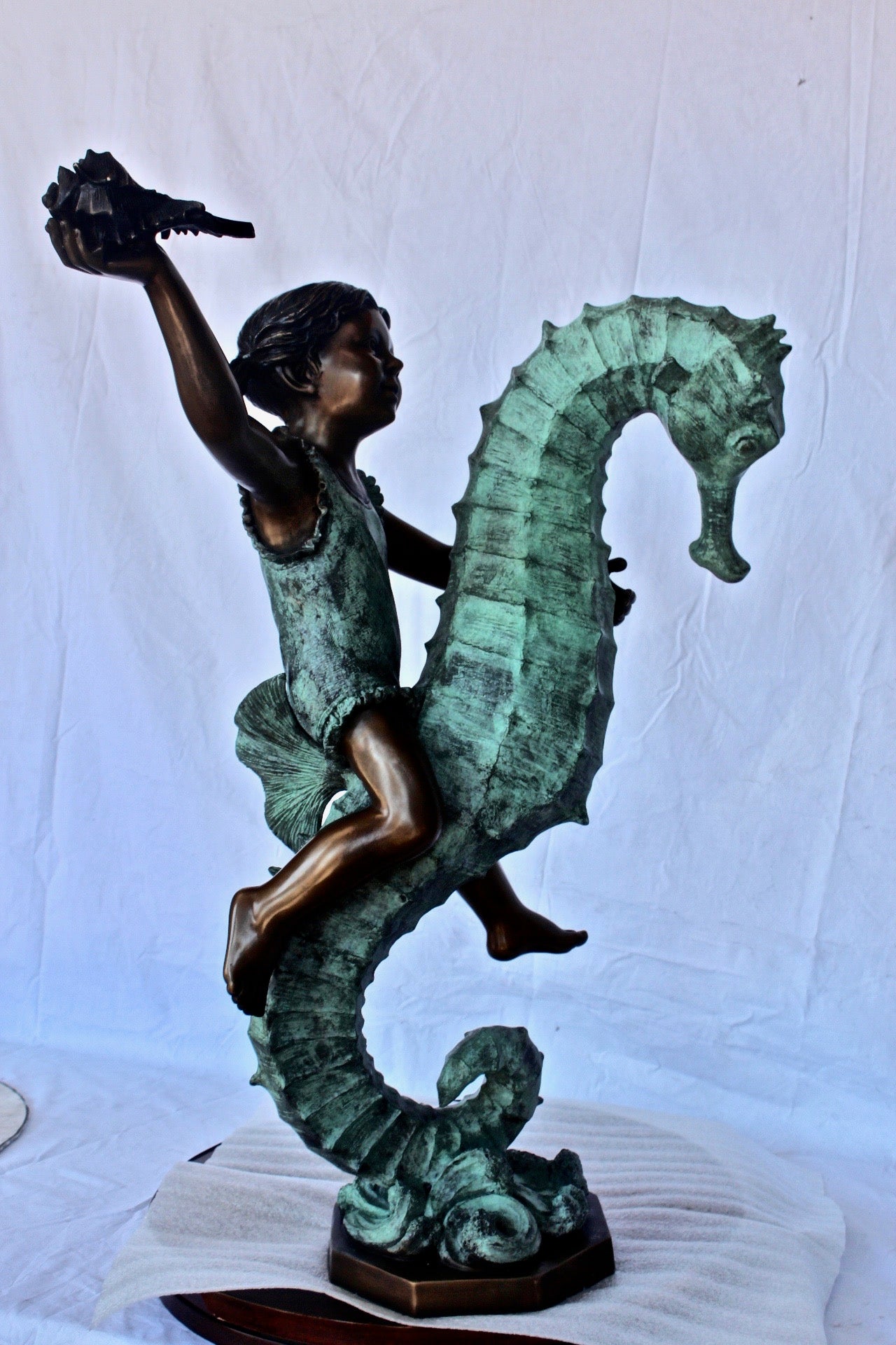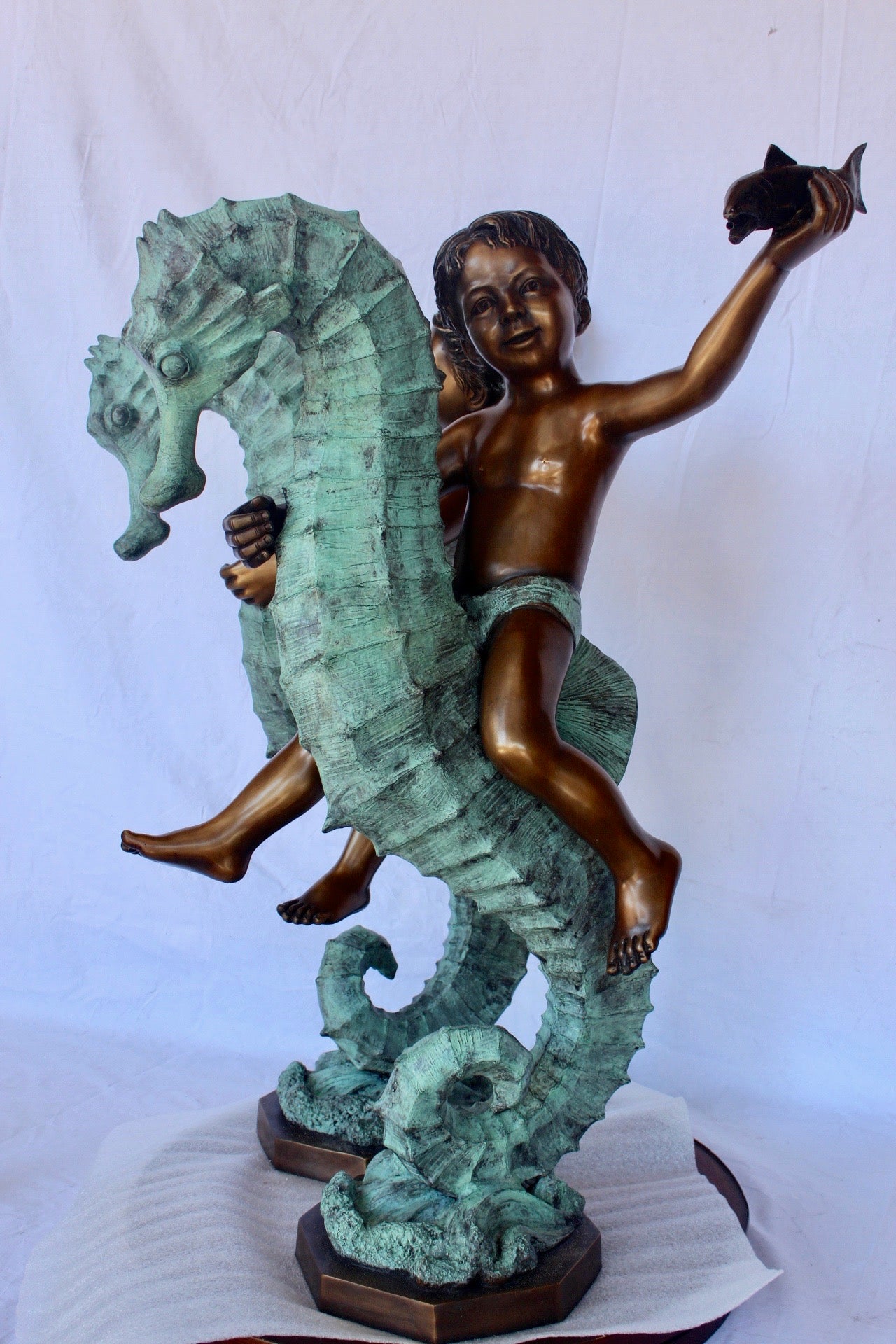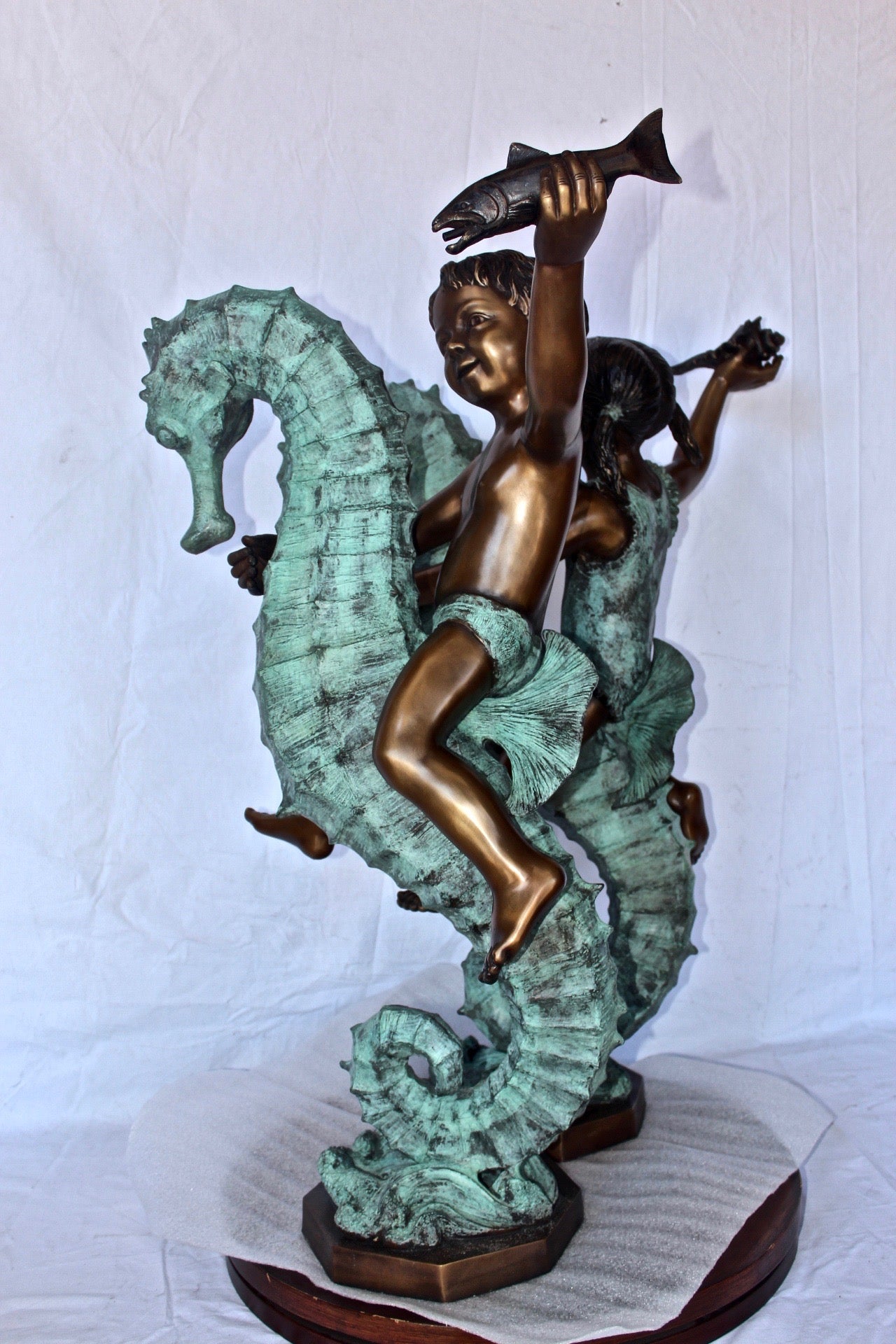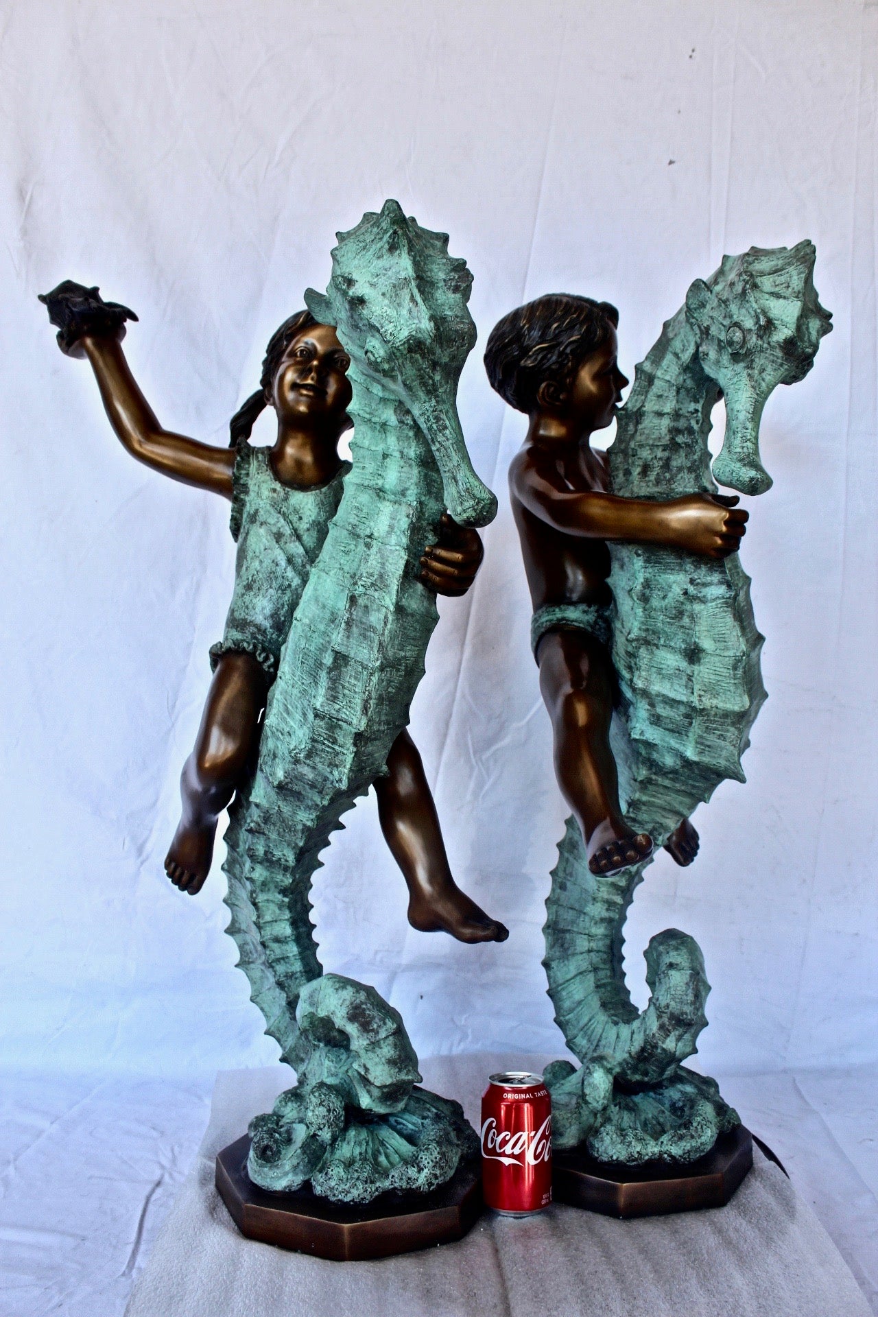 Boy and girl riding seahorses bronze fountain - Size: 18"L x 23"W x 38"H.