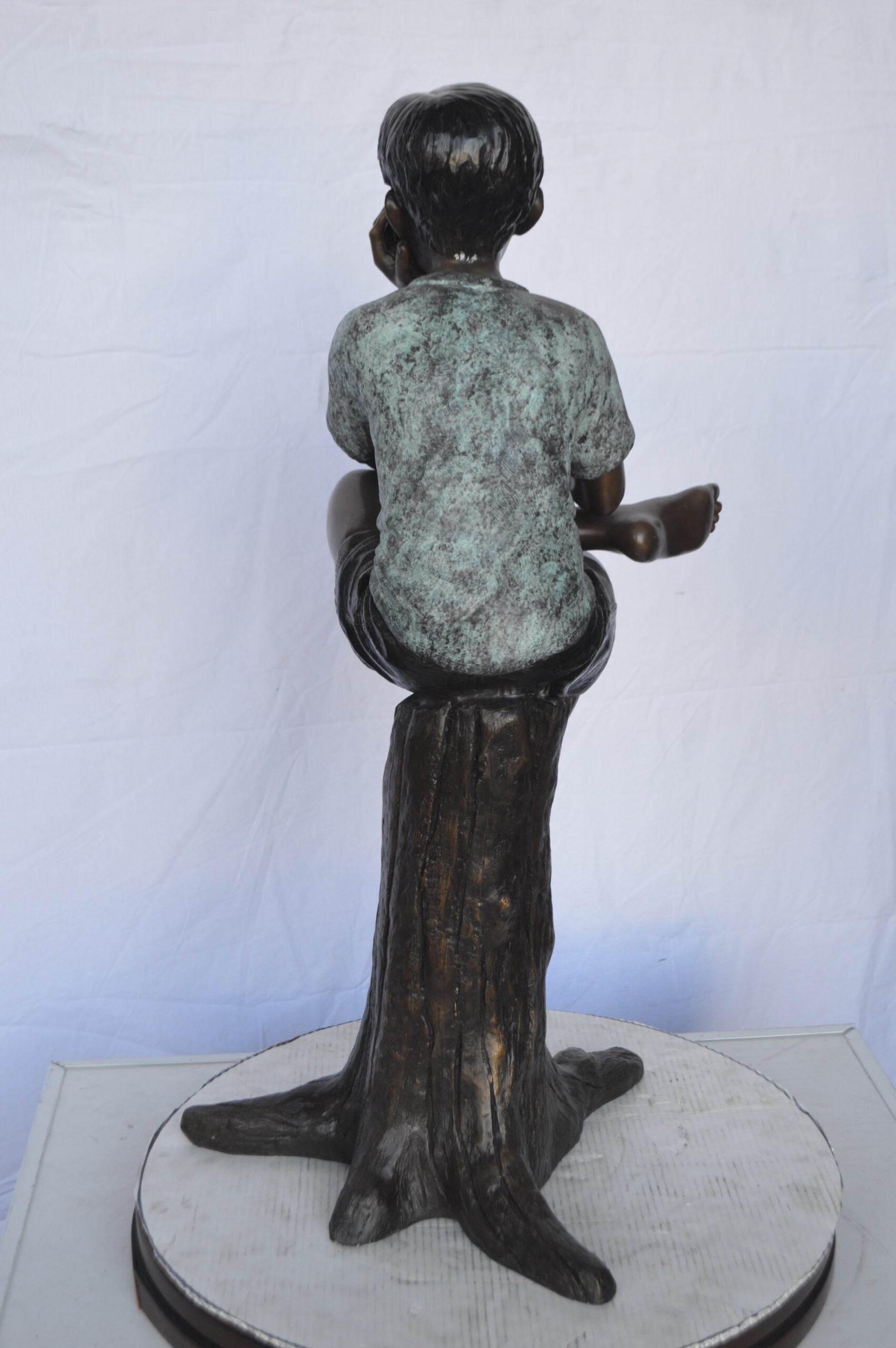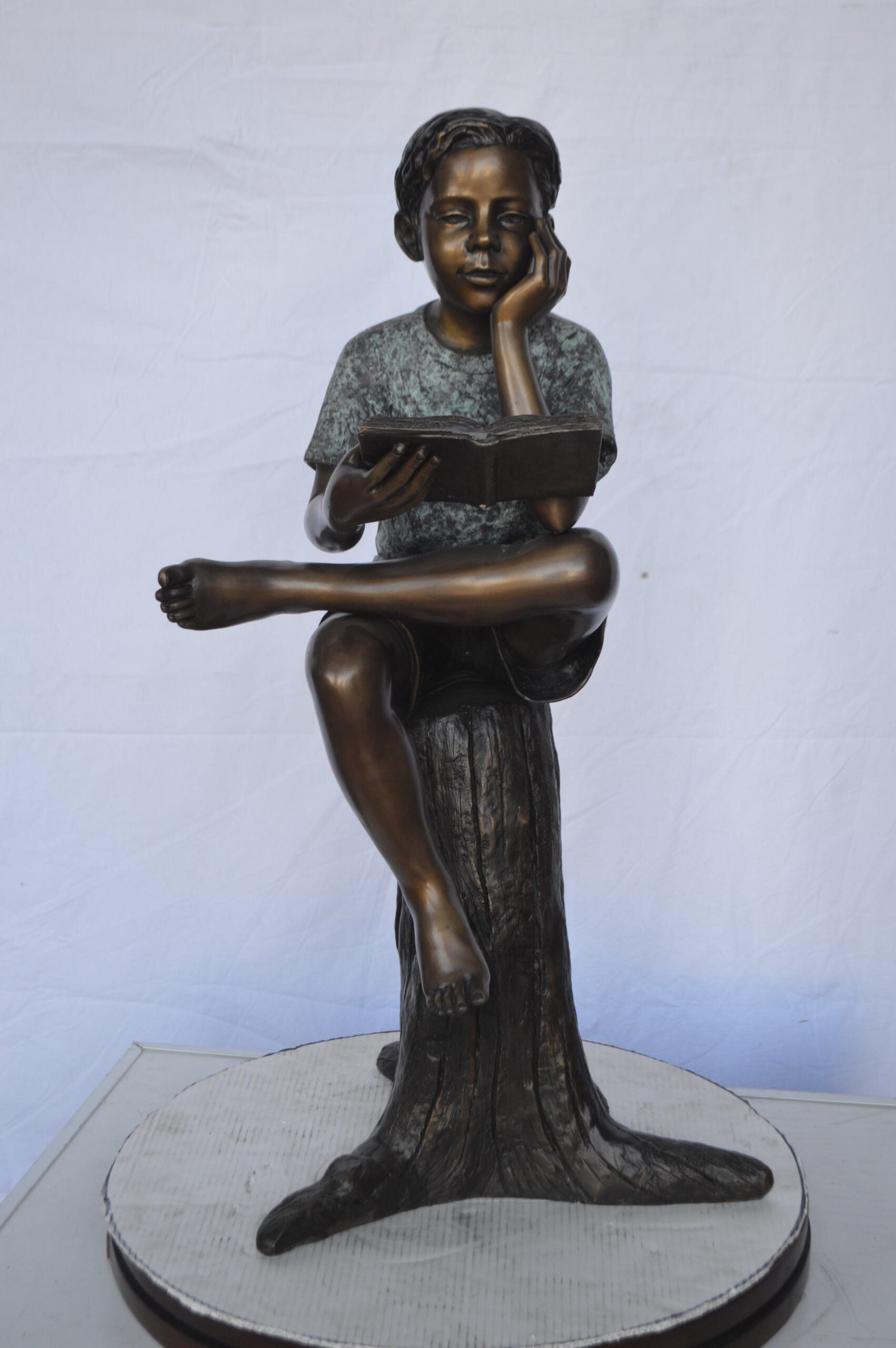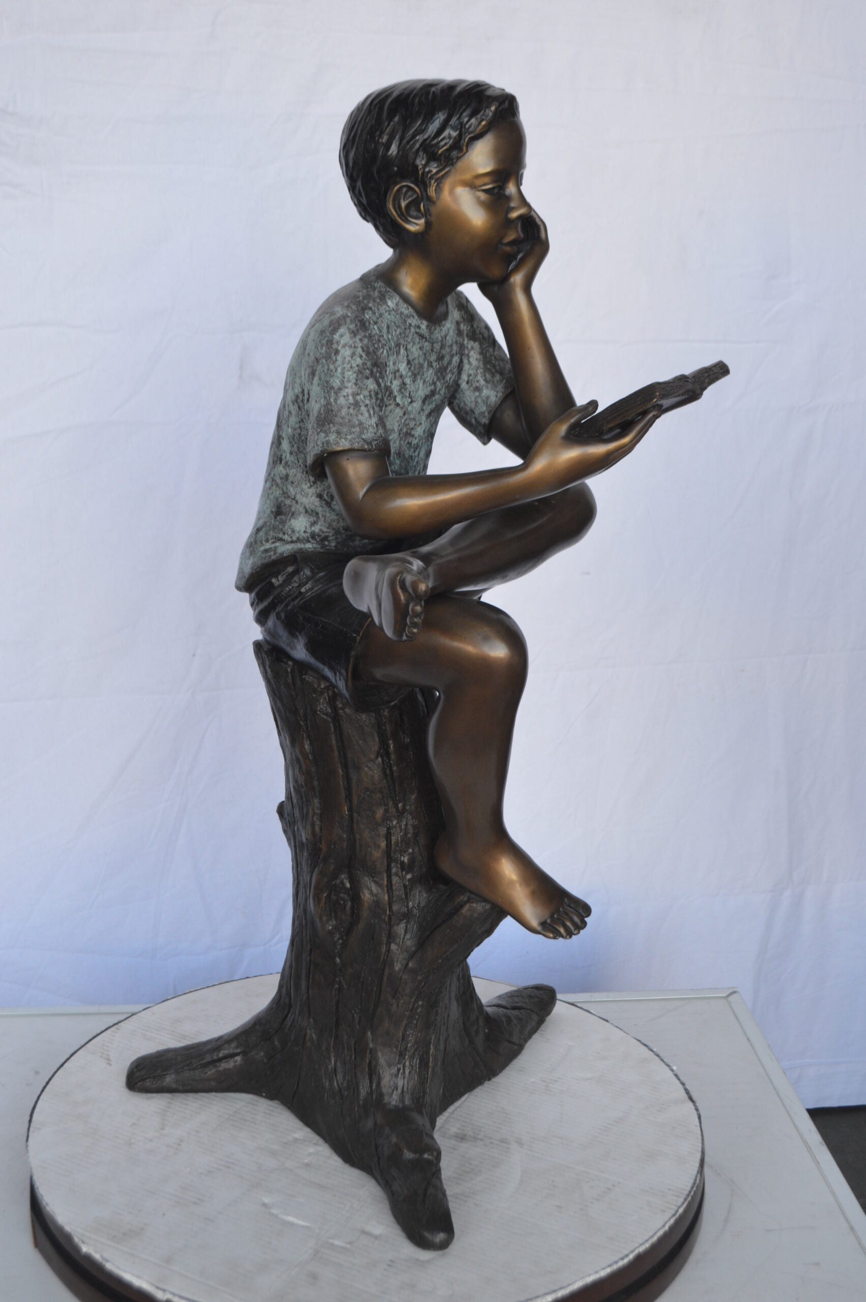 Magnificent large size bronze of a boy sitting on a tree stump outside and reading a book. The joy of youth, lost in a book and putting thoughts to paper, will make your landscape come alive. The Sculpture tones are finished in a lacquer patina on a heavy bronze base. This is a perfect addition to a home, and reminds us of the simple things in life. Size: 18"L x 20"W x 35"H. Weight is: 37Lb