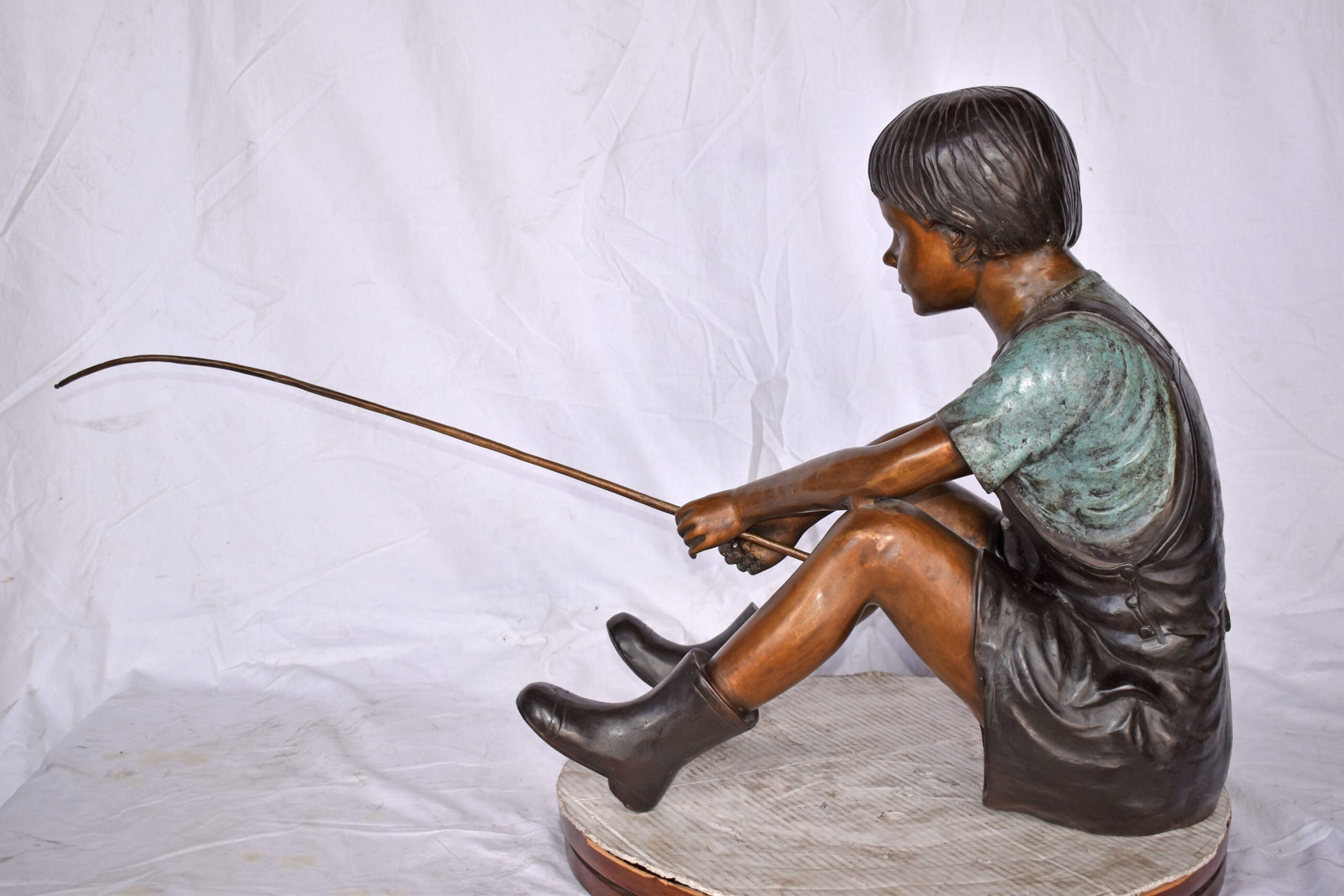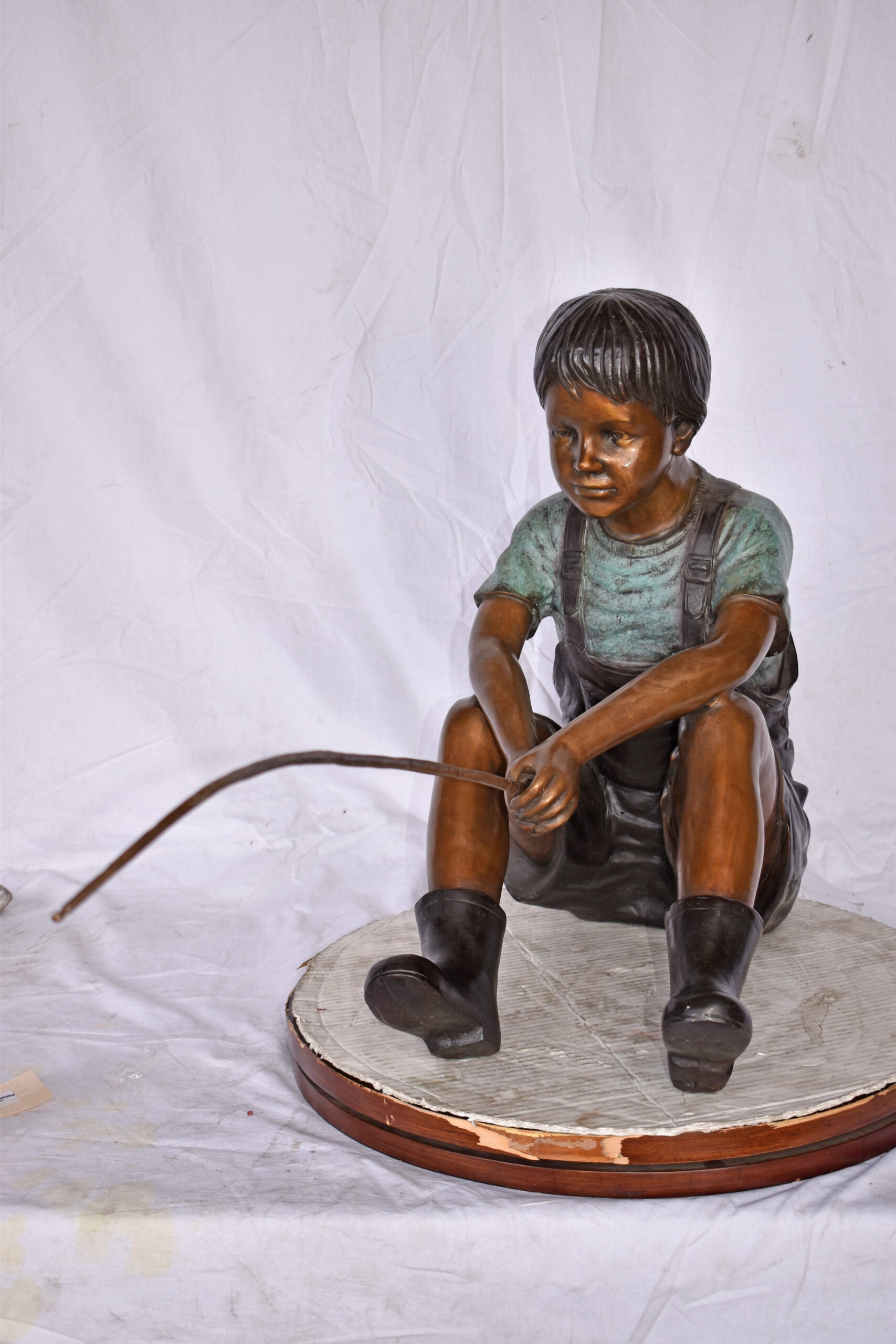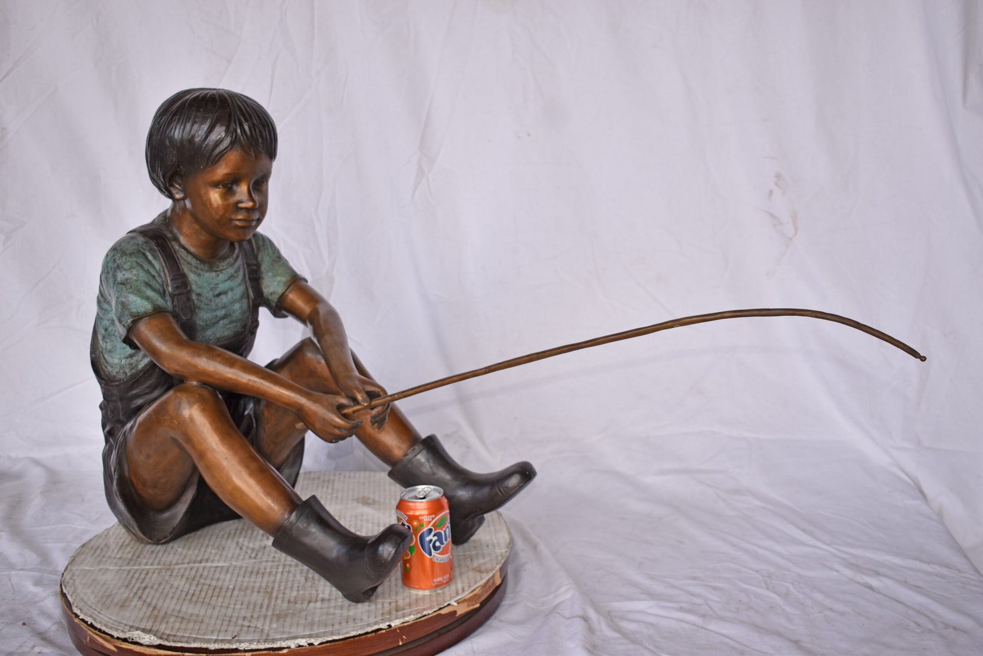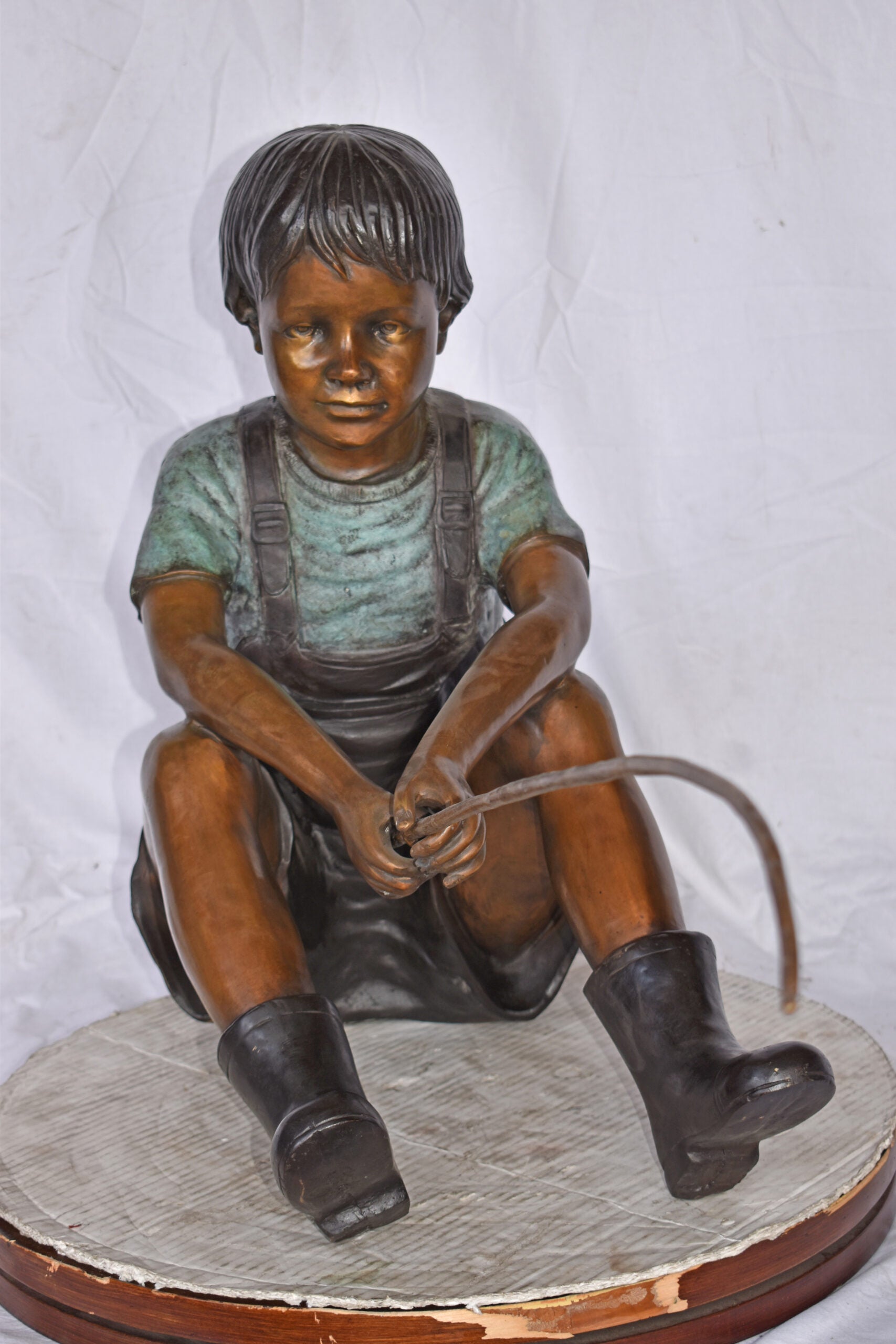 Boy Sitting on the Ground, Fishing Bronze Statue - Size: 26"L x 15"W x 25"H.
