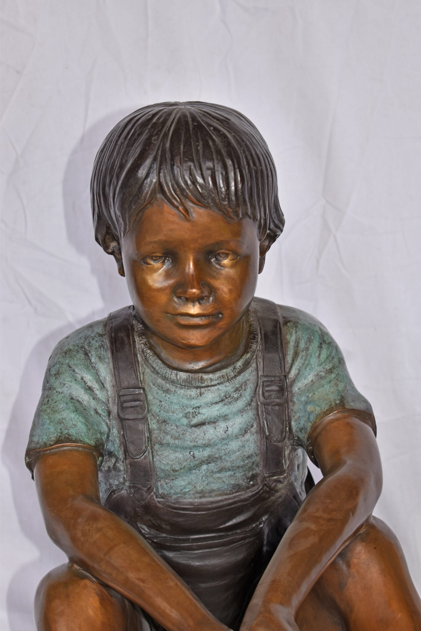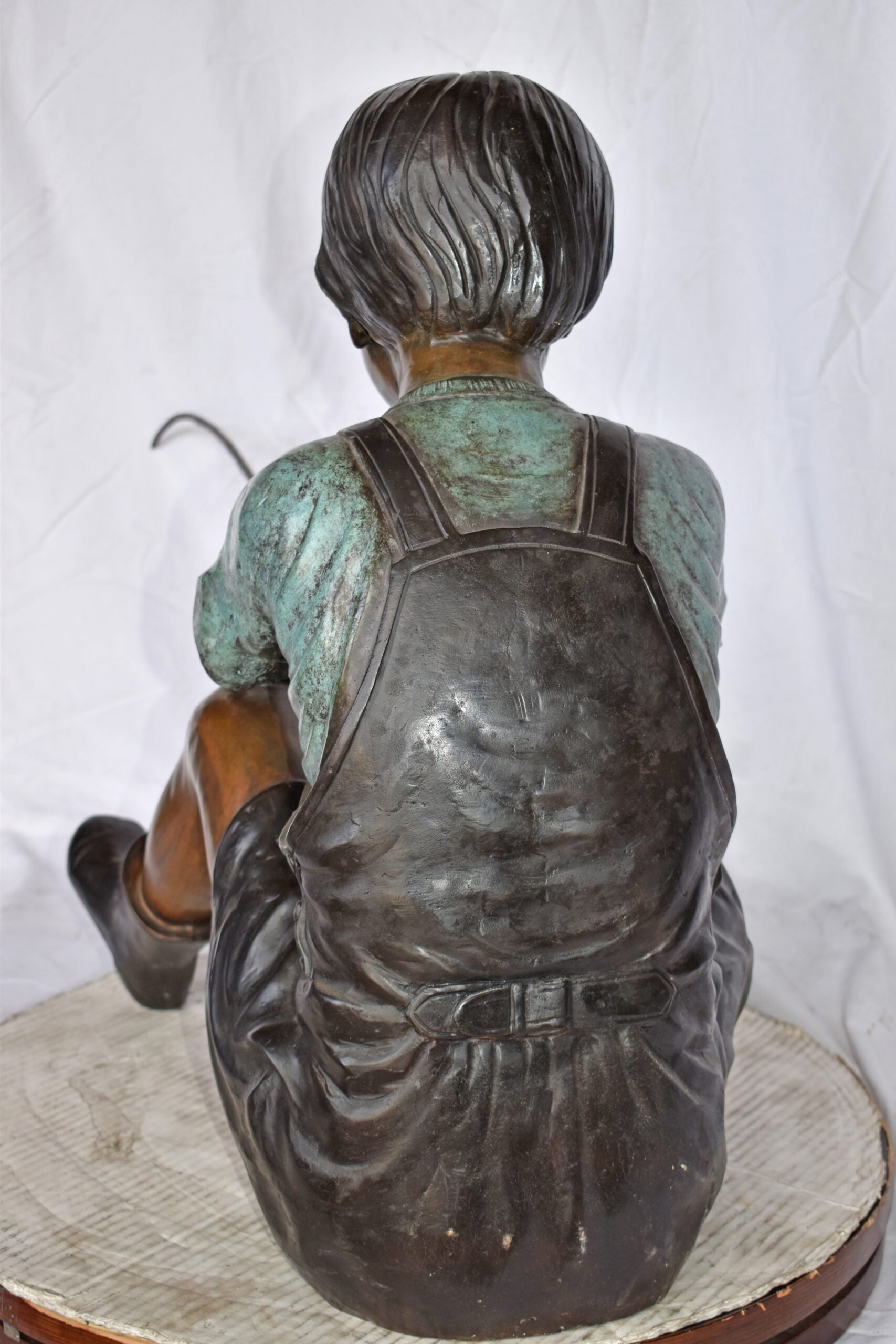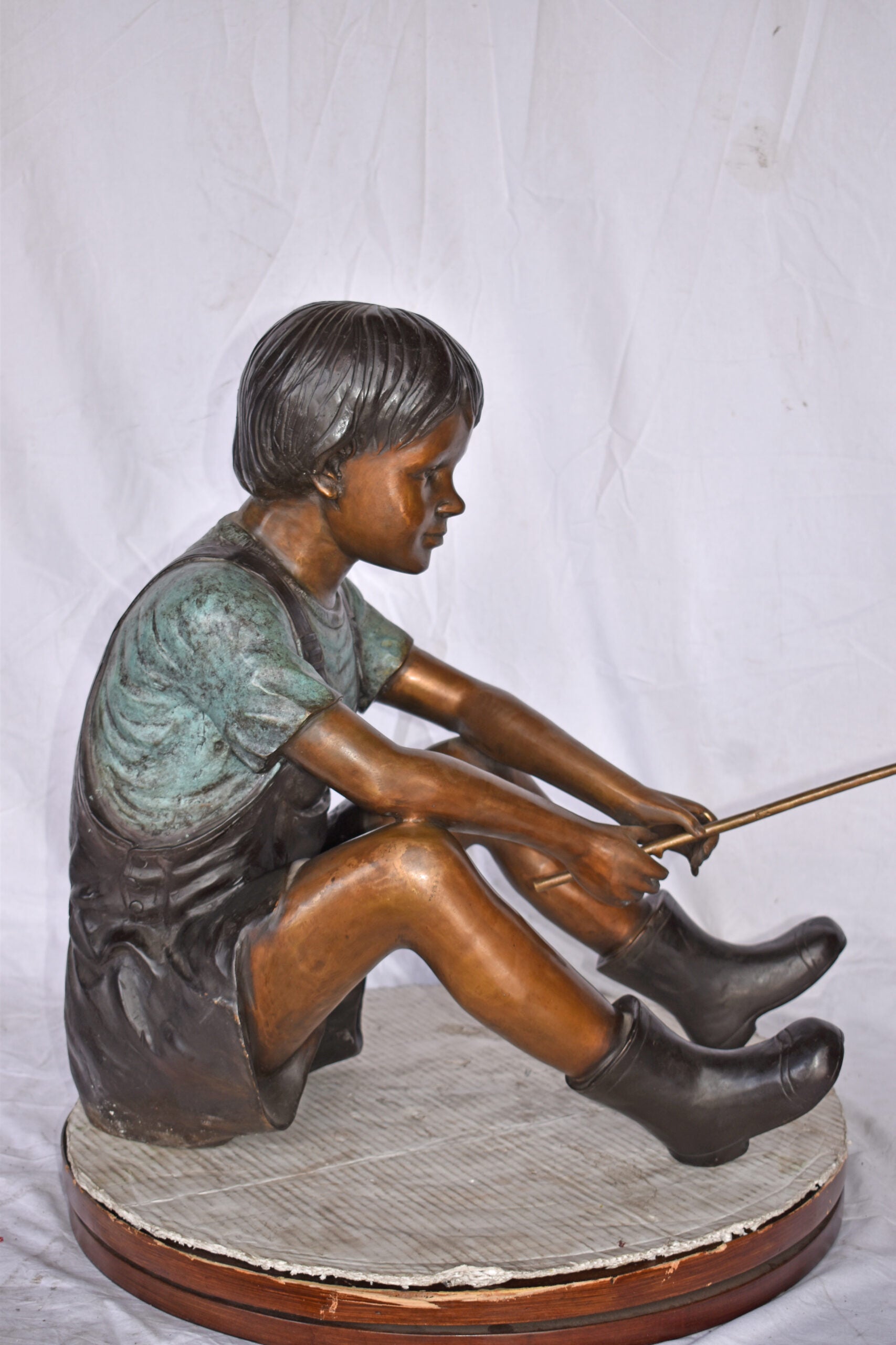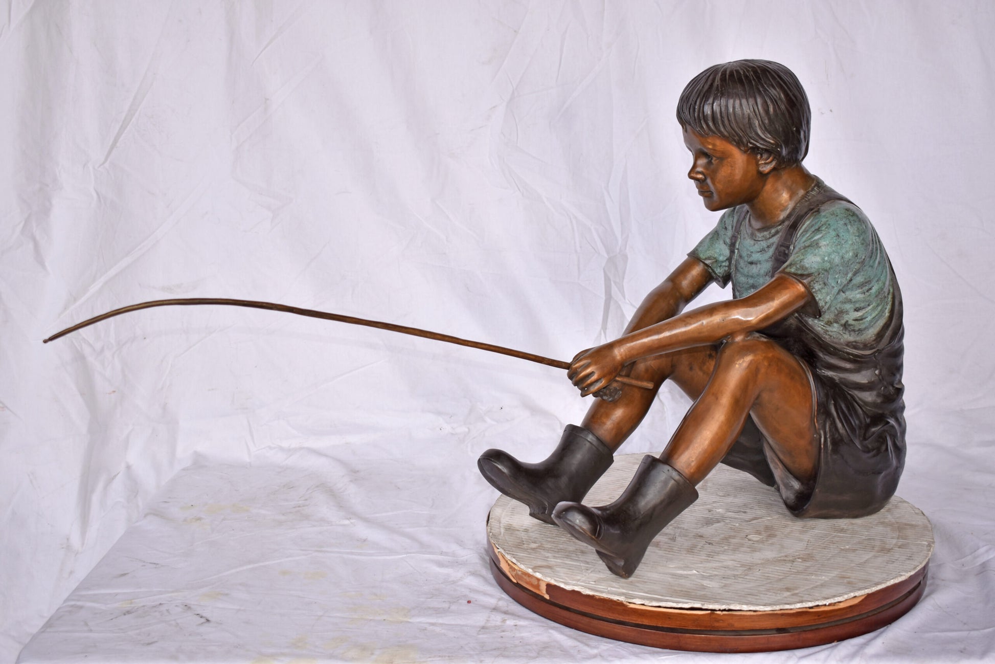 Boy Sitting on the Ground, Fishing Bronze Statue - Size: 26"L x 15"W x 25"H.