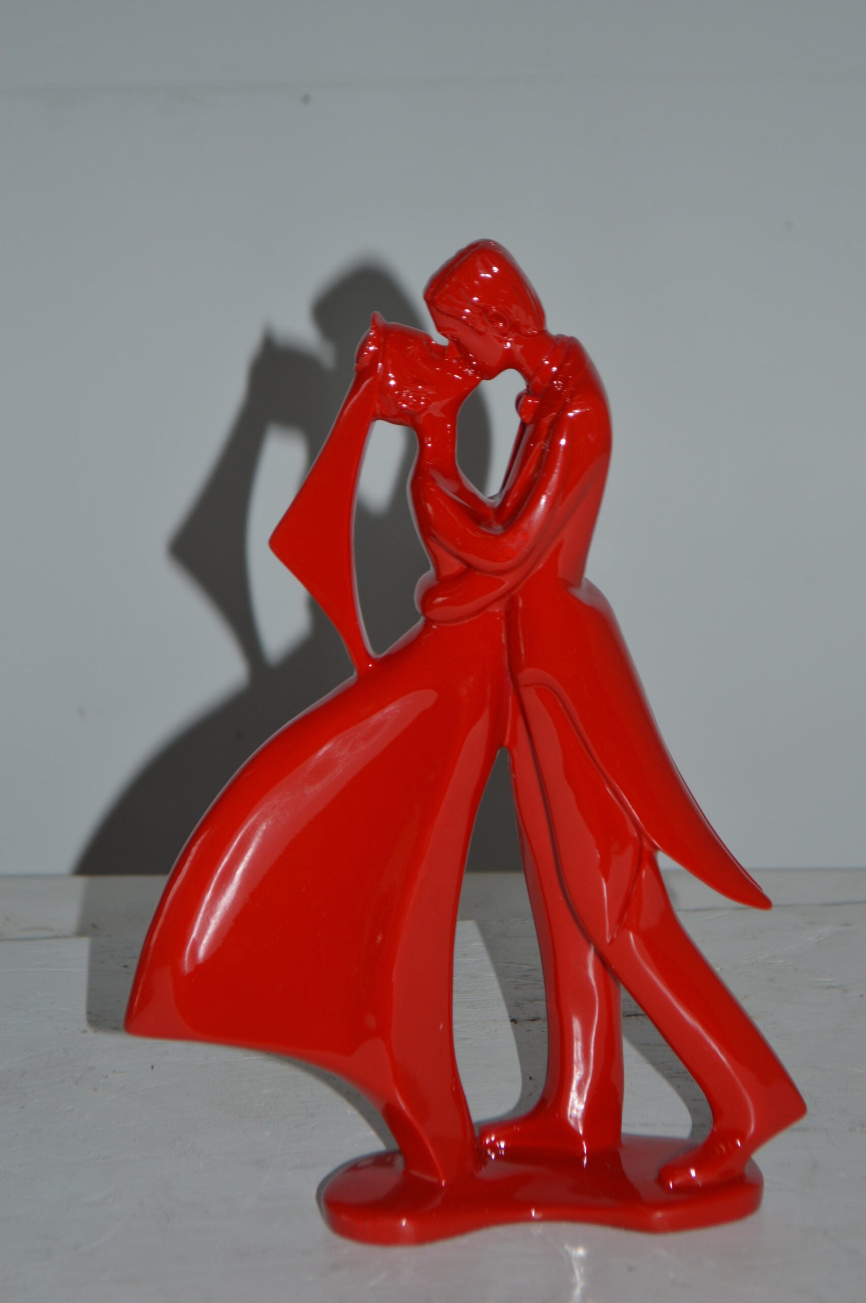 This modern art of the Bride and Groom dancing, is a small, beautiful resin statue colored red. The statue clearly is a work of art, illustrated by the medley of details from top to bottom. This small resin statue is a perfect fit for any home. Size: 3"L x 9"W x 12"H. Weight is: 1Lb