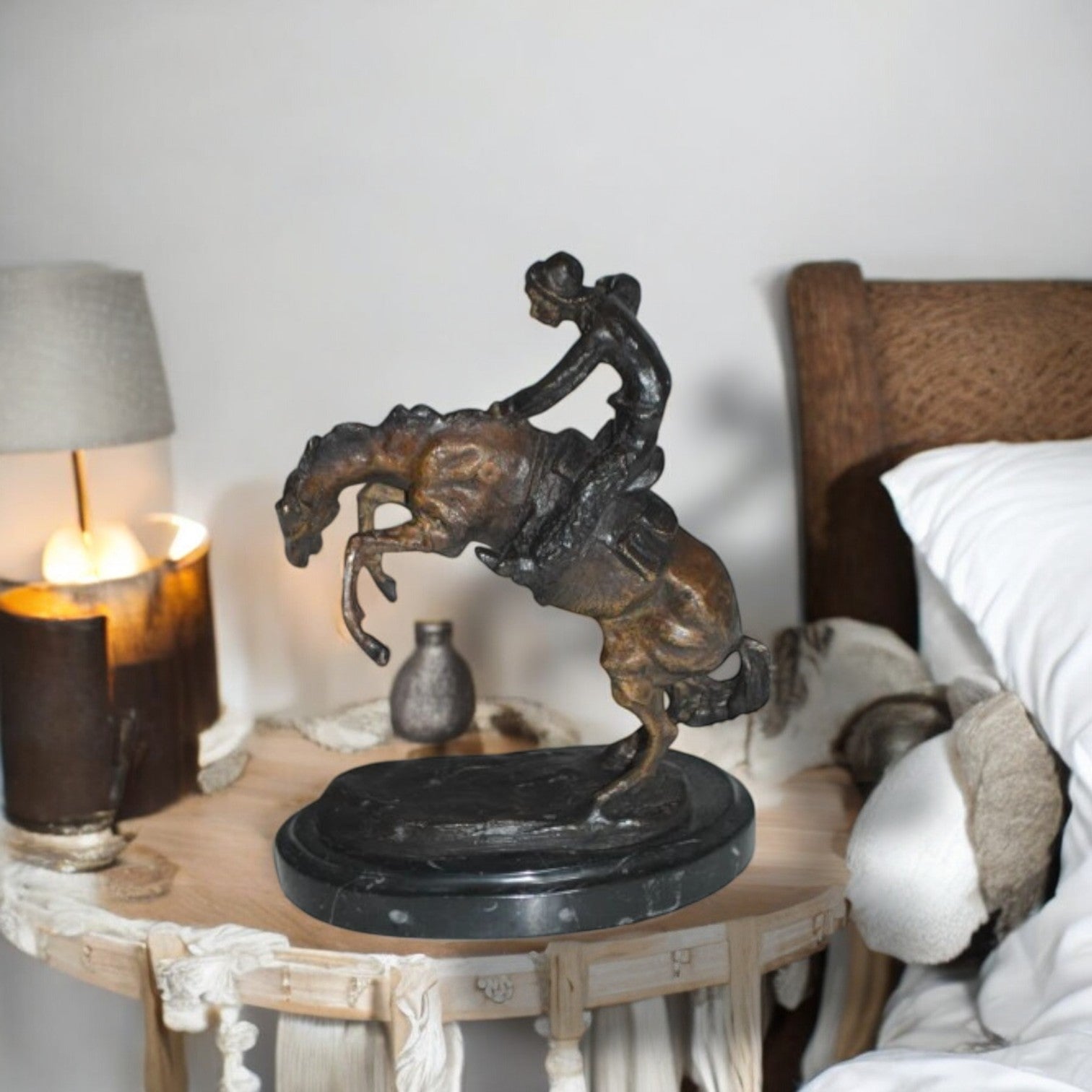 The Remington - inspired Bronze Statue / sculpture, "The Bronco Buster” is the world’s most famous piece of American art. Frederic Remington presented it as a gift to President Theodore Roosevelt. The Broncho buster was one of Frederic Remington’s first bronze sculpture. It has since come to symbolize all that is triumphant and heroic of the American west. The Broncho buster reflects Remington’s attention to detail, along with his ingenious rendering of intense movement combined with a delicate sense of balance. This 100% Bronze and Fully Handmade, Carefully Detailed sculpture was Cast Using the "Lost Wax Method" And Mounted on a Marble Base. Size: 3"L x 7"W x 10"H. Weight is: 4Lb