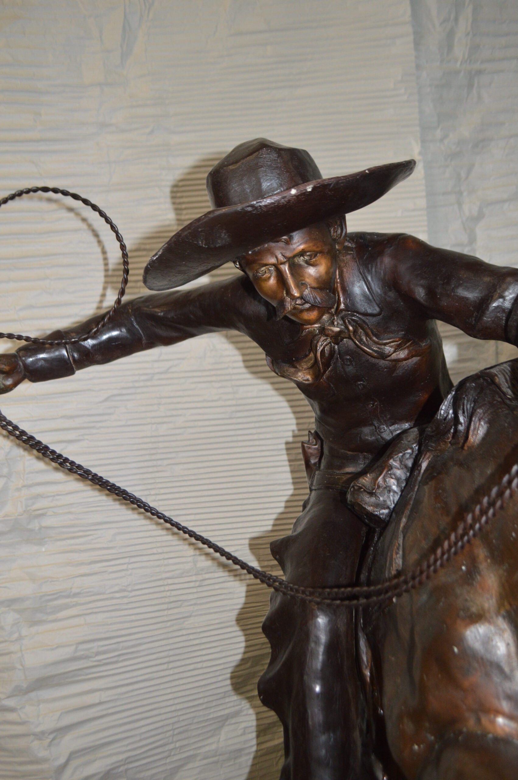 This Gain size Remington inspired Bronze Statue of The Bronco Buster is the world’s most famous piece of American art. Frederic Remington presented it as a gift to President Theodore Roosevelt. The Broncho buster was one of Frederic Remington’s first bronze sculpture. It has since come to symbolize all that is triumphant and heroic of the American west. The Broncho buster reflects Remington’s attention to detail, along with his ingenious rendering of intense movement combined with a delicate sense of balance. This 100% Bronze and Fully Handmade, Carefully Detailed Sculpture was Cast Using the "Lost Wax Method" And Mounted on a Marble Base. Size: 65"L x 52"W x 64"H. Weight is: 260Lb