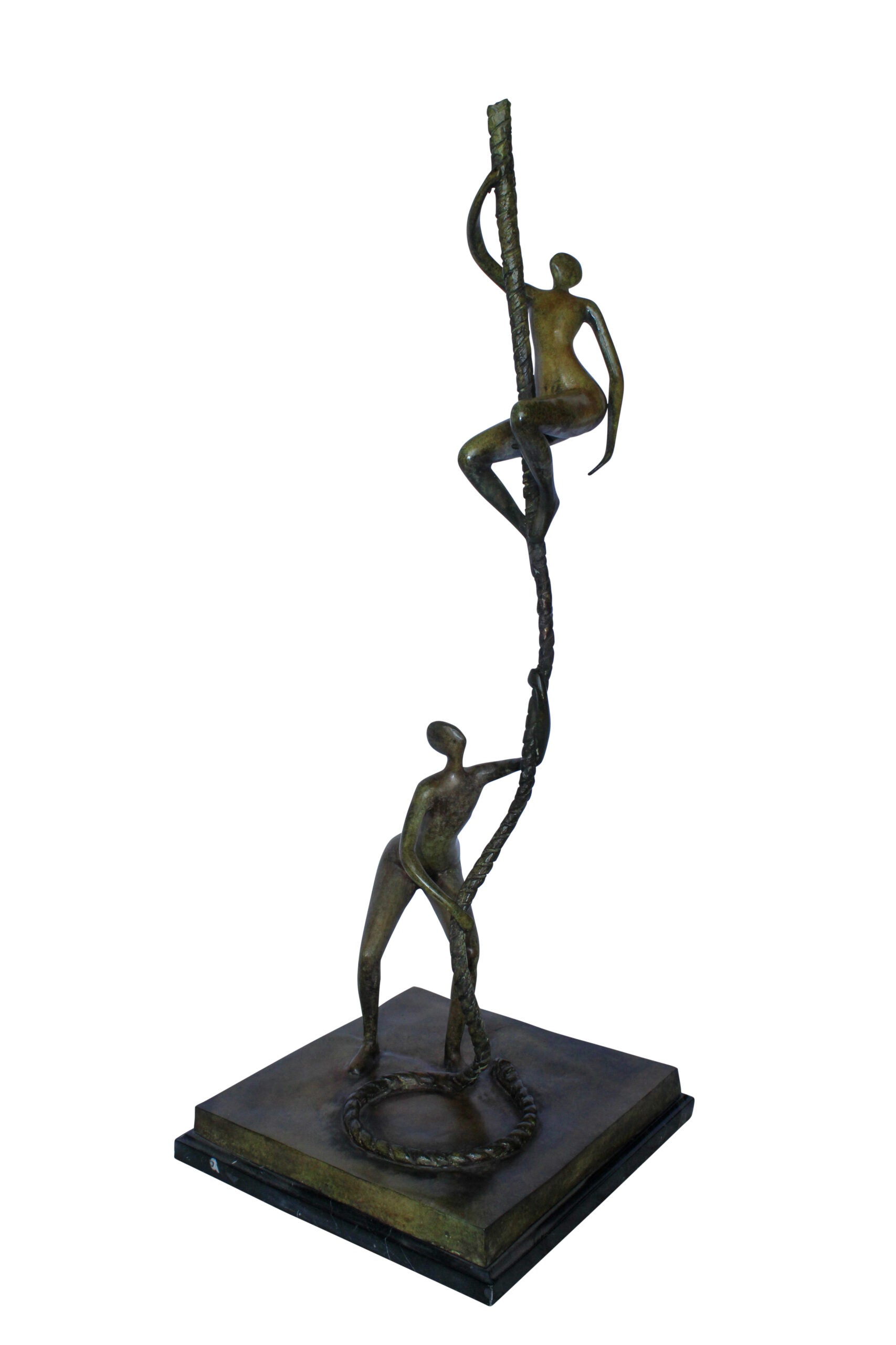 This bronze sculpture features two abstract figures climbing a long rope in a modern and dynamic pose. Crafted using the traditional lost wax casting method, it showcases fine detail and balance. Perfect for modern art lovers or office display, this piece rests on a solid base and draws attention with its vertical motion and elegant form. Size: 14"L x 14"W x 38"H. Weight: 39Lb