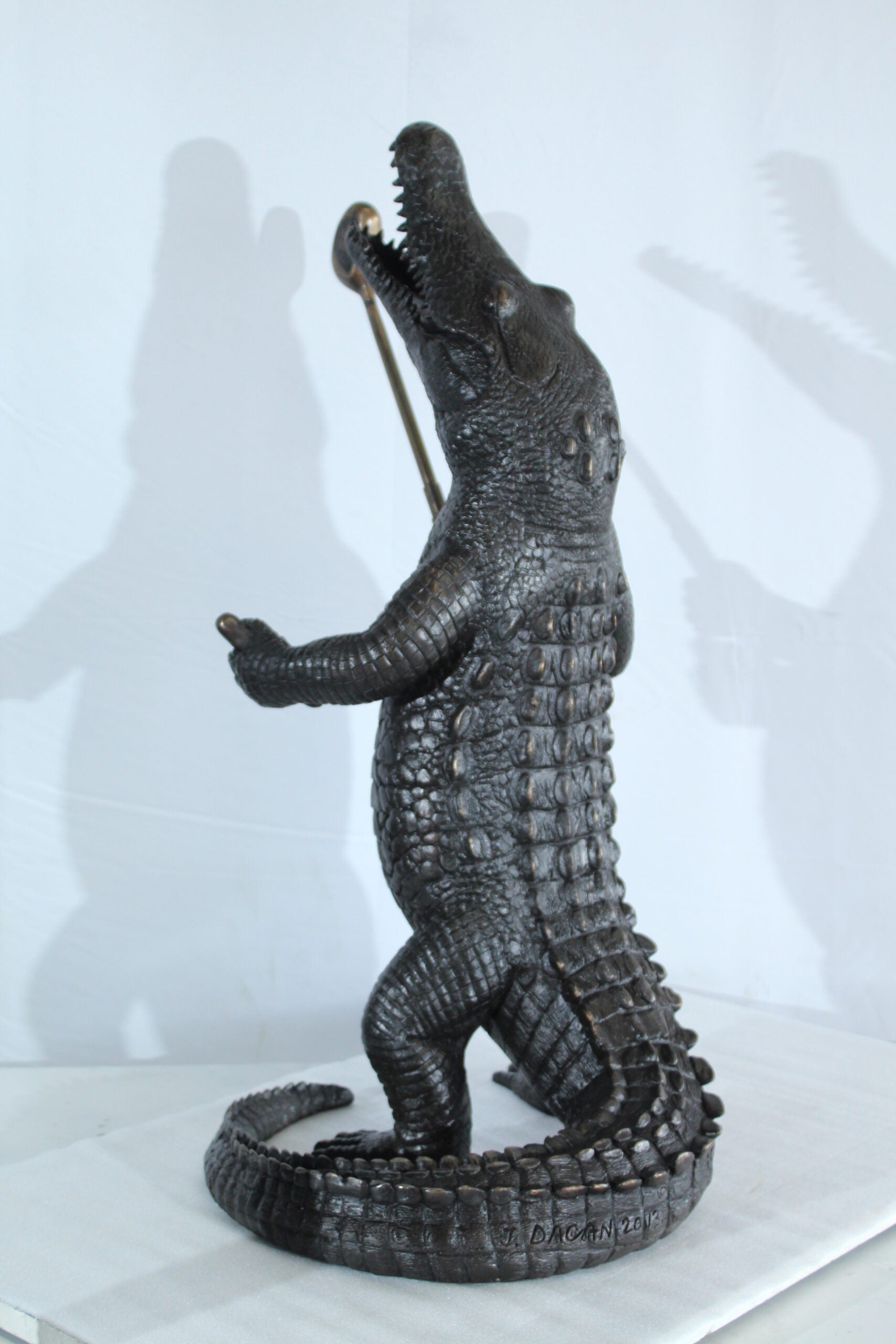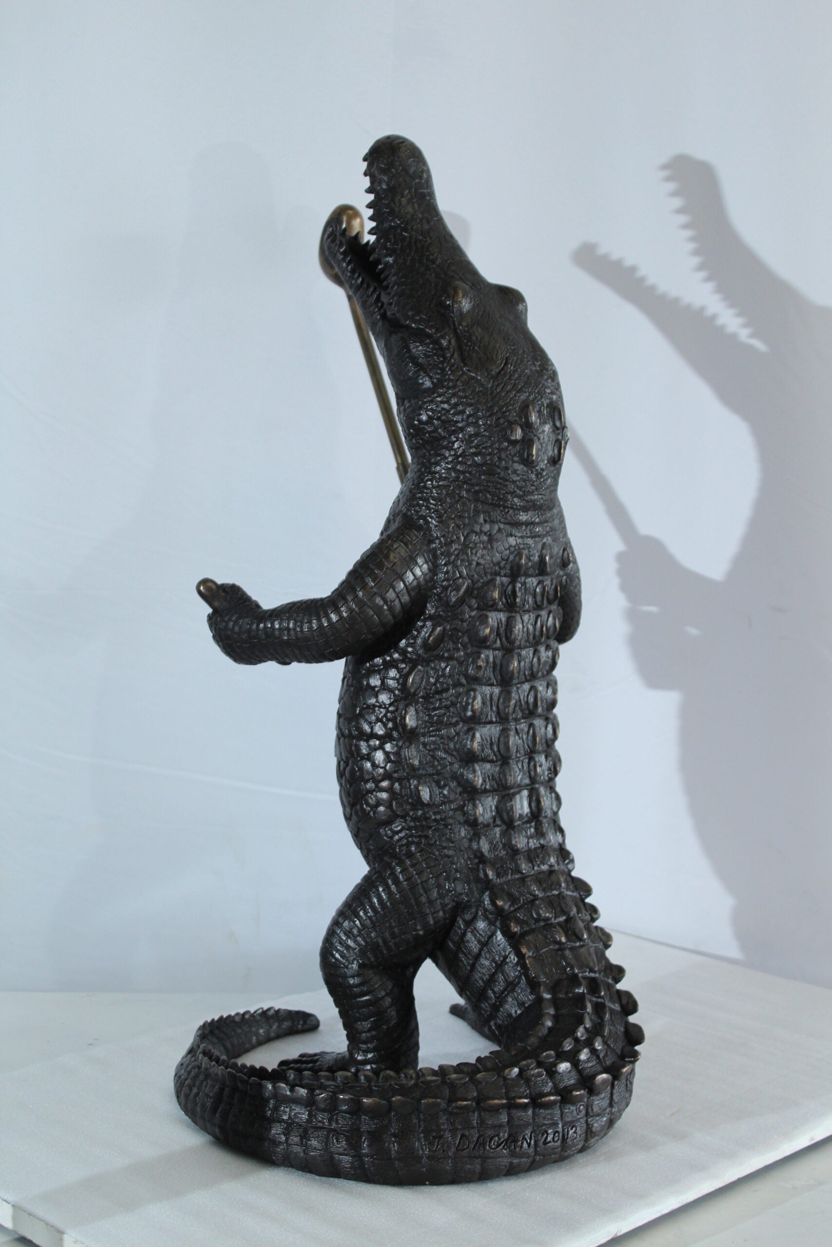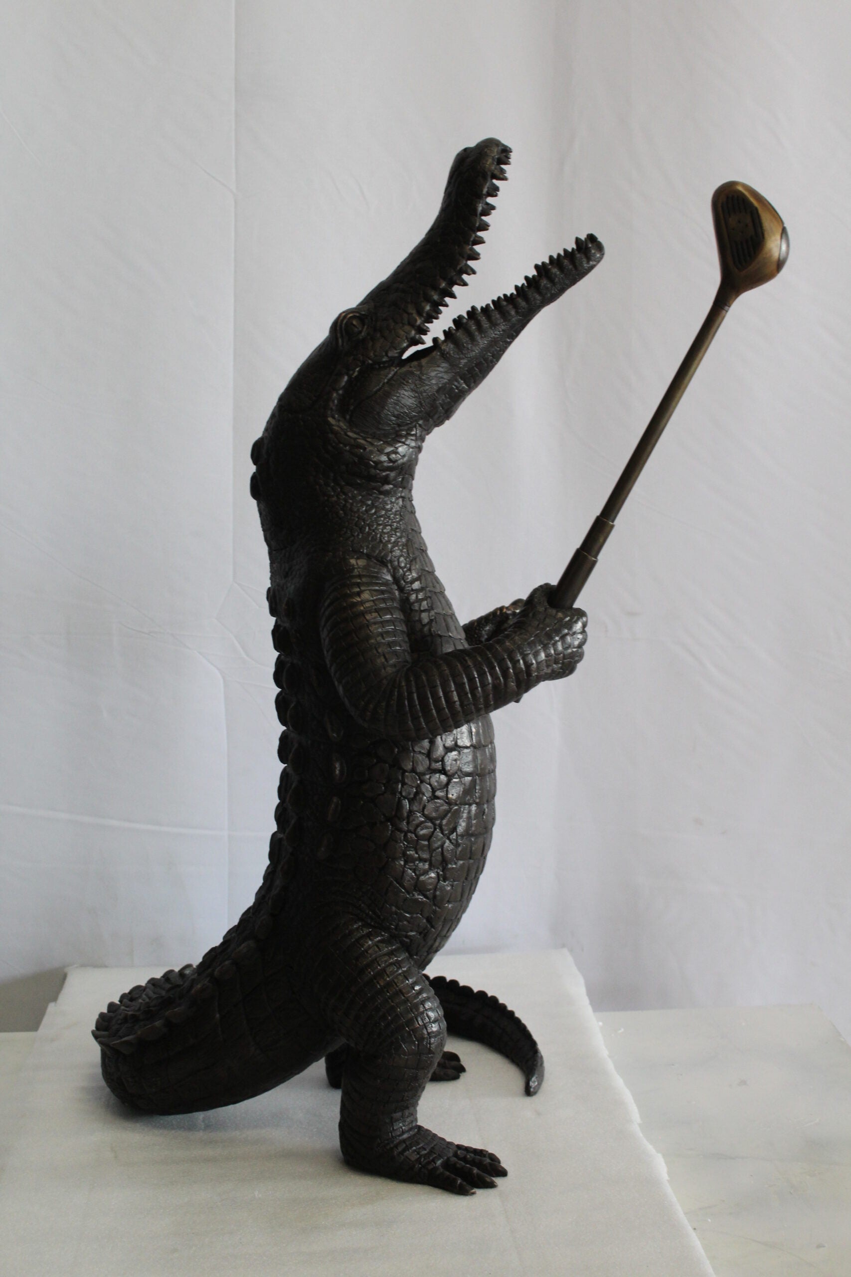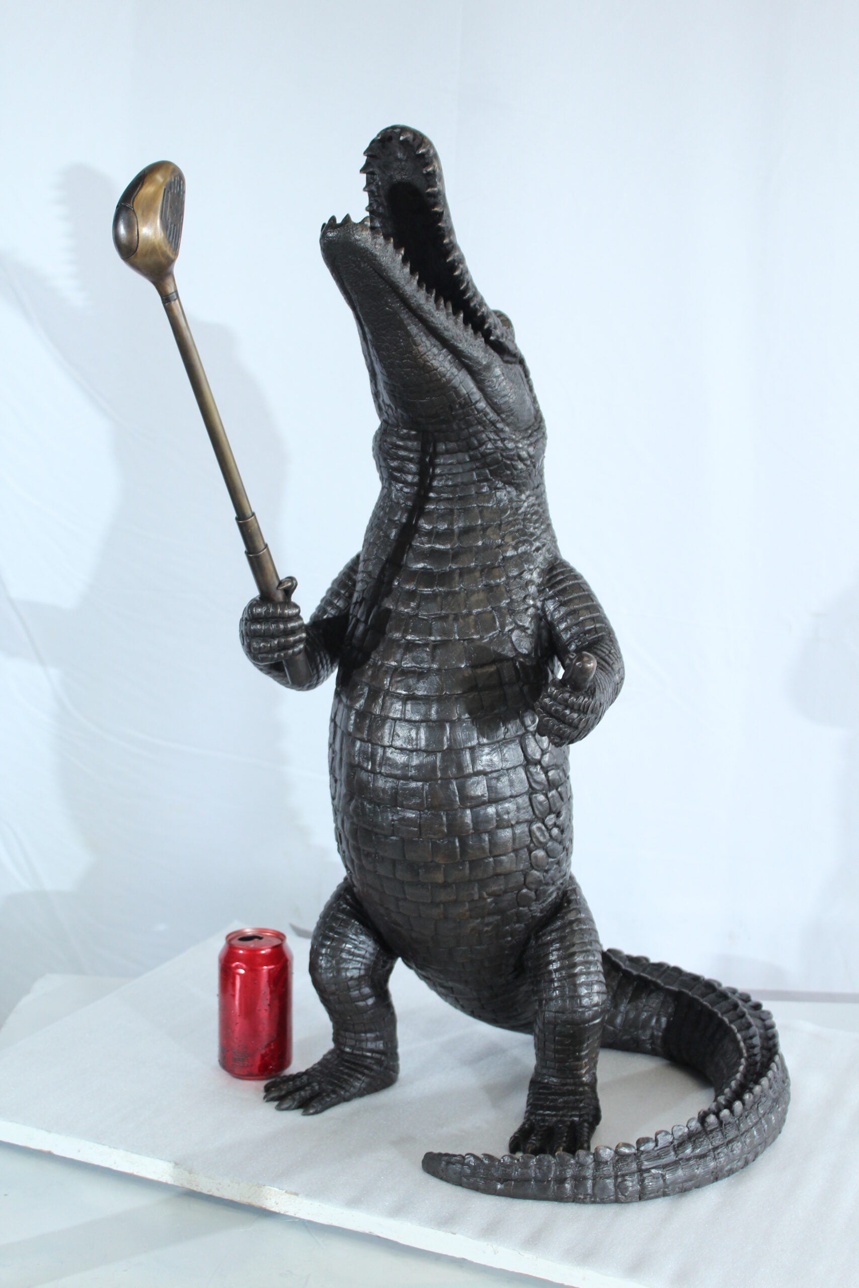 This eye-catching bronze statue features a standing alligator having fun, confidently holding a golf club in one hand and a cigar in the other. Crafted with remarkable detail, this whimsical sculpture adds charm and character to any golf club, or outdoor patio. A unique piece that blends humor with fine art, perfect for golf enthusiasts and collectors alike. Size: 19"L x 23"W x 36"H. Weight: 45Lb
