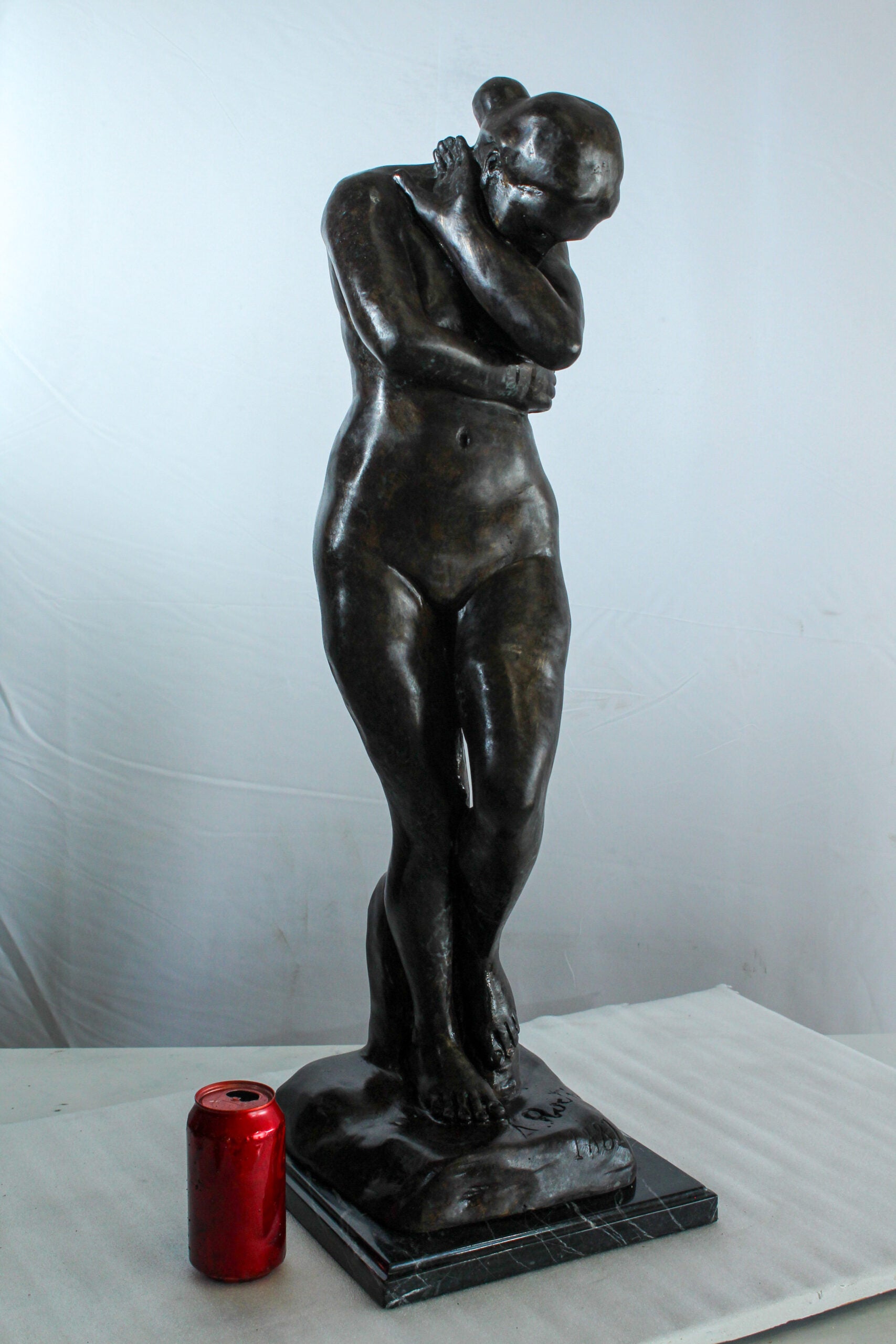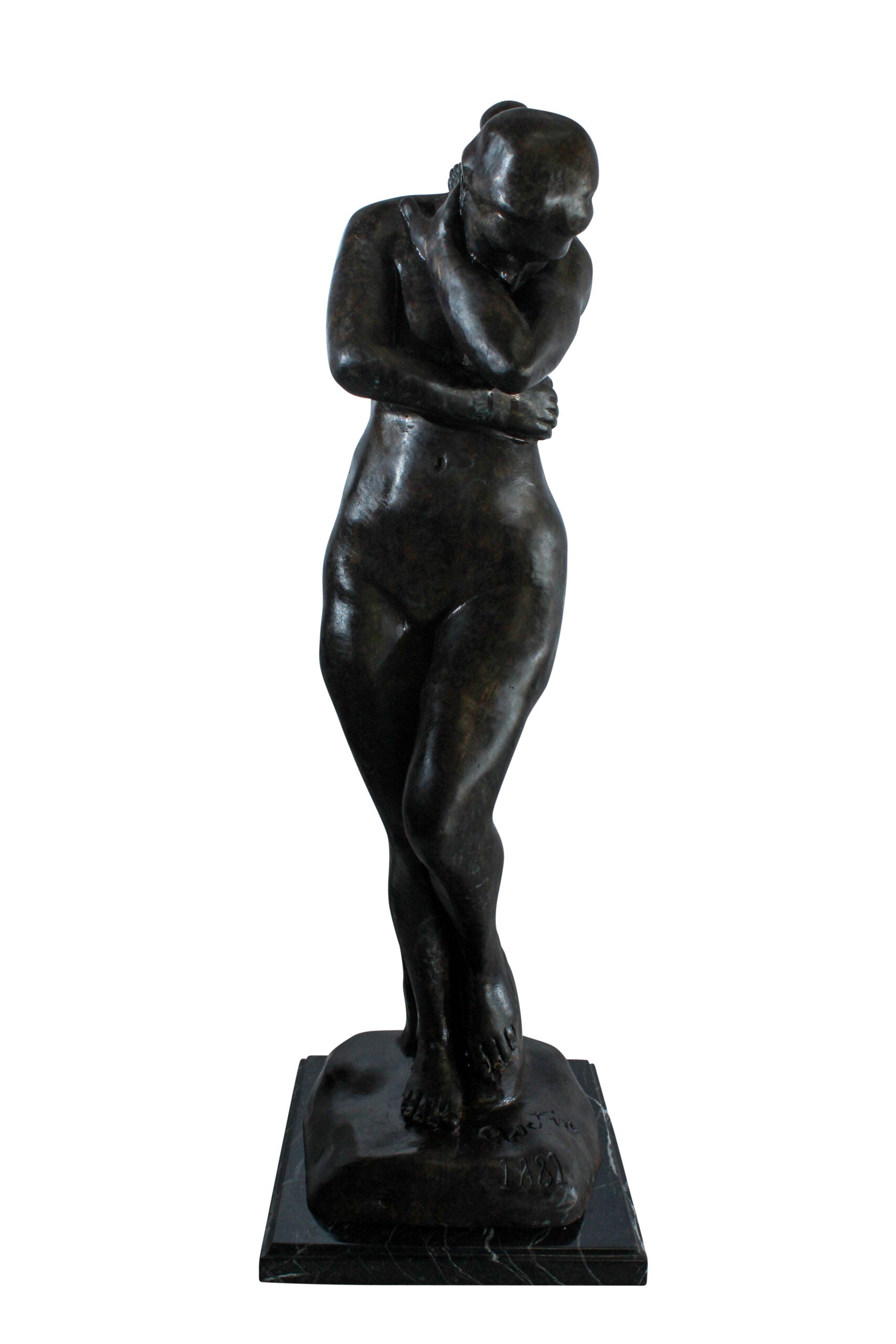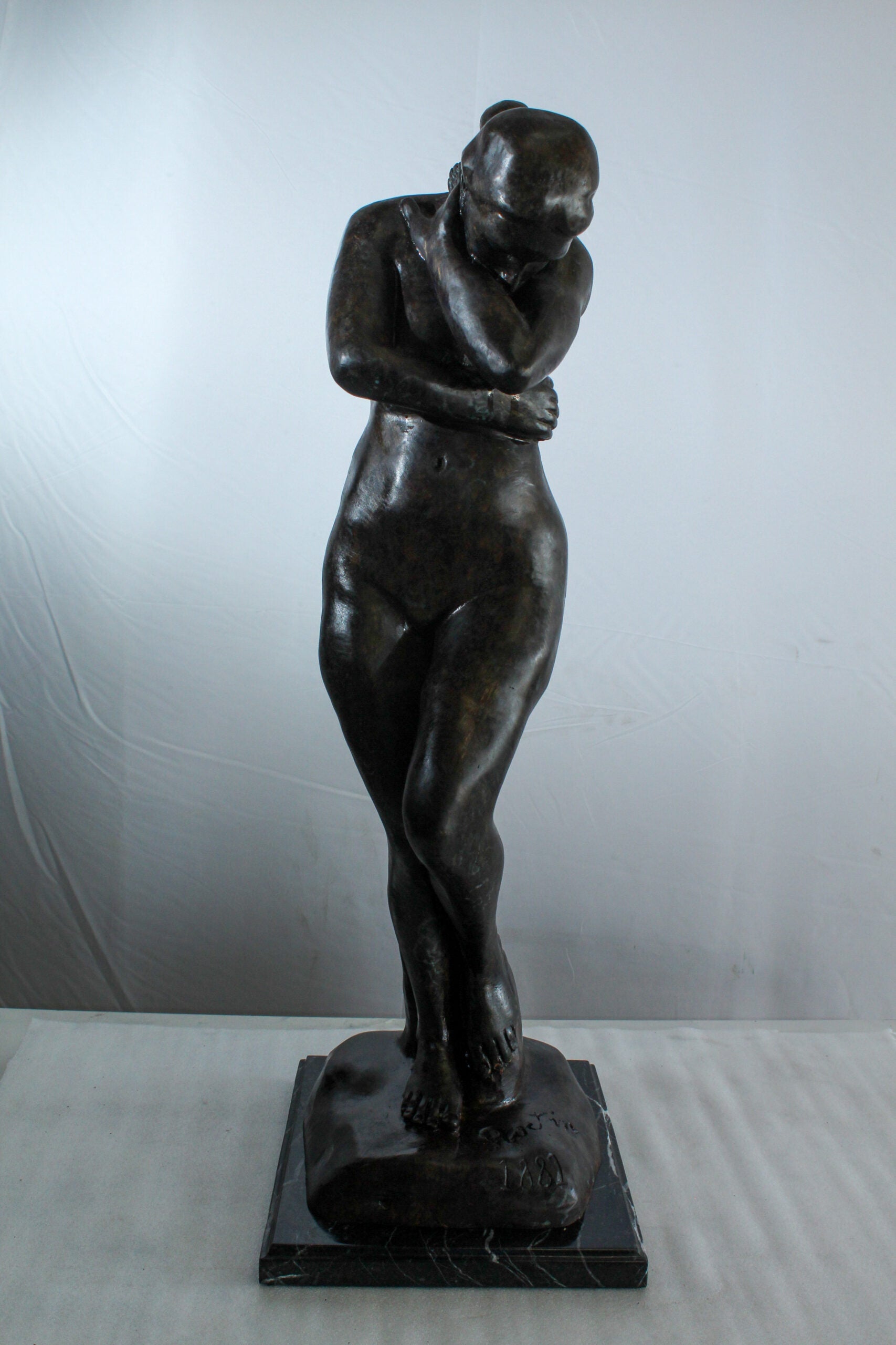 This elegant bronze sculpture depicts a nude woman in a shy, introspective pose with arms crossed and head lowered. A faithful replica of Auguste Rodin’s emotional style, the statue is cast using the lost wax method and mounted on a polished marble base. Its soft curves and expressive stance make it a timeless addition to classical art collections or sophisticated interior displays. A tribute to feminine beauty and artistic form. Size: 12"L x 11"W x 32"H. Weight: 31Lb
