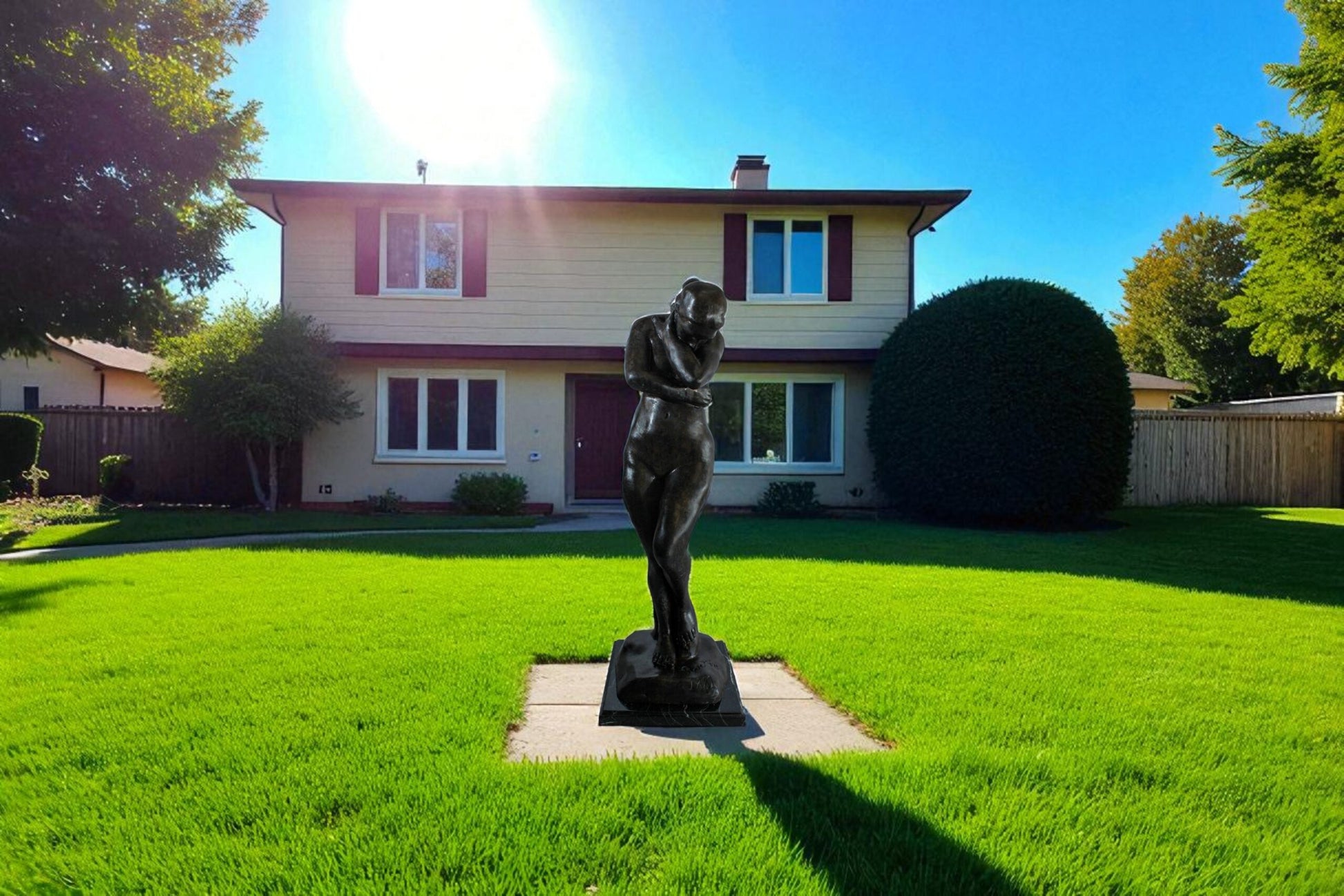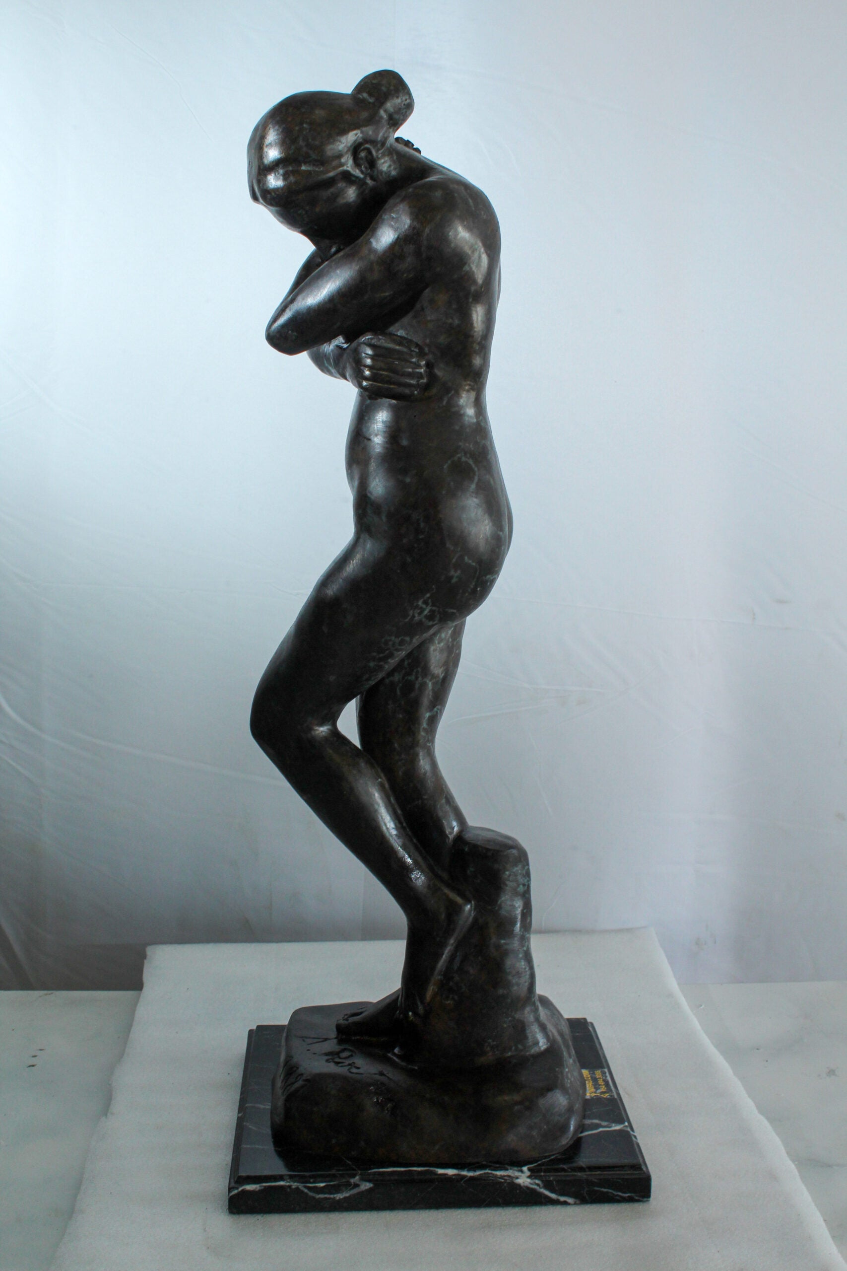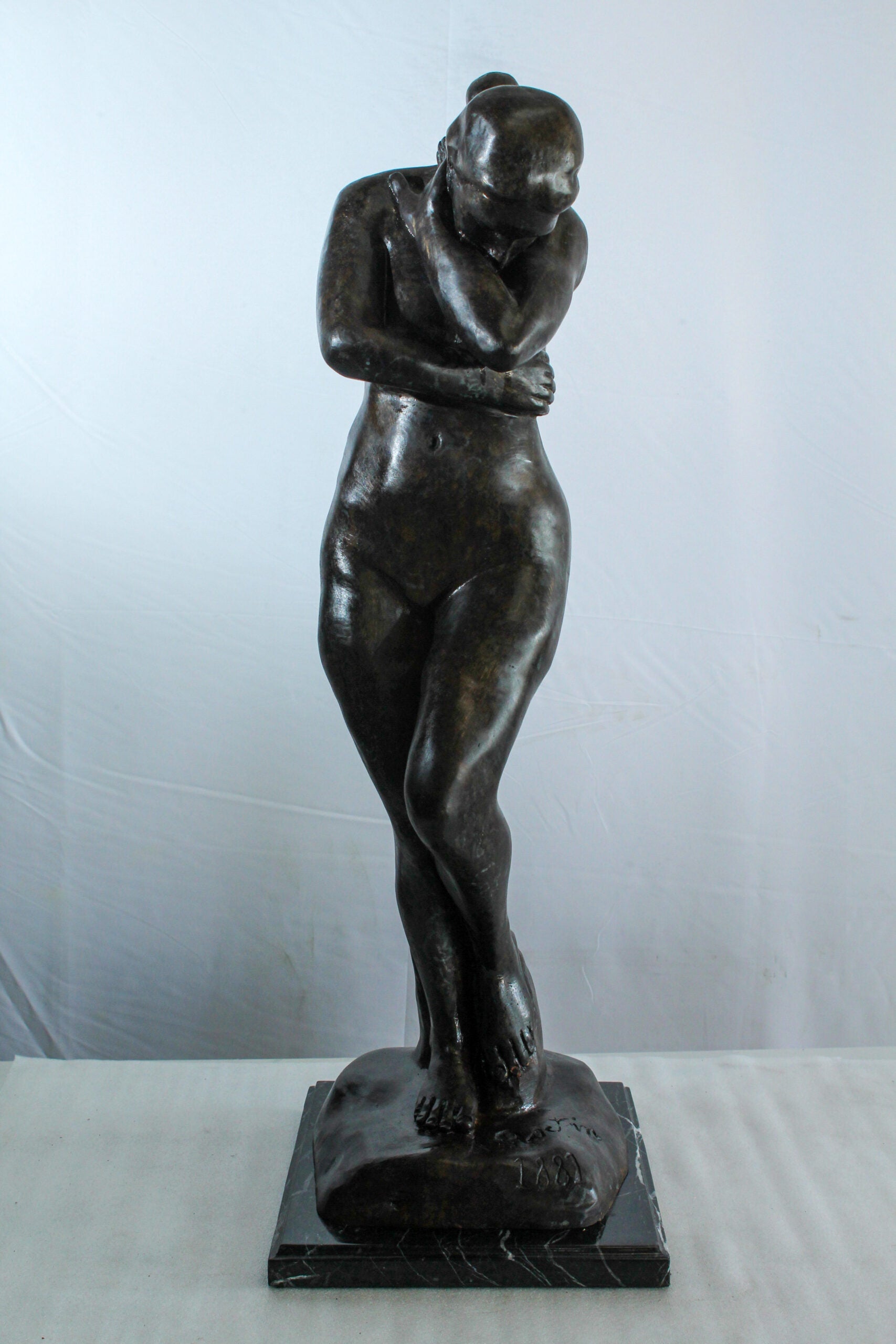 This elegant bronze sculpture depicts a nude woman in a shy, introspective pose with arms crossed and head lowered. A faithful replica of Auguste Rodin’s emotional style, the statue is cast using the lost wax method and mounted on a polished marble base. Its soft curves and expressive stance make it a timeless addition to classical art collections or sophisticated interior displays. A tribute to feminine beauty and artistic form. Size: 12"L x 11"W x 32"H. Weight: 31Lb