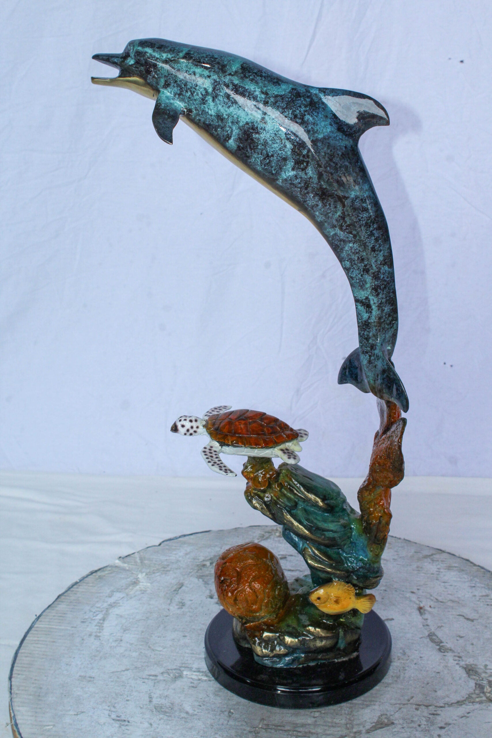 This delightful bronze sculpture captures a playful dolphin leaping above a colorful coral reef with a sea turtle and tropical fish below. Rich patina and polished details bring this ocean scene to life. A soda can beside it shows its charming display size. Perfect for coastal homes, marine lovers, or artistic decor accents. Size: 8"L x 13"W x 25"H. Weight: 14Lb