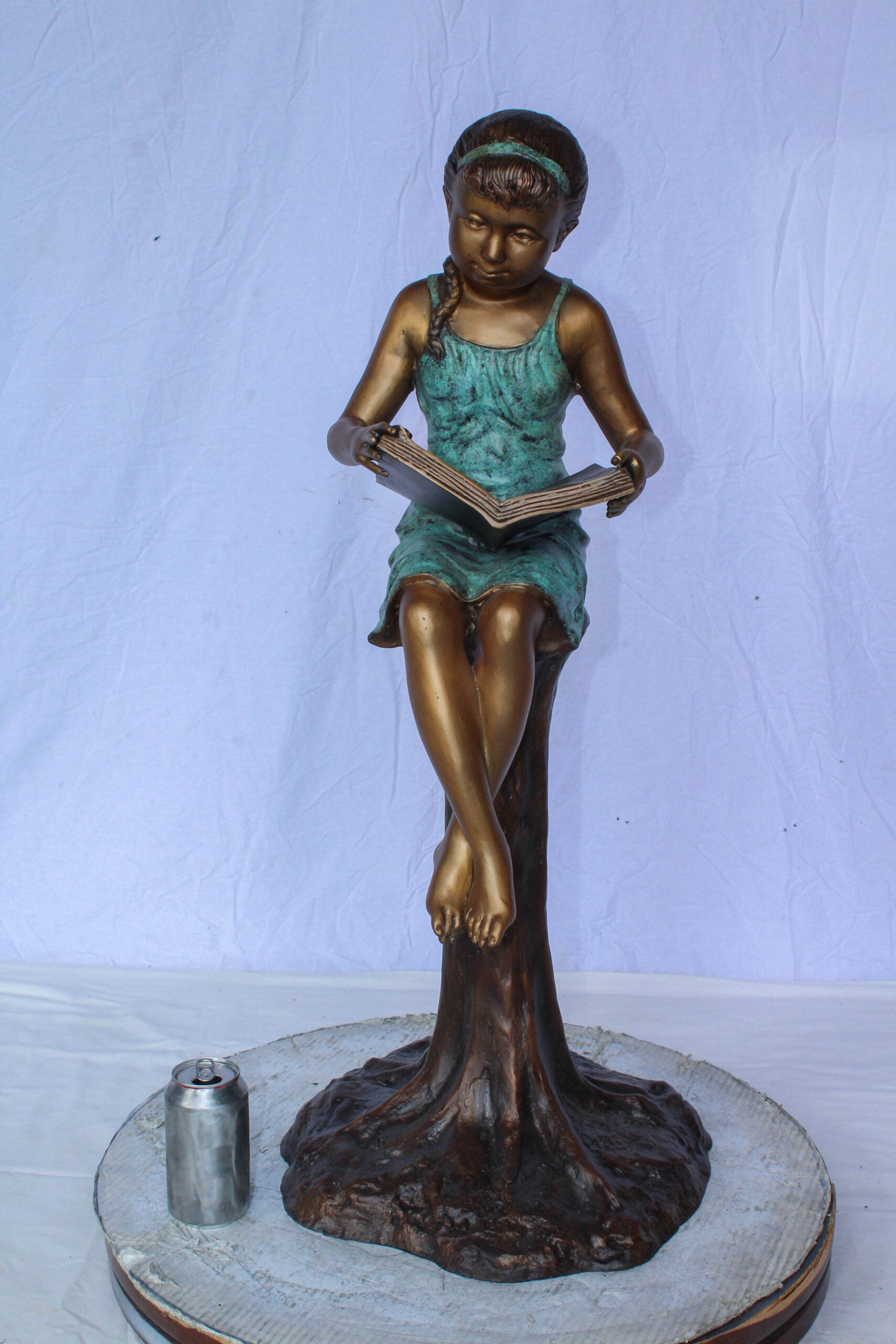 Beautiful bronze statue depicting a young girl sitting on a tree stump, deeply focused on a book in her hands. This charming piece features a rich bronze patina with a contrasting turquoise dress, evoking both warmth and curiosity. The detailed craftsmanship makes it a perfect decor item for libraries, schools, or children's areas. A thoughtful gift for readers and educators. Size: 14"L x 15"W x 34"H. Weight: 24Lb