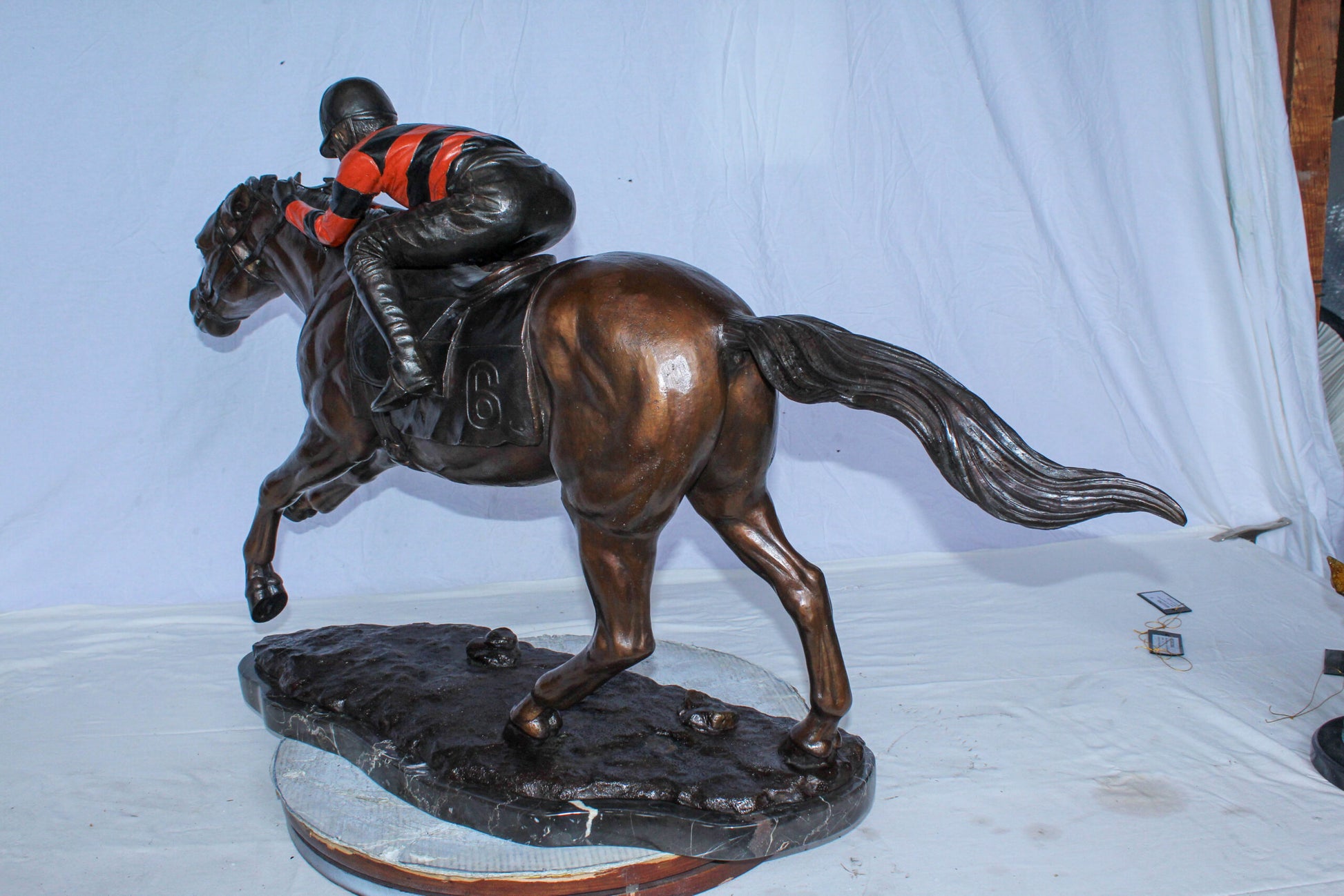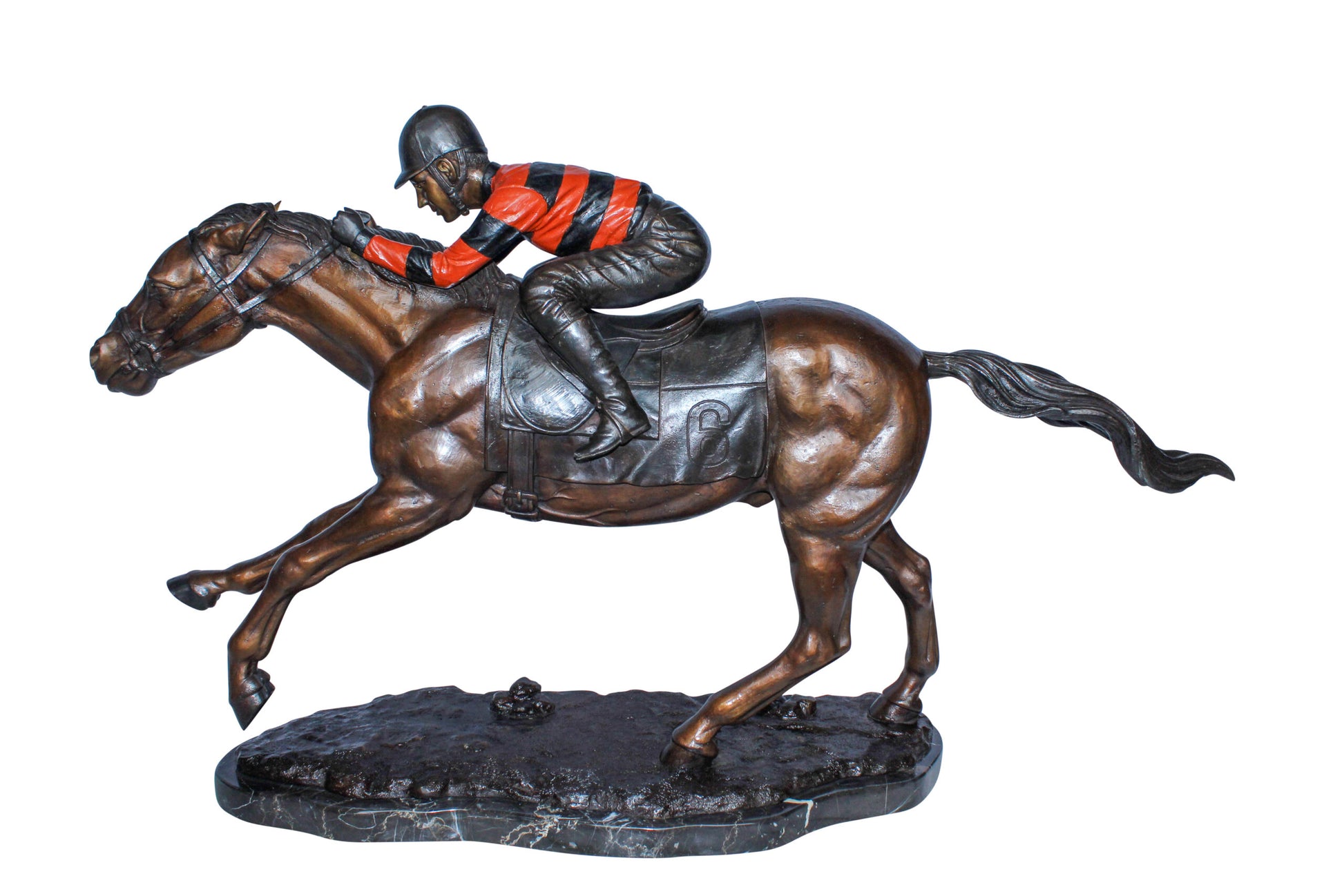 This dynamic bronze horse racing statue captures the speed and intensity of a jockey in mid-race. Crafted using the traditional lost wax method, the piece features a powerful racehorse and detailed rider in a vibrant red and black striped uniform. Set on a black marble base, this sculpture is ideal for equestrian enthusiasts, race fans, or fine art collectors seeking a striking centerpiece. Size: 50"L x 14"W x 29"H. Weight: 126Lb