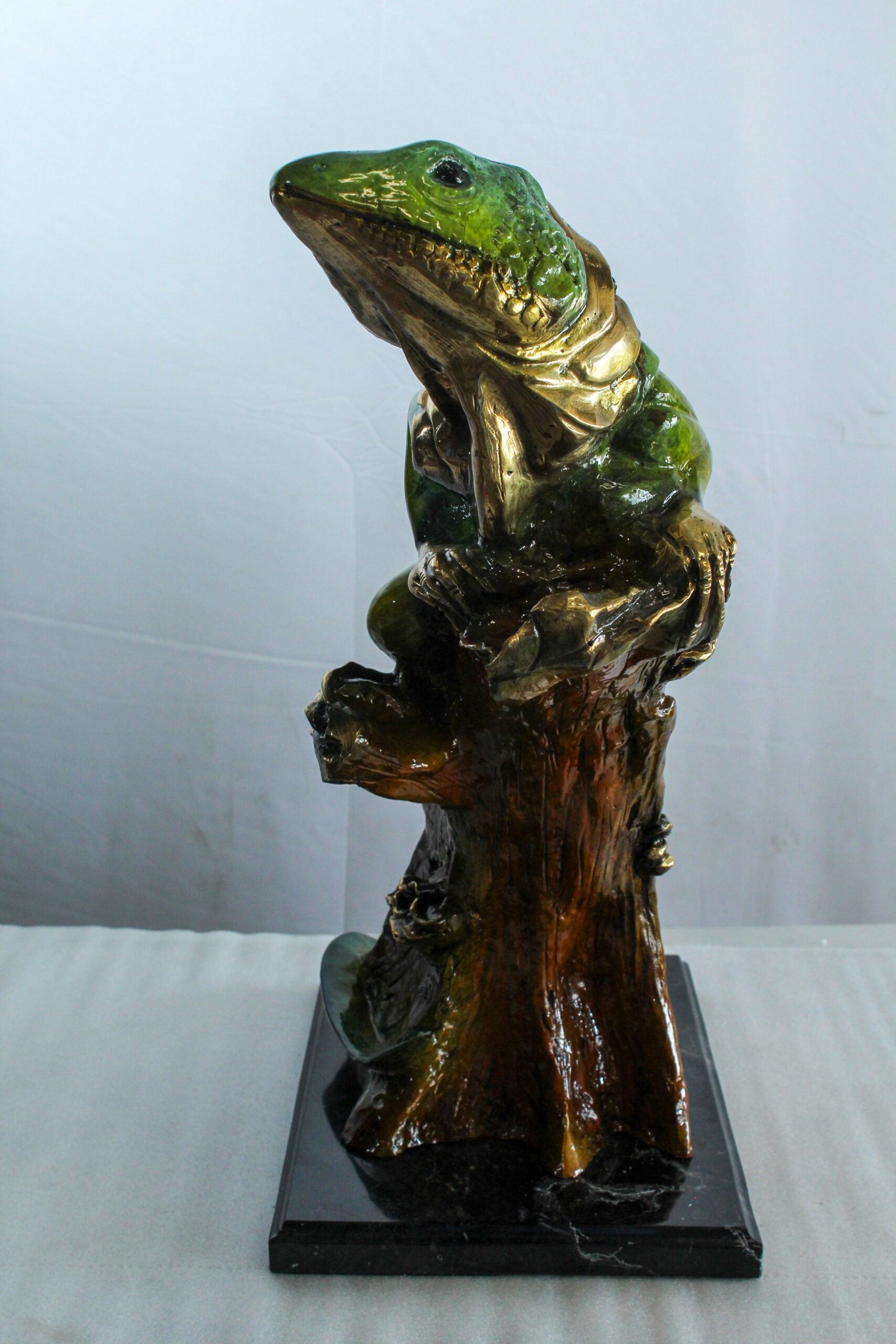 This vibrant bronze iguana sculpture captures the lifelike posture of the reptile perched on a textured tree trunk. The piece features rich green and gold patina details and is cast using the traditional lost wax method. Mounted on a polished marble base it combines realism with elegance making it perfect for wildlife enthusiasts collectors or tropical-themed interiors. A bold artistic statement for any room or display. Size: 20"L x 7"W x 22"H. Weight: 37Lb