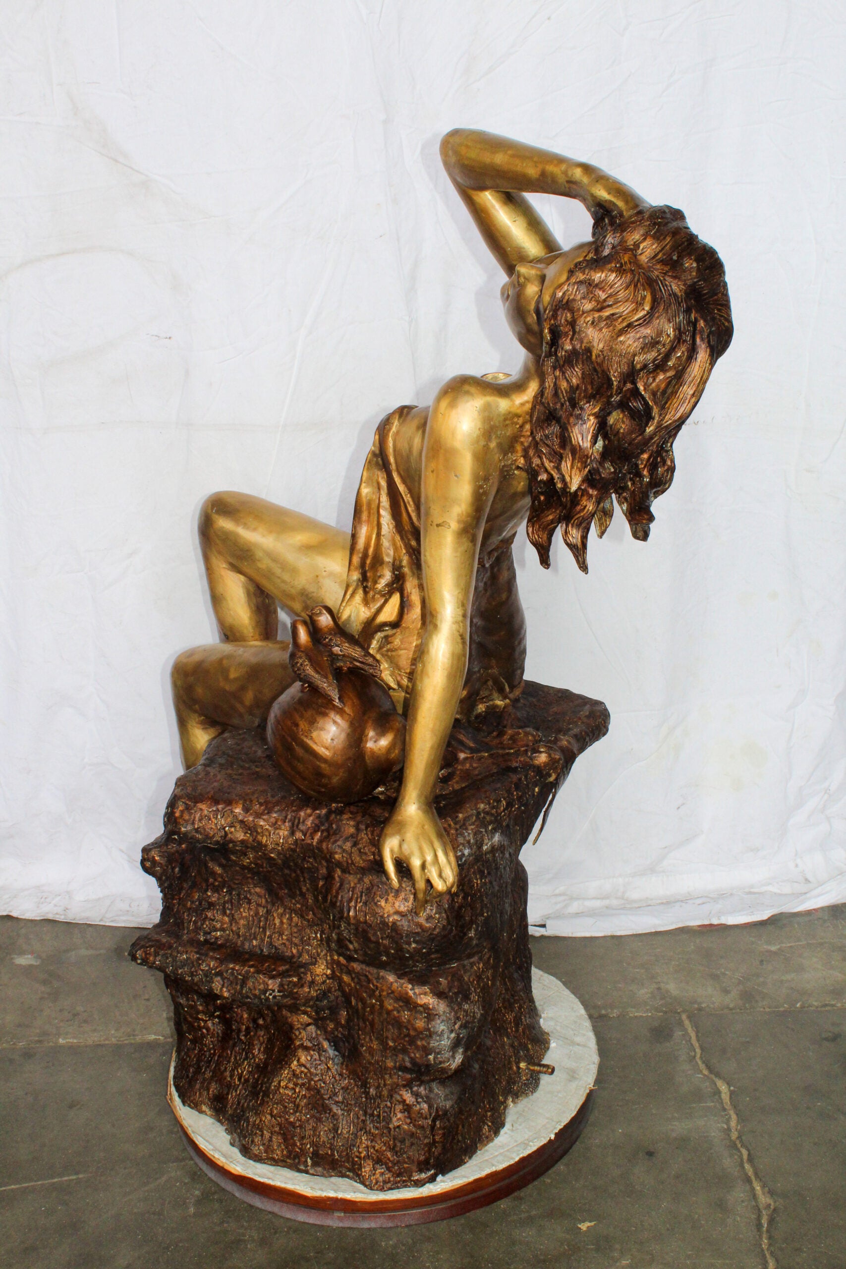 This bronze outdoor fountain features a serene woman relaxing on rocks, handcrafted and cast using the traditional lost wax method. The detailed design captures the tranquility of the scene, making it an ideal addition to any garden or outdoor space. Water flows gracefully, creating a soothing ambiance. A stunning piece that blends art with nature. Size: 49"L x 39"W x 50"H. Weight: 155Lb