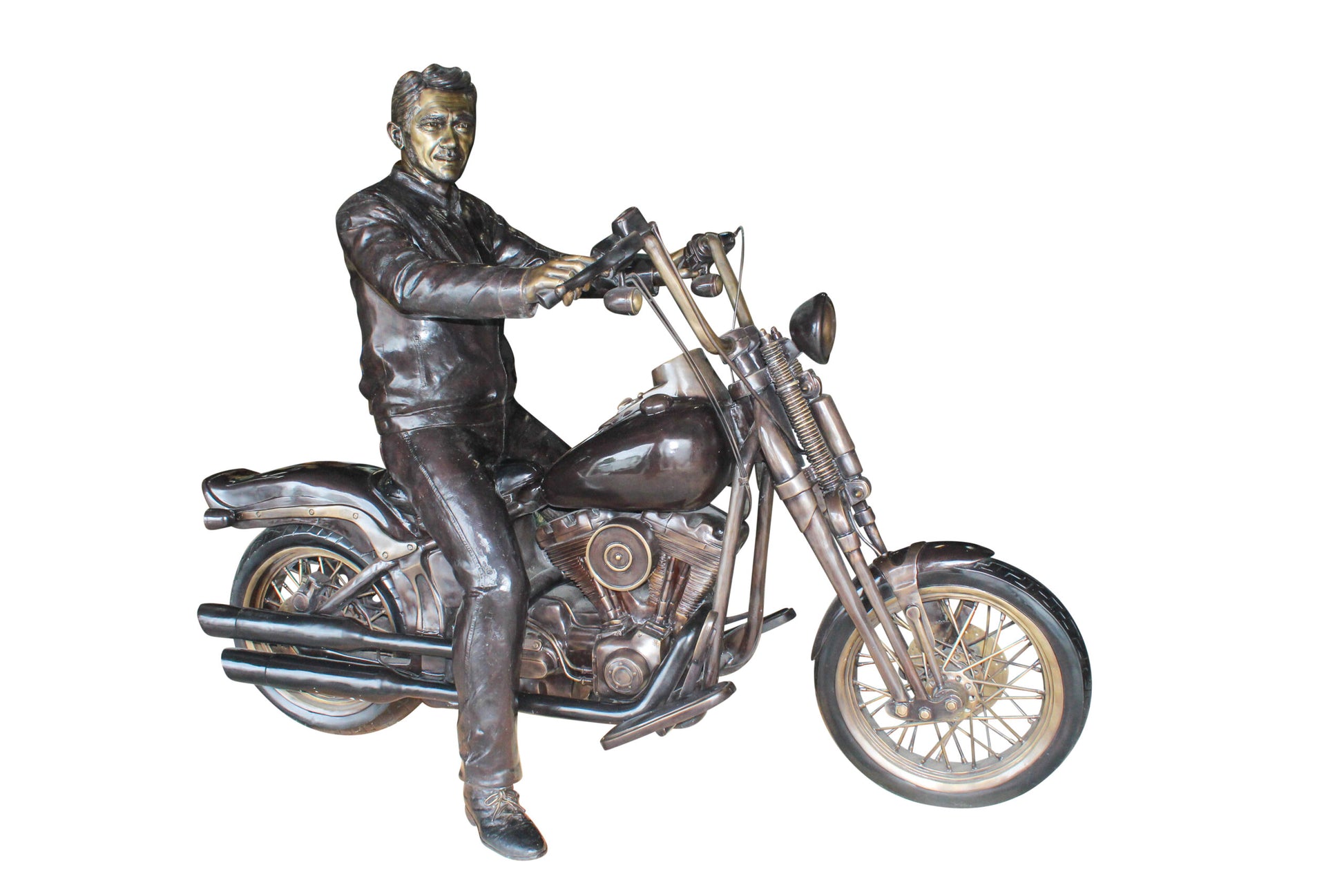 This detailed bronze statue features a man riding a classic motorcycle, crafted in full life size. The sculpture is ideal for themed spaces, showrooms, or collectors who appreciate vintage motorcycles and artistic metalwork. Made from high-quality bronze, it offers impressive realism and a bold presence in any setting. Size: 94"L x 50"W x 72"H. Weight: 689Lb